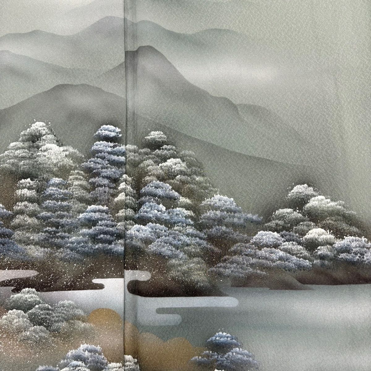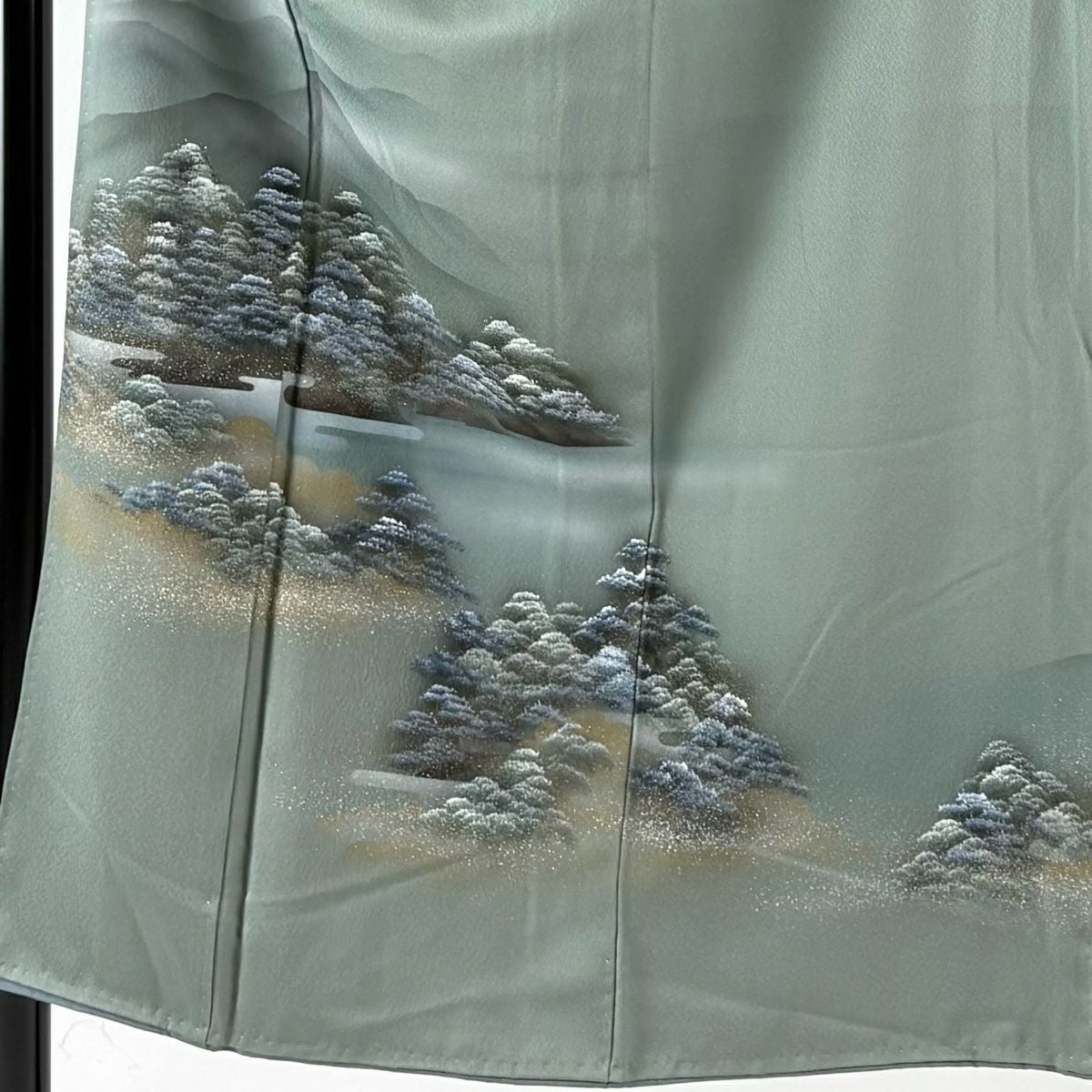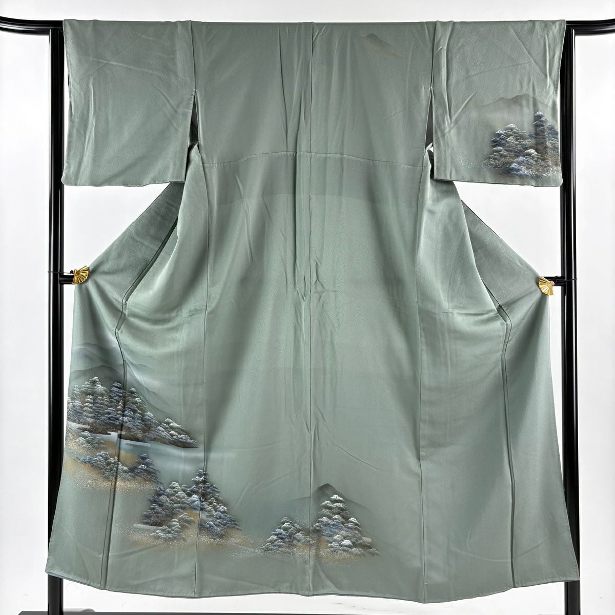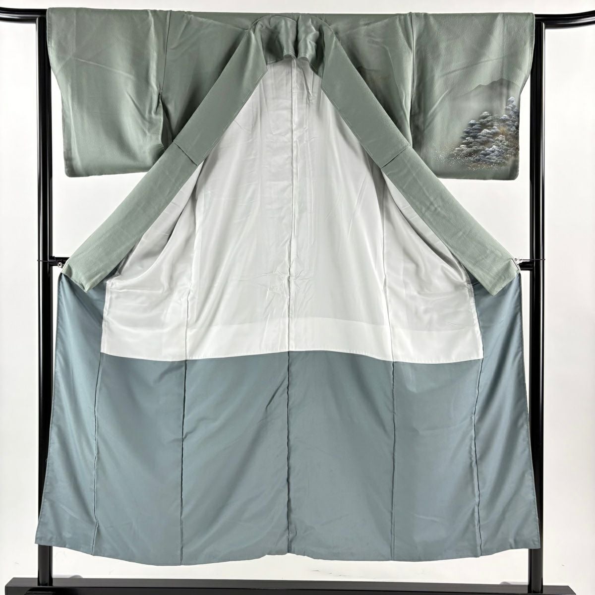 訪問着 身丈163.5cm 裄丈62.5cm S 袷 紬地 落款あり 松 鶴 金彩 ぼかし 青灰色 正絹 秀品 一つ紋
