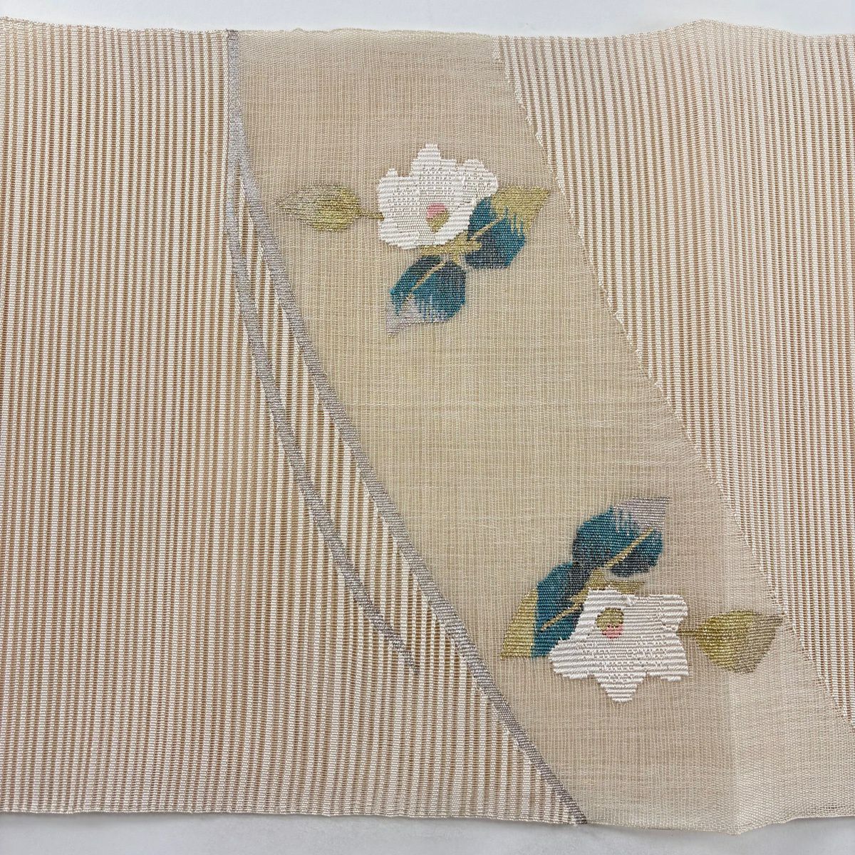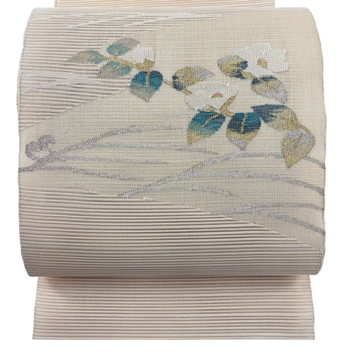 30%OFF 【美品】 名古屋帯 秀品 夏帯 絽 八寸名古屋帯 松葉仕立て 椿 霞 金銀糸 ベージュ 正絹 K30