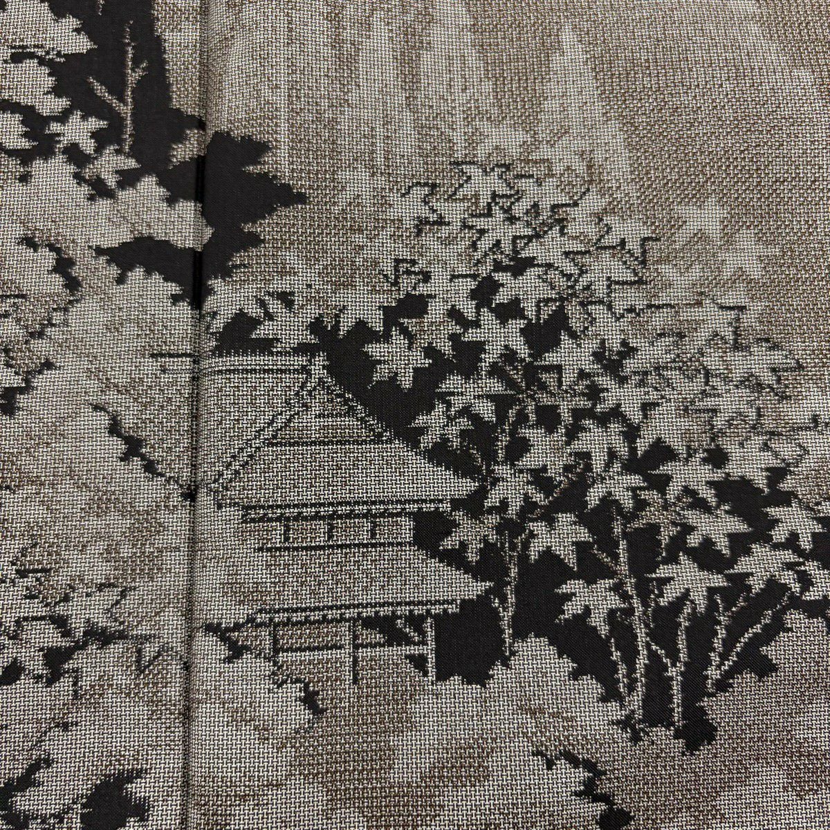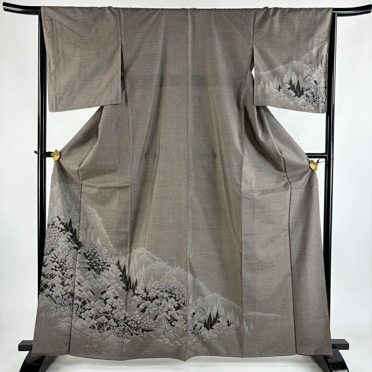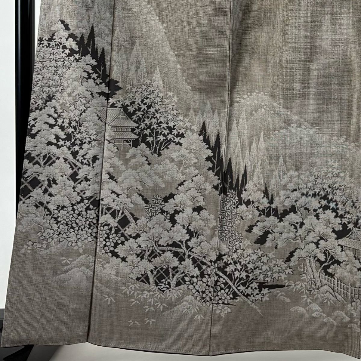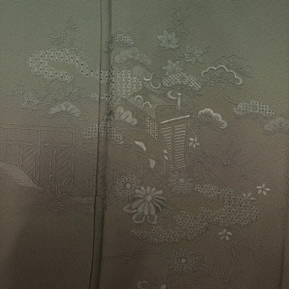 30%OFF 付下げ 身丈163cm 裄丈64cm M 袷 松島の風景 樹木 刺繍 縮緬 灰茶 正絹 秀品 K30