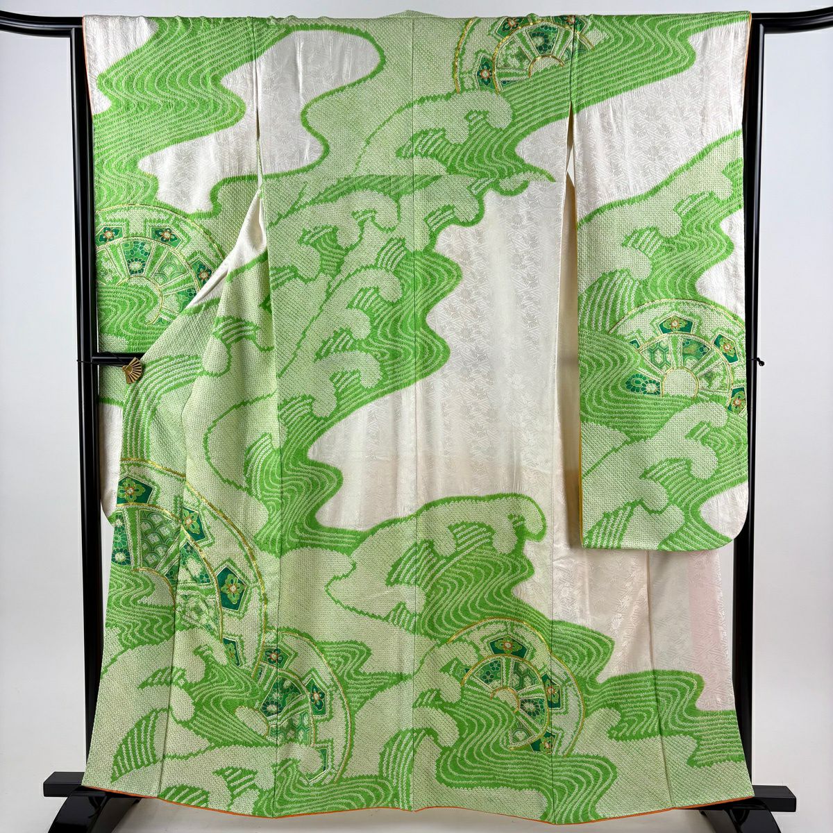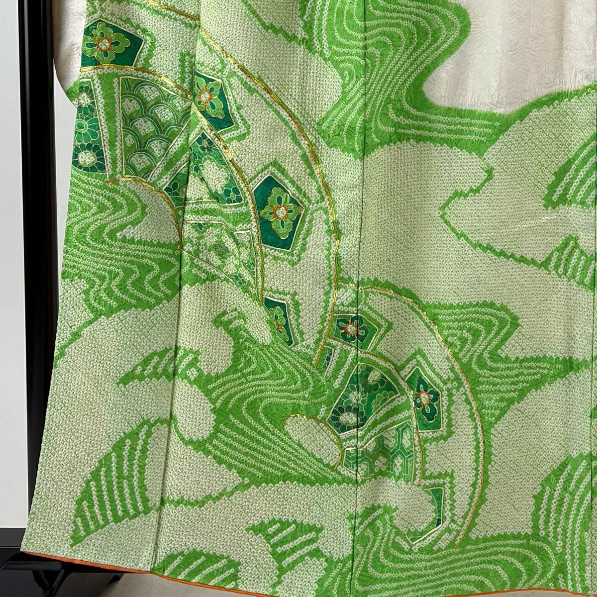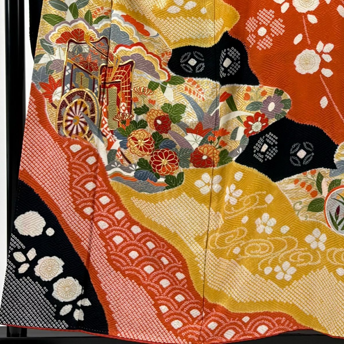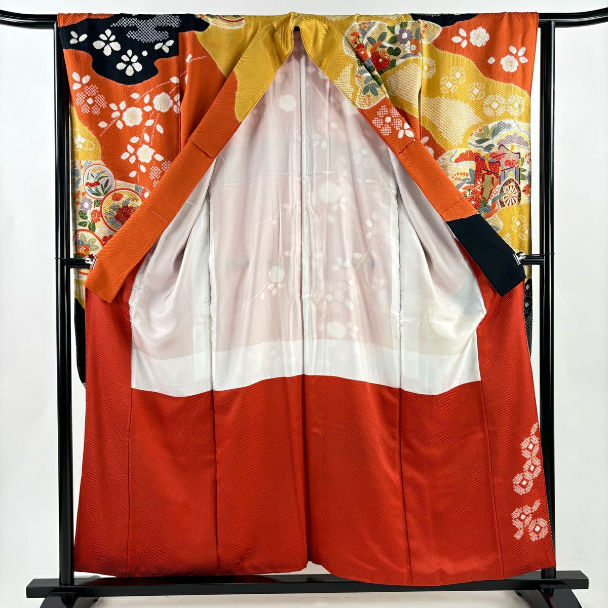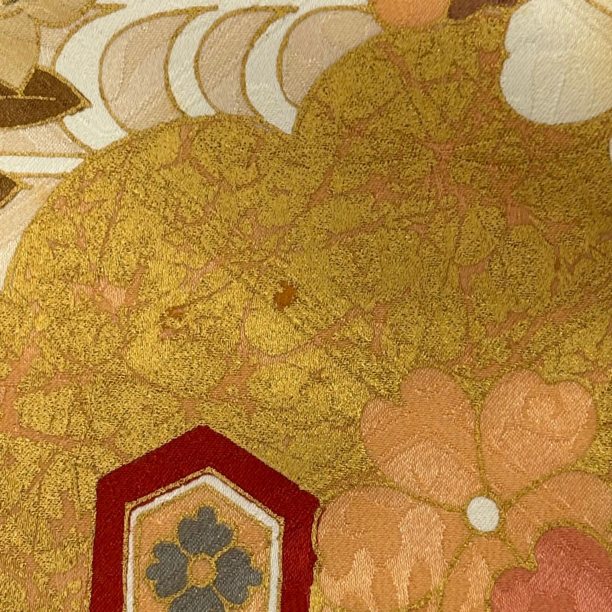 30%OFF 振袖 身丈159.5cm 裄丈66.5cm M 袷 扇面 橘花 金糸 金彩 オレンジ 正絹 秀品 K30