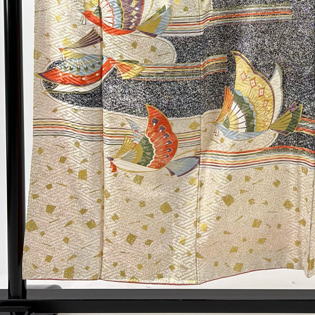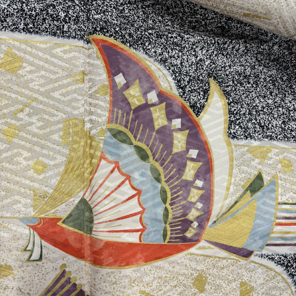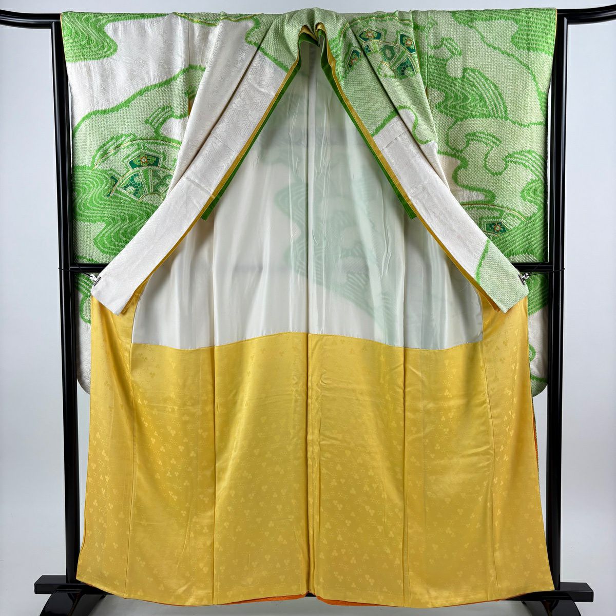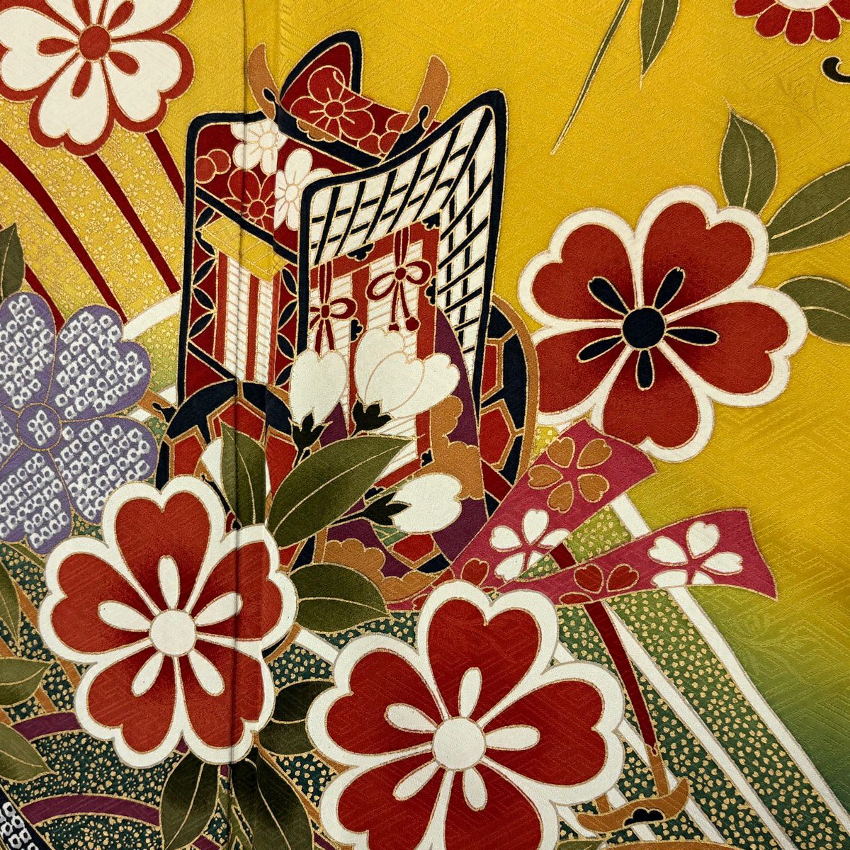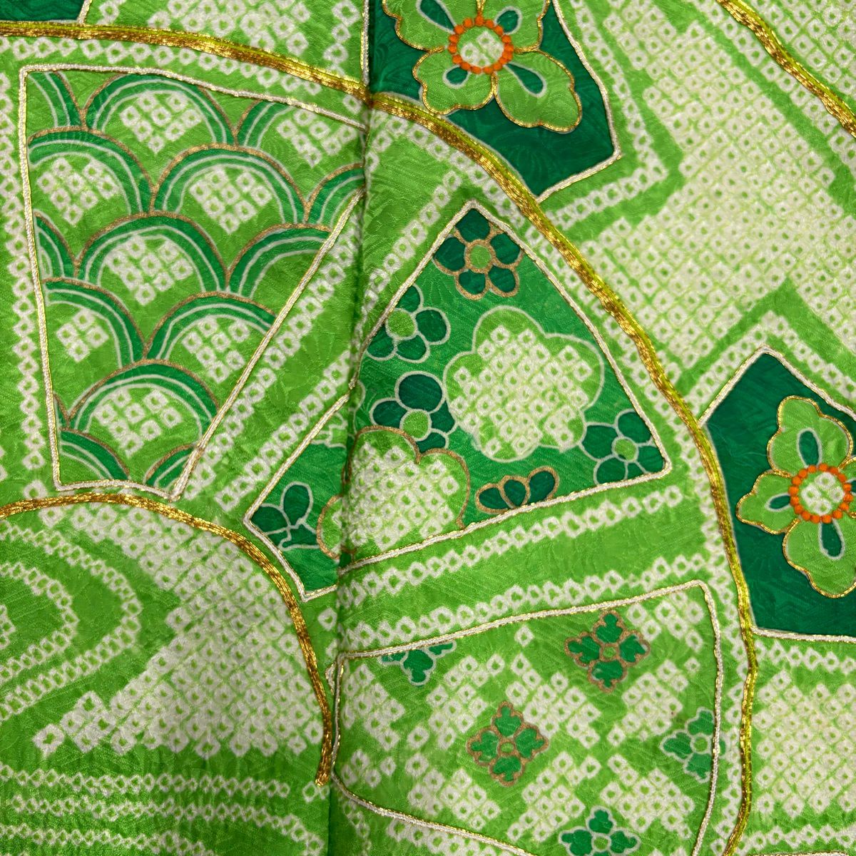 30%OFF 振袖 身丈159.5cm 裄丈66.5cm M 袷 扇面 橘花 金糸 金彩 オレンジ 正絹 秀品 K30