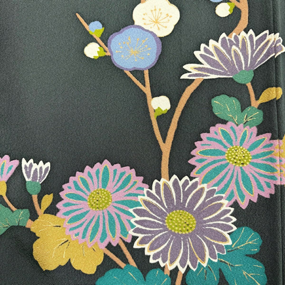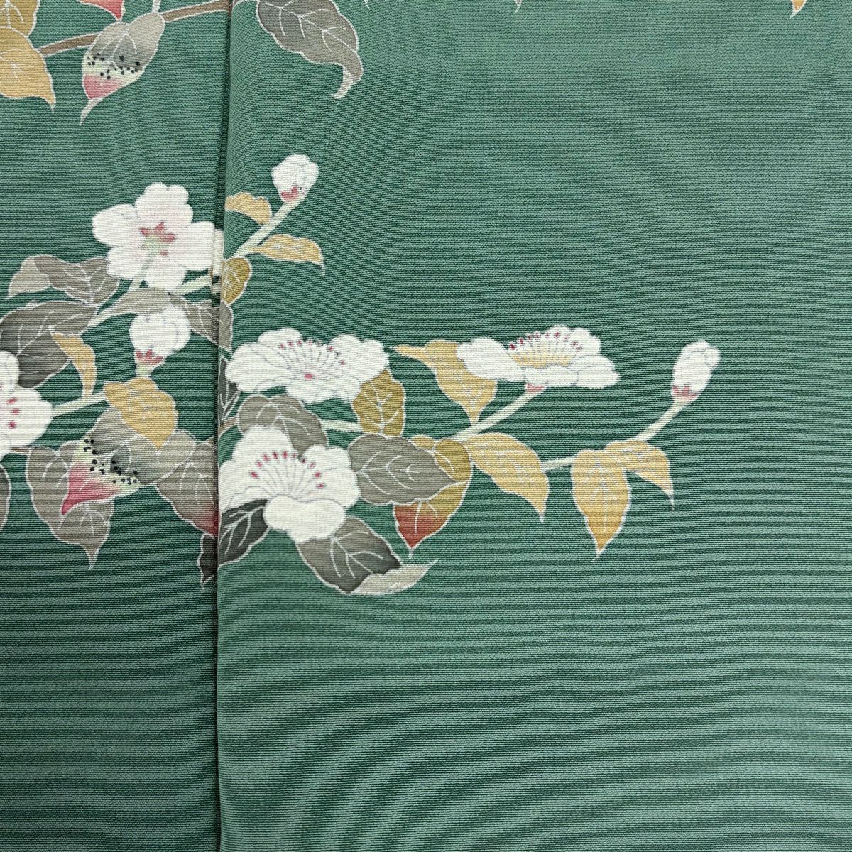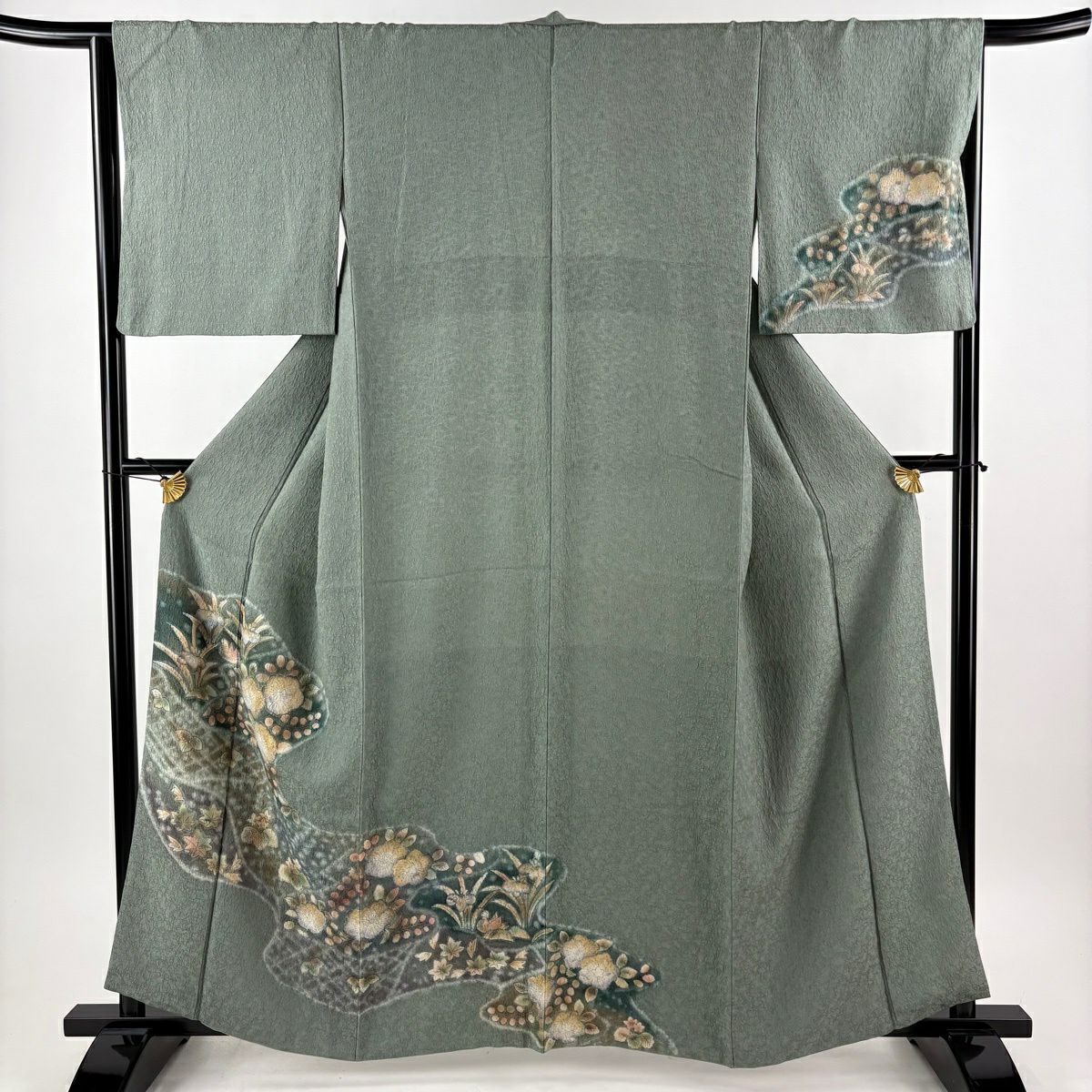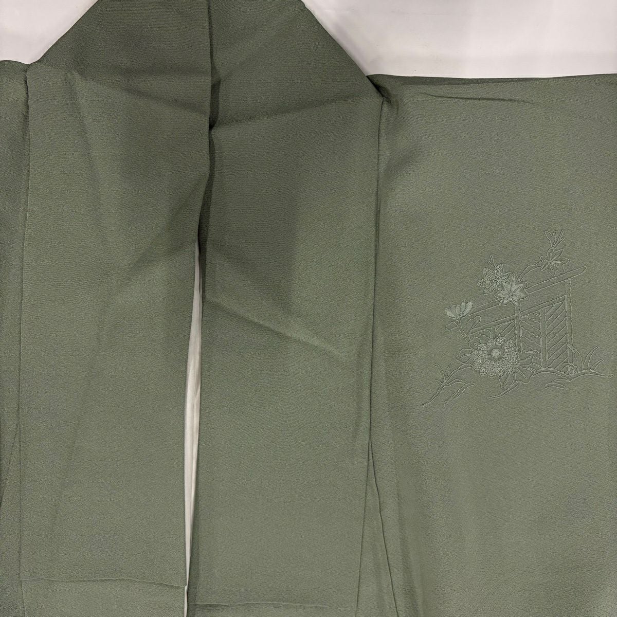 30%OFF 付下げ 身丈163.5cm 裄丈66.5cm M 袷 落款あり 枝梅 菊 金彩 灰緑 正絹 秀品 K30