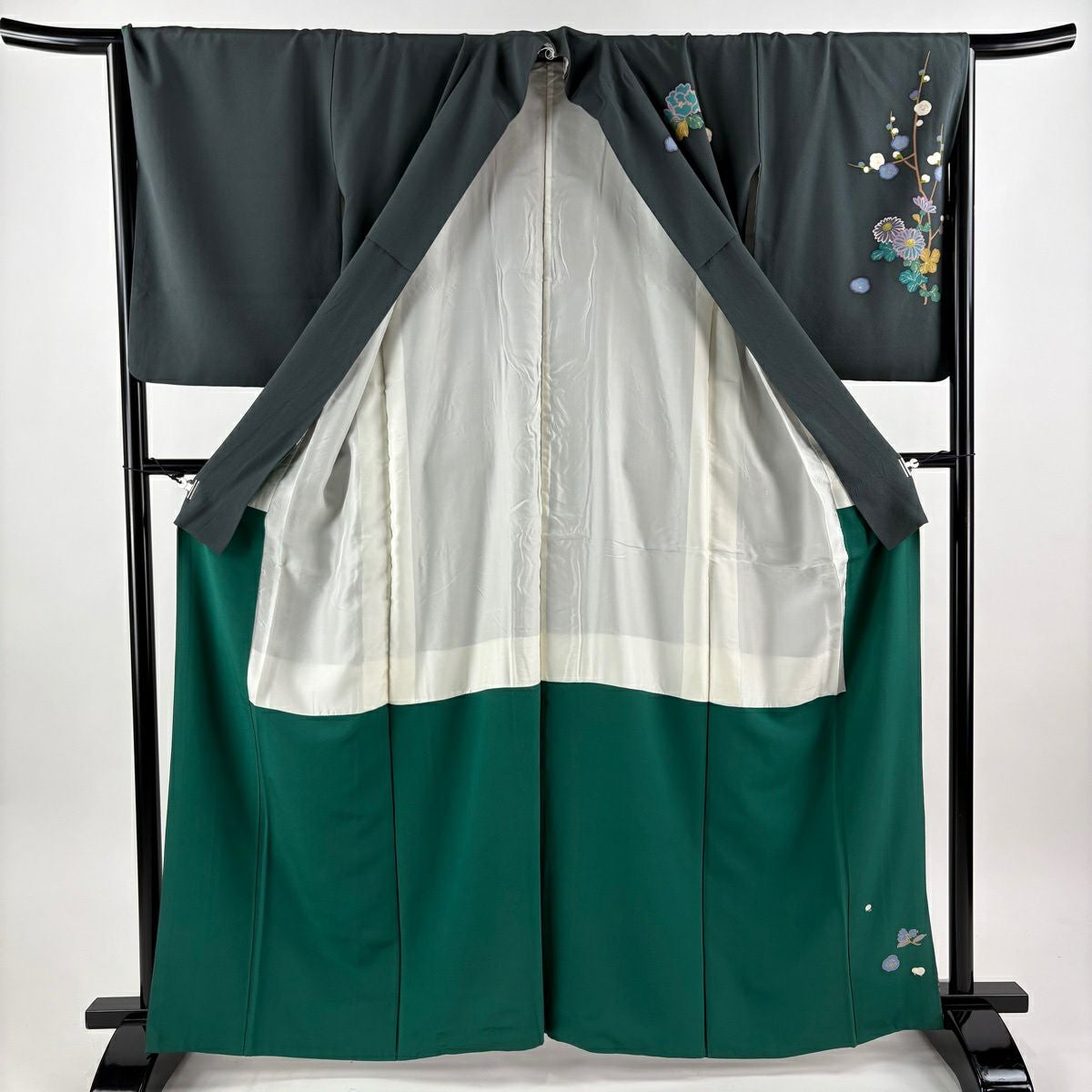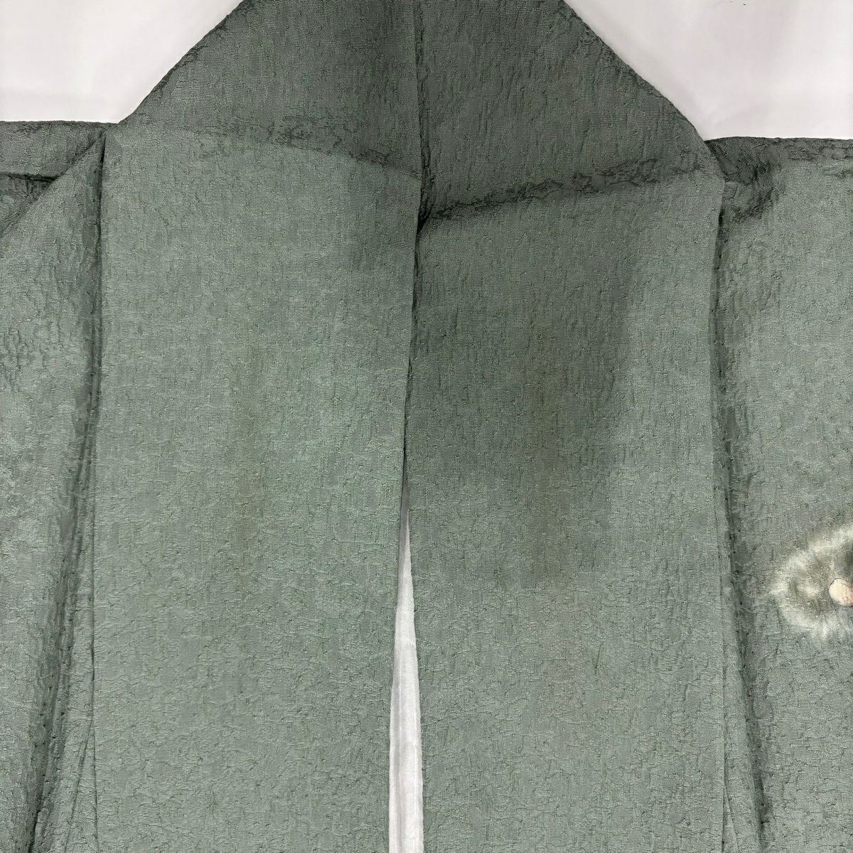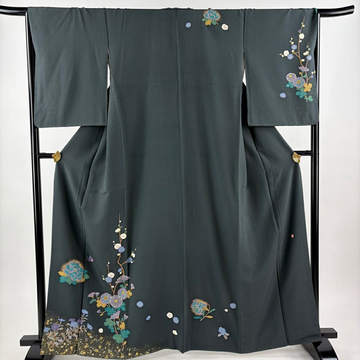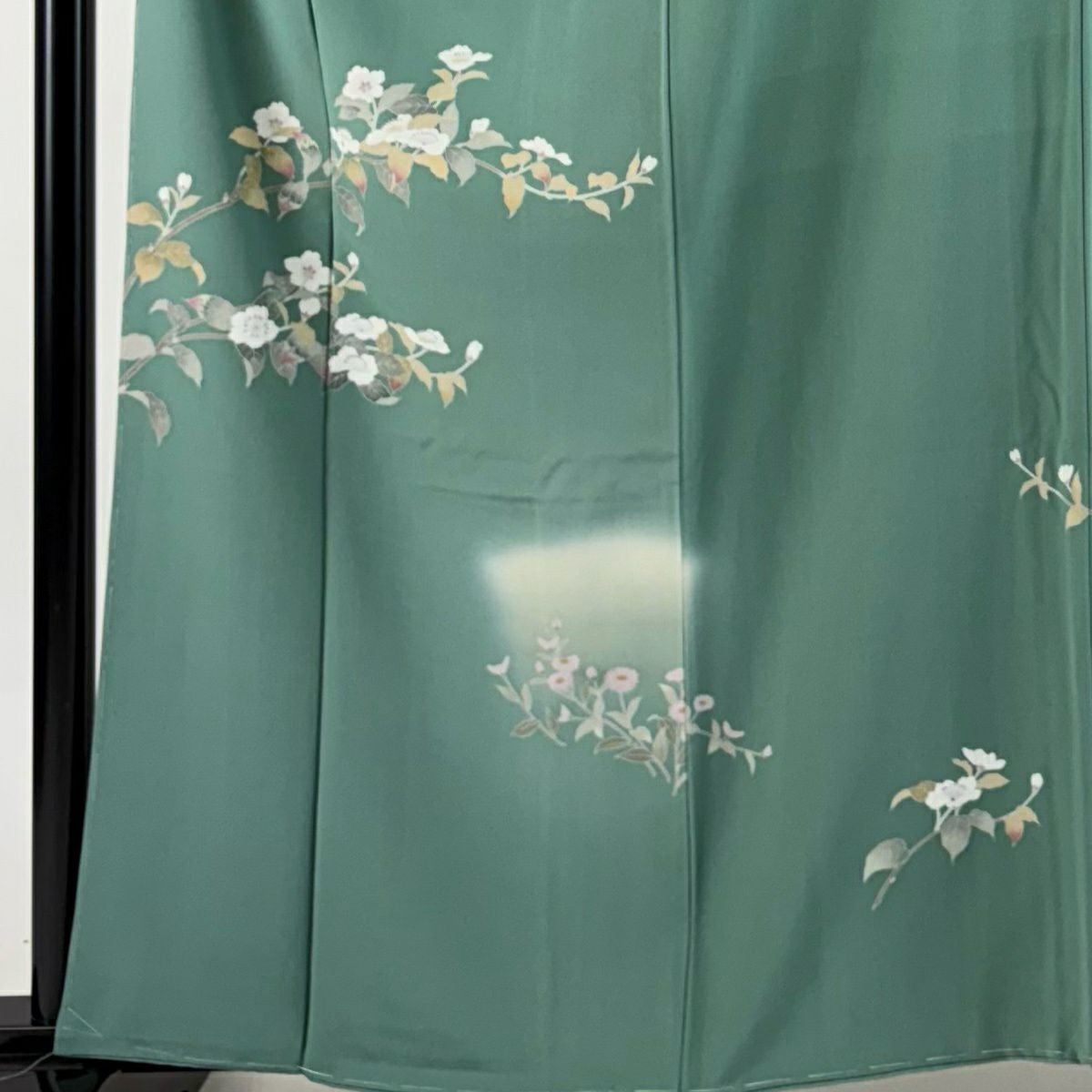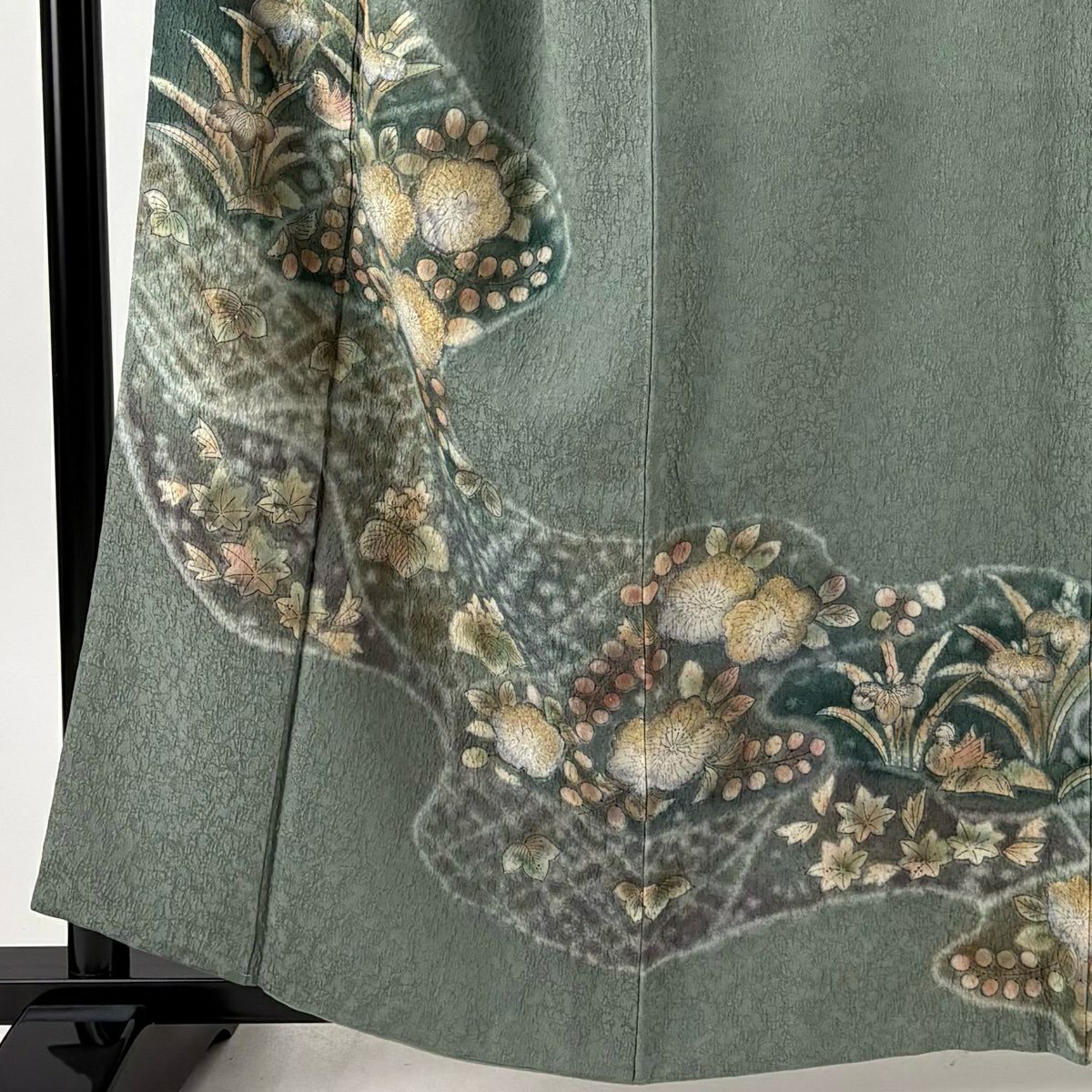 30%OFF 付下げ 身丈163.5cm 裄丈66.5cm M 袷 落款あり 枝梅 菊 金彩 灰緑 正絹 秀品 K30
