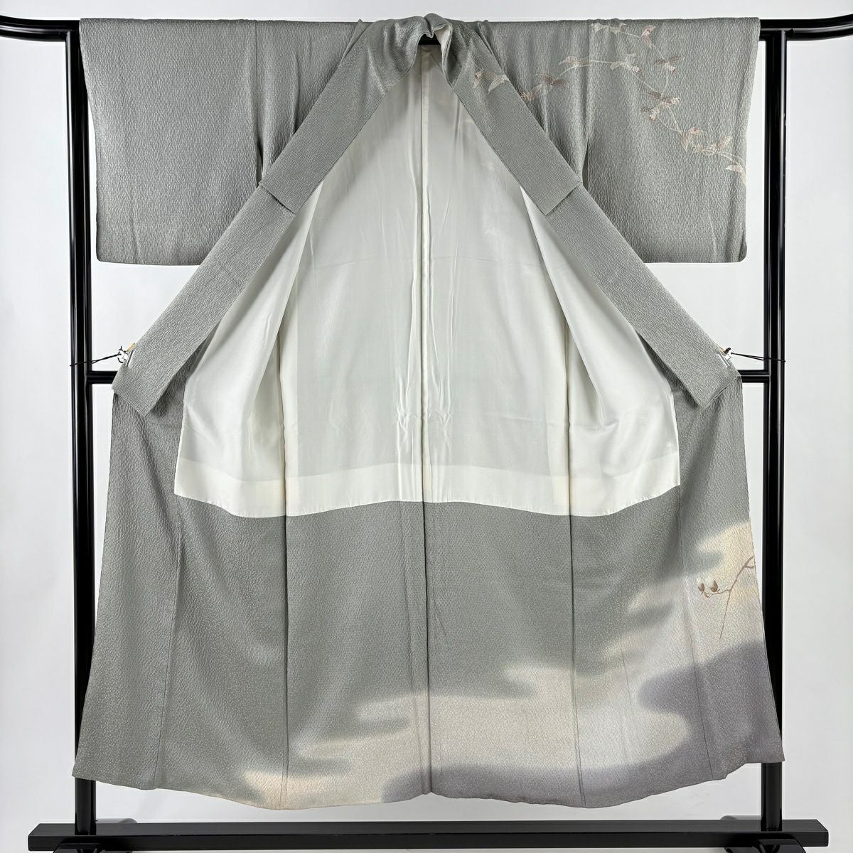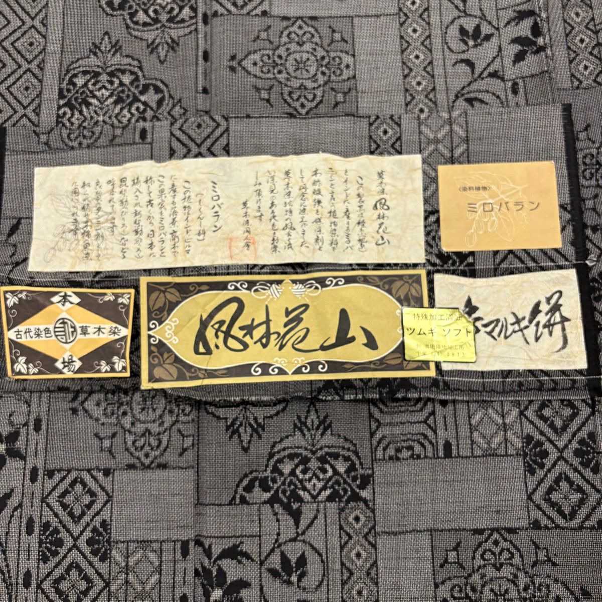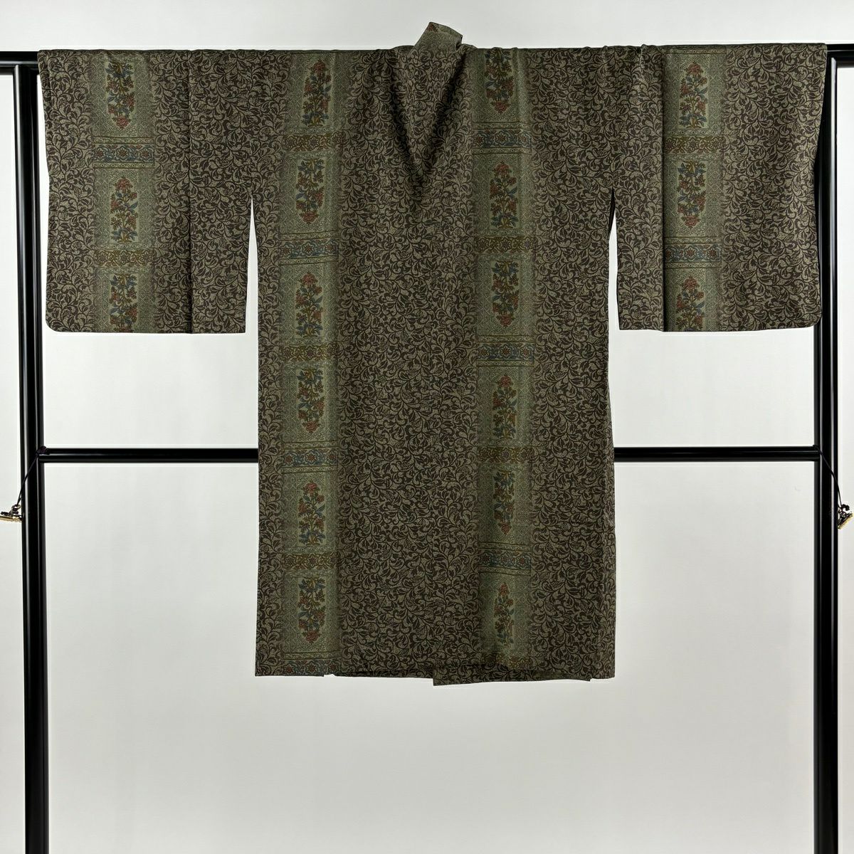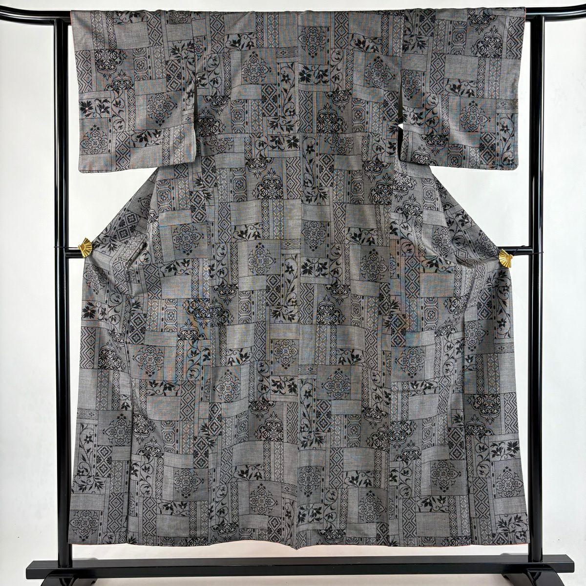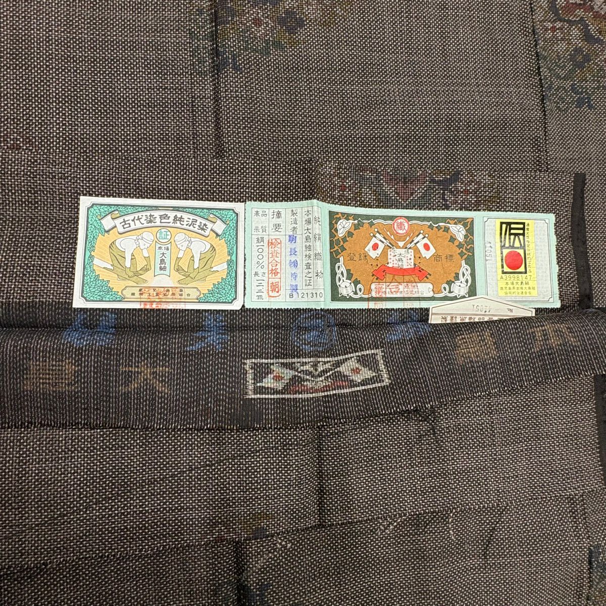 30%OFF 紬 身丈155cm 裄丈62.5cm S 袷 証紙あり 華文 花唐草 草木染 灰色 正絹 秀品 K30