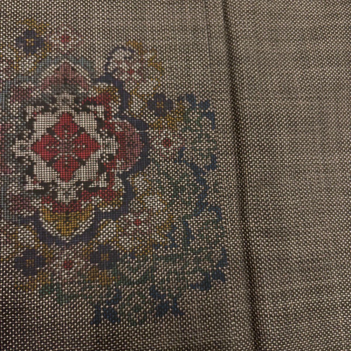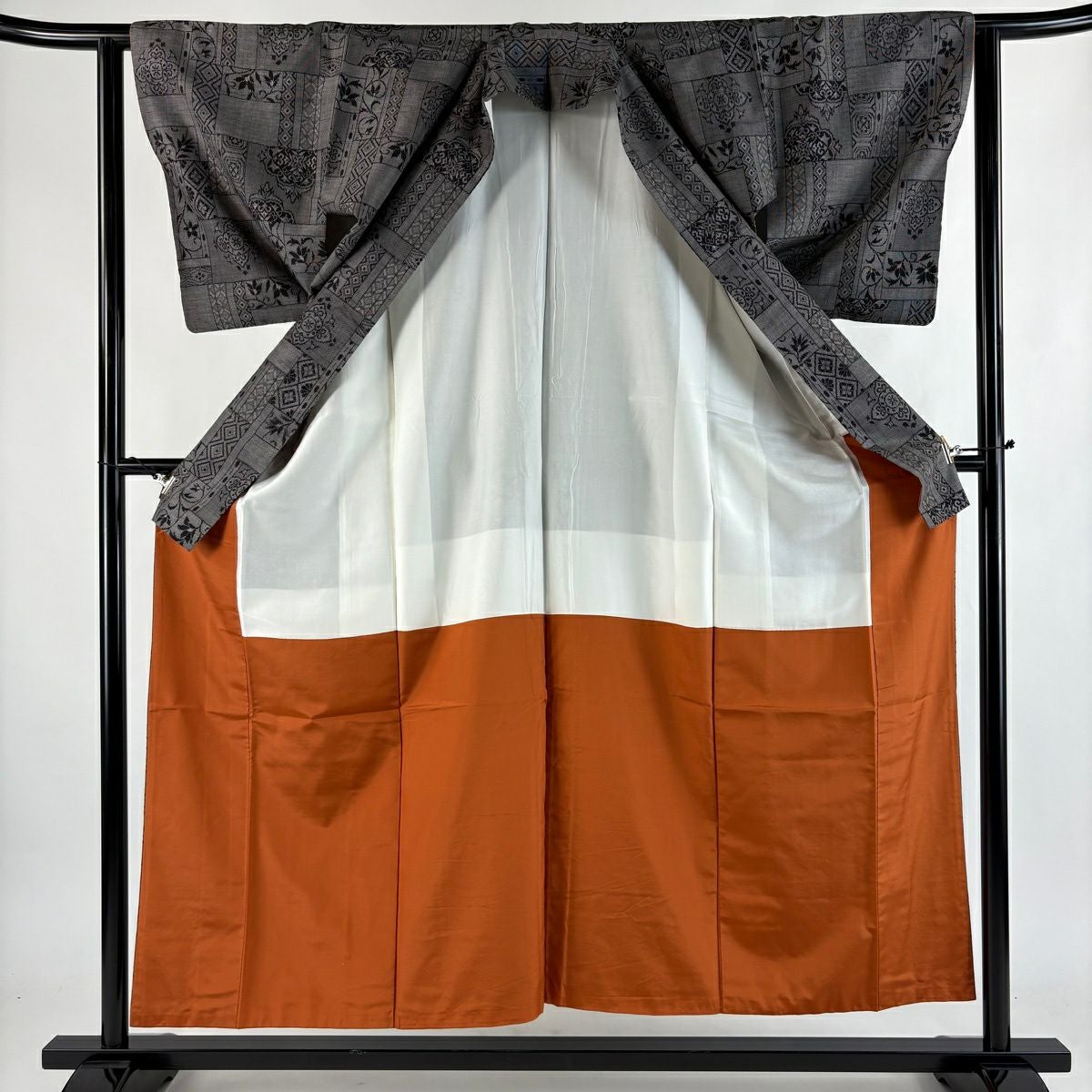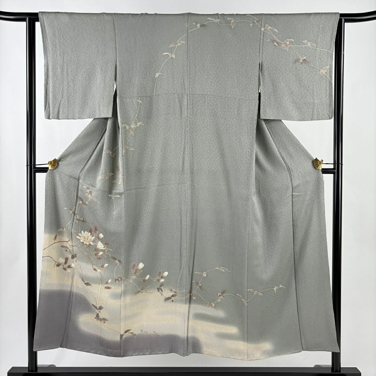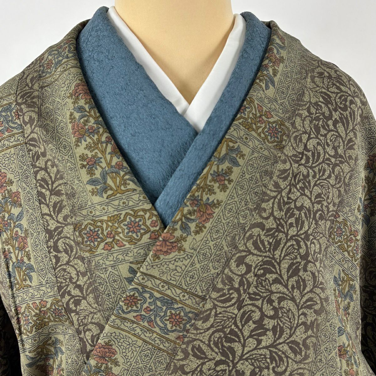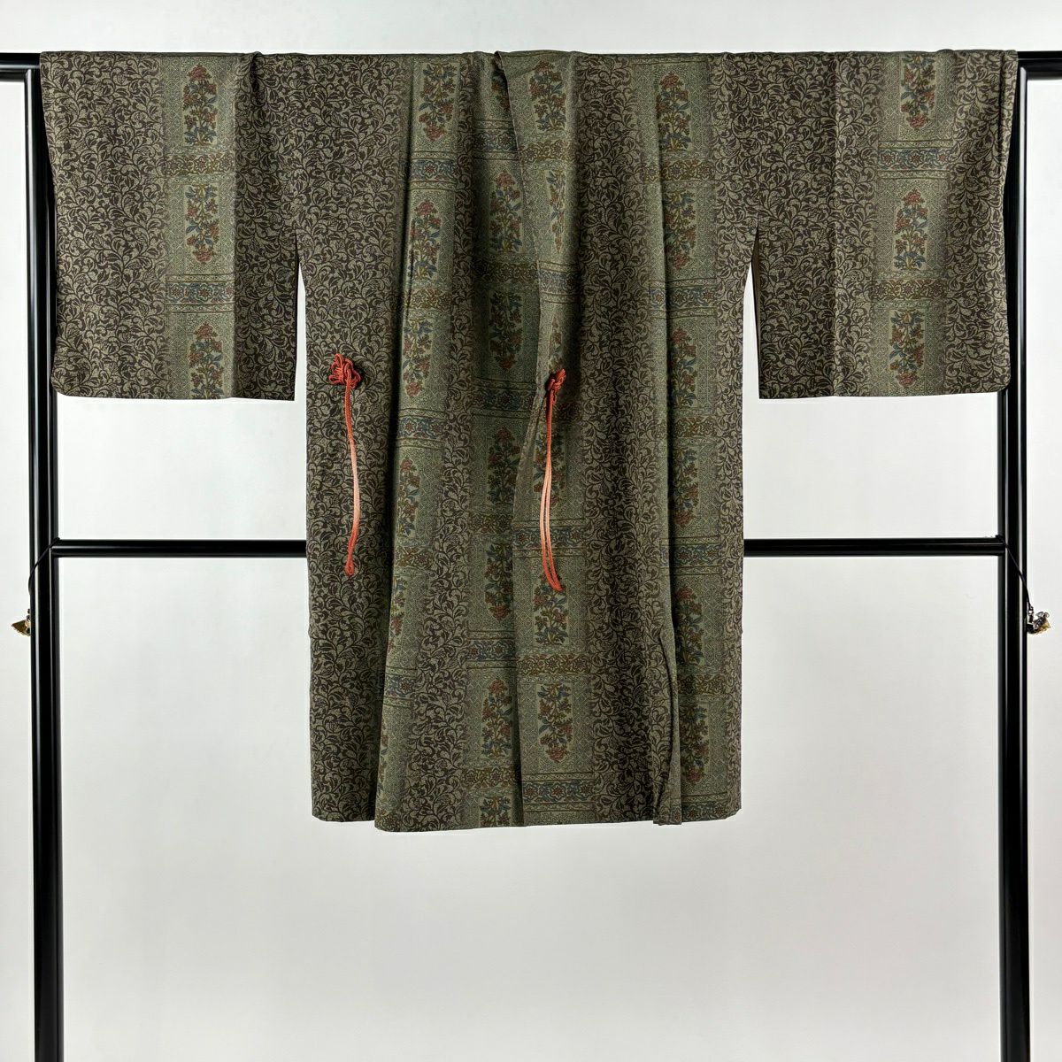 30%OFF 紬 身丈155cm 裄丈62.5cm S 袷 証紙あり 華文 花唐草 草木染 灰色 正絹 秀品 K30