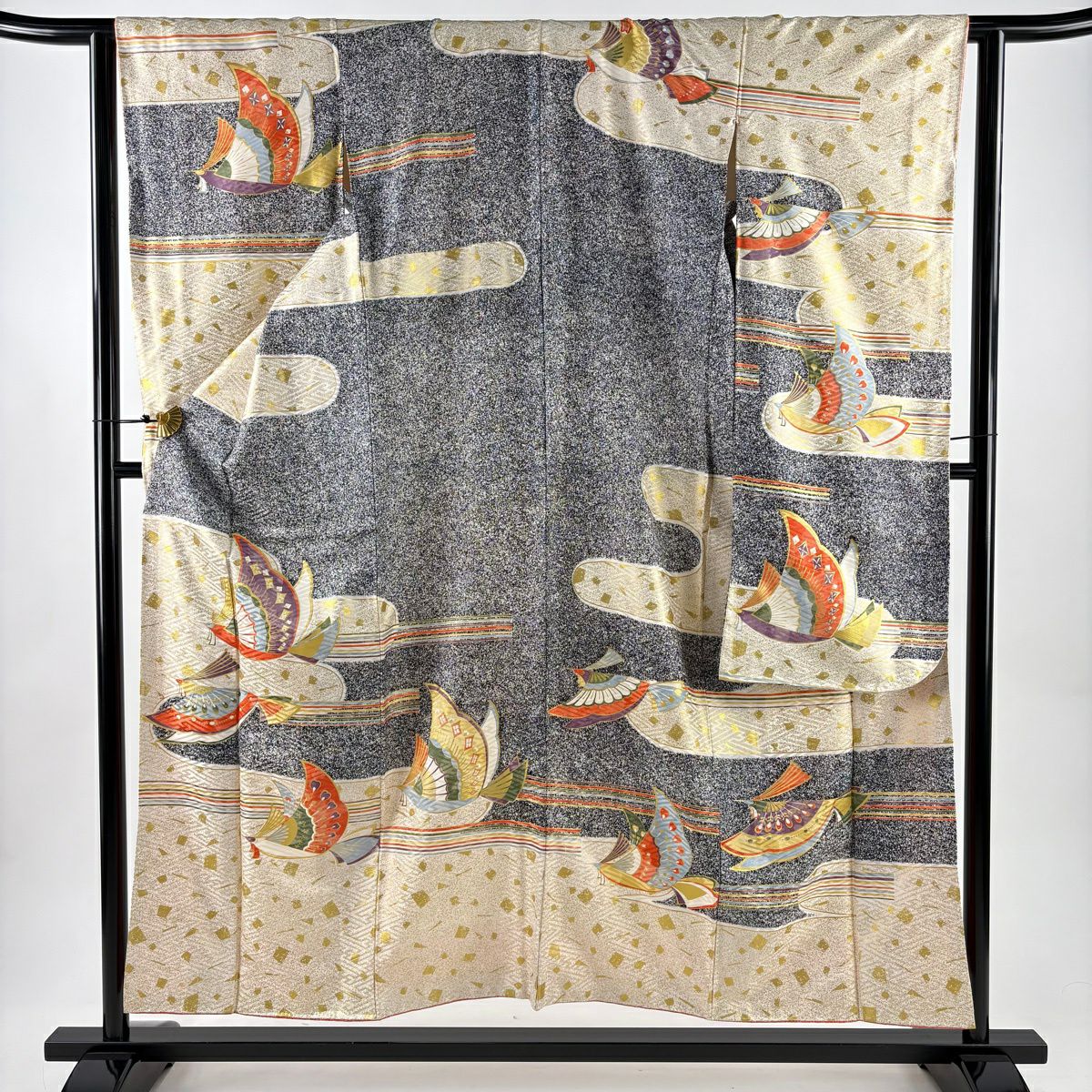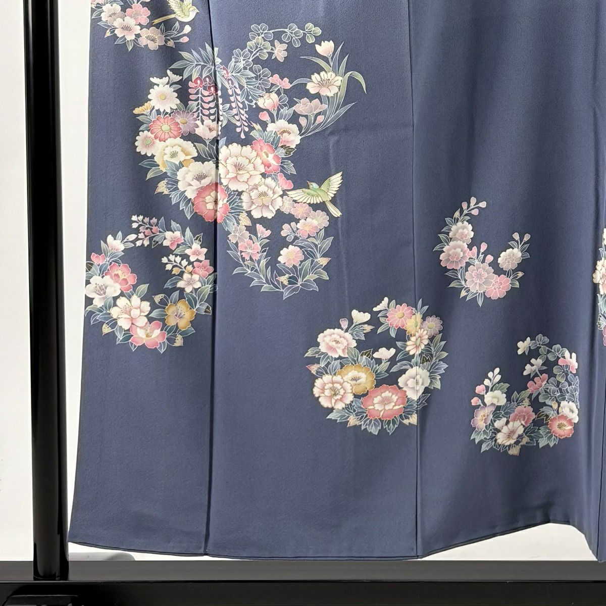 30%OFF 訪問着 身丈163.5cm 裄丈65cm M 袷 向かい鳥 草花 金彩 金糸 青灰色 正絹 秀品 K30