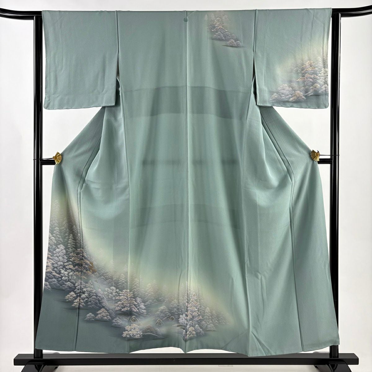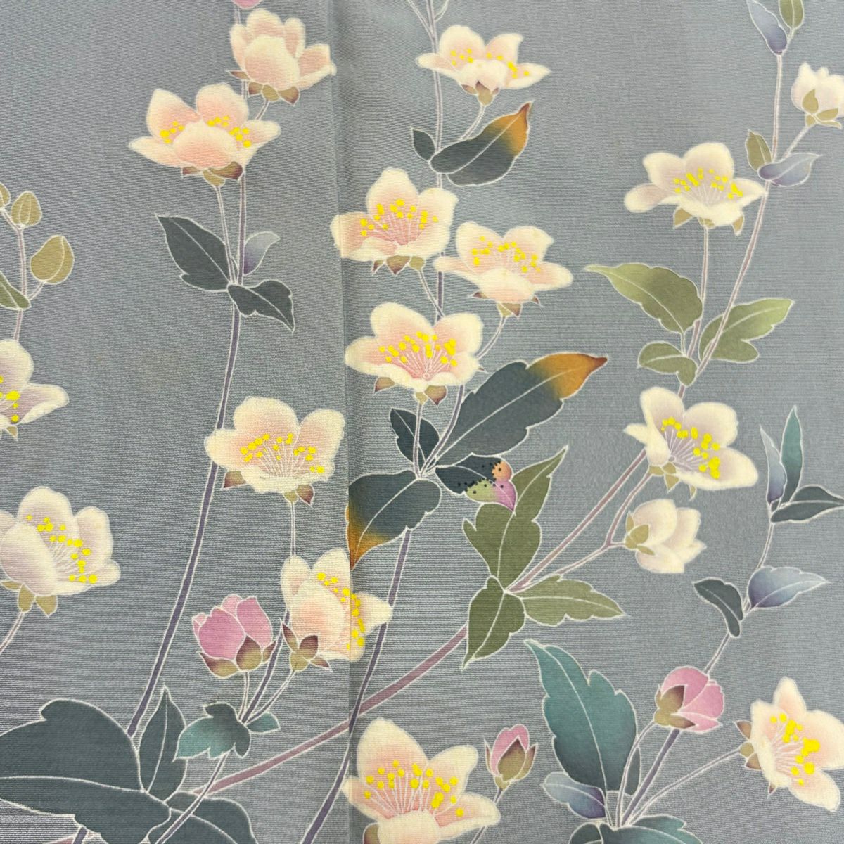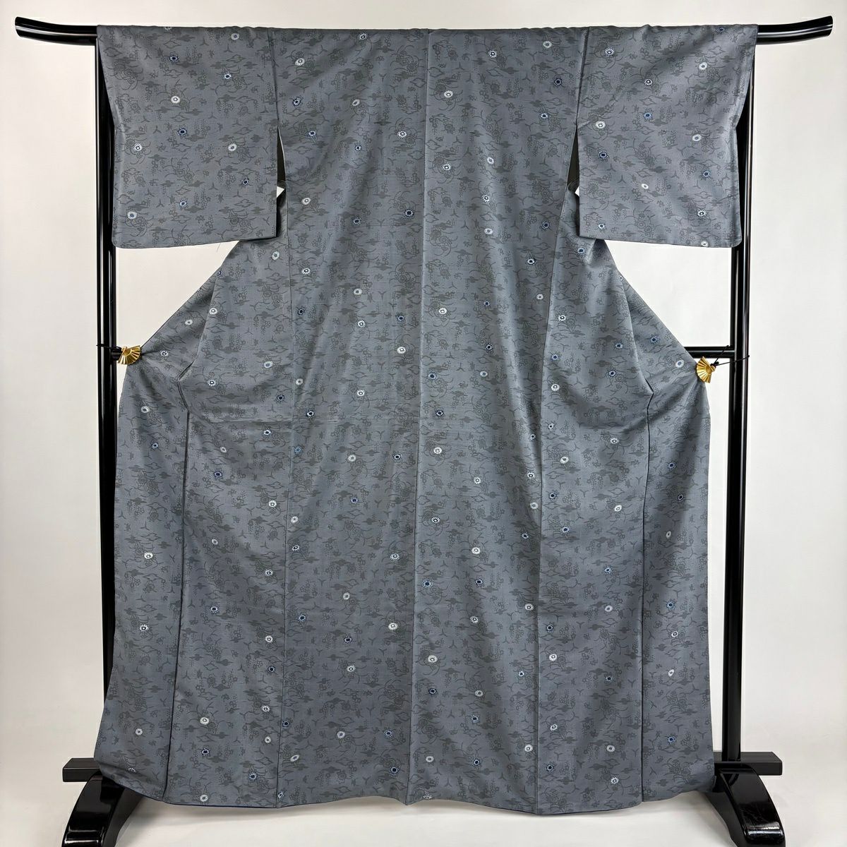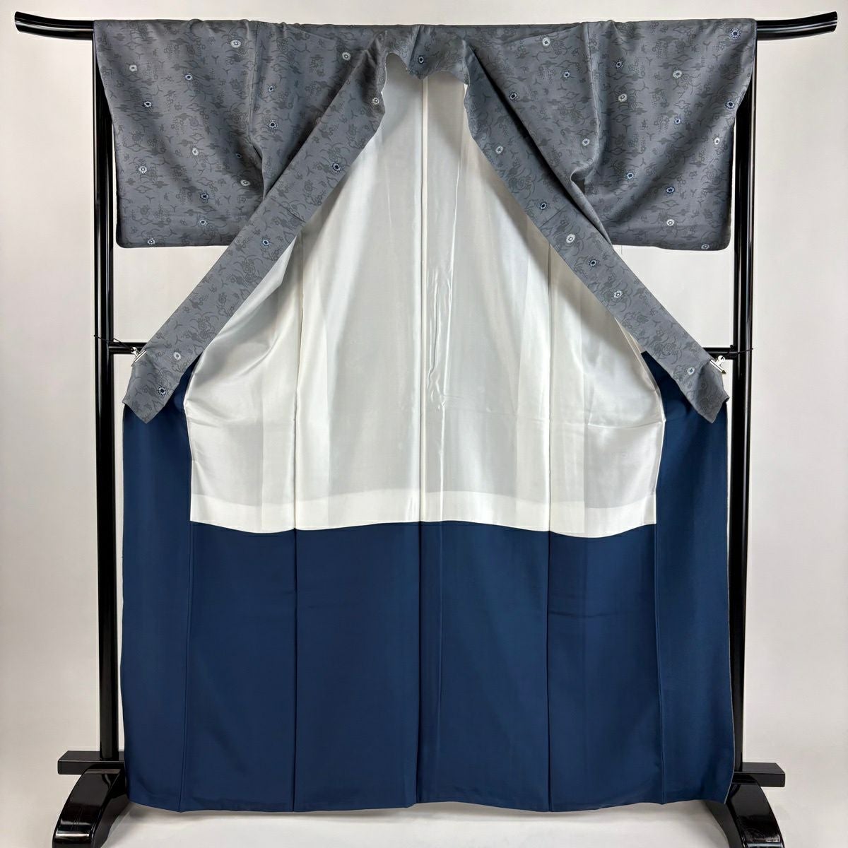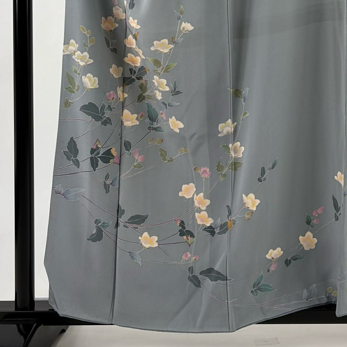 50%OFF 訪問着 身丈158.5cm 裄丈63cm S 袷 落款あり 枝花 青灰色 正絹 秀品 一つ紋 K50