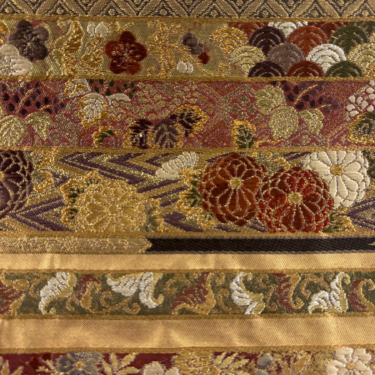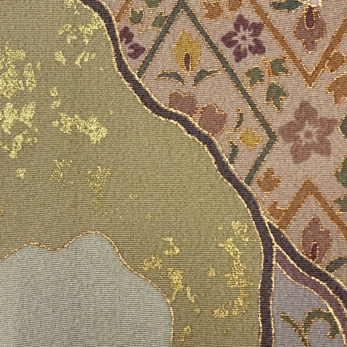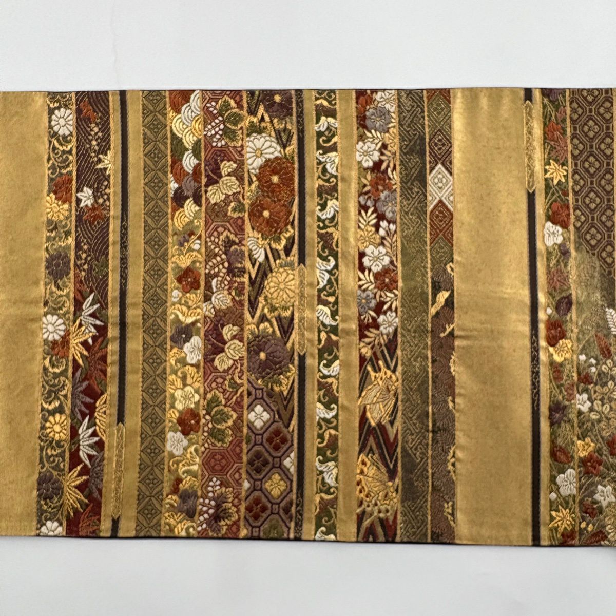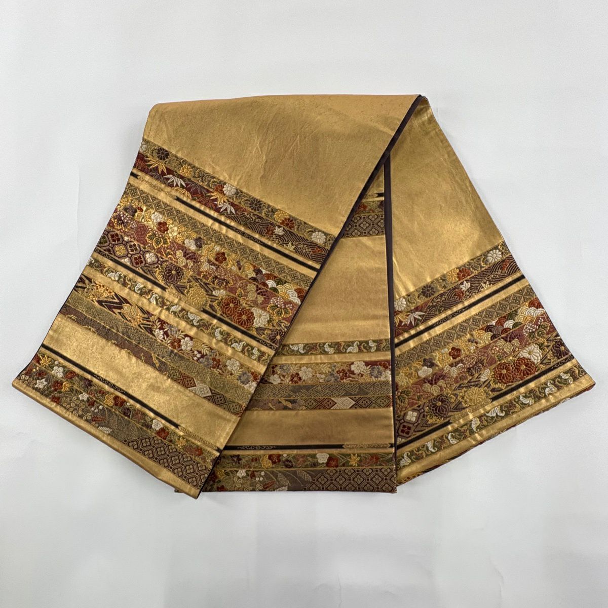 50%OFF 【美品】 袋帯 秀品 加納幸 落款あり 蒔絵段重文 草花 縞 金糸 箔 金色 お太鼓柄 正絹 K50