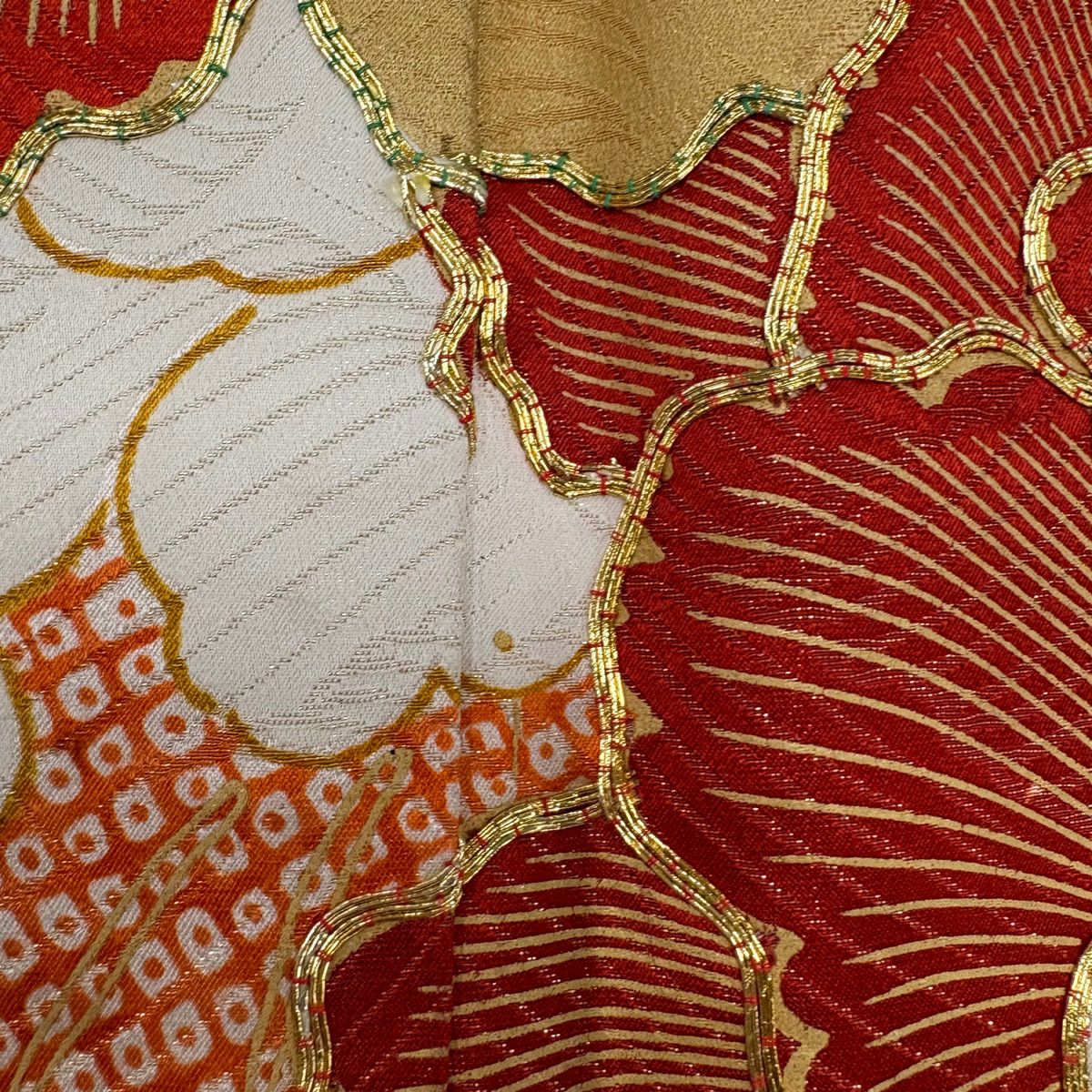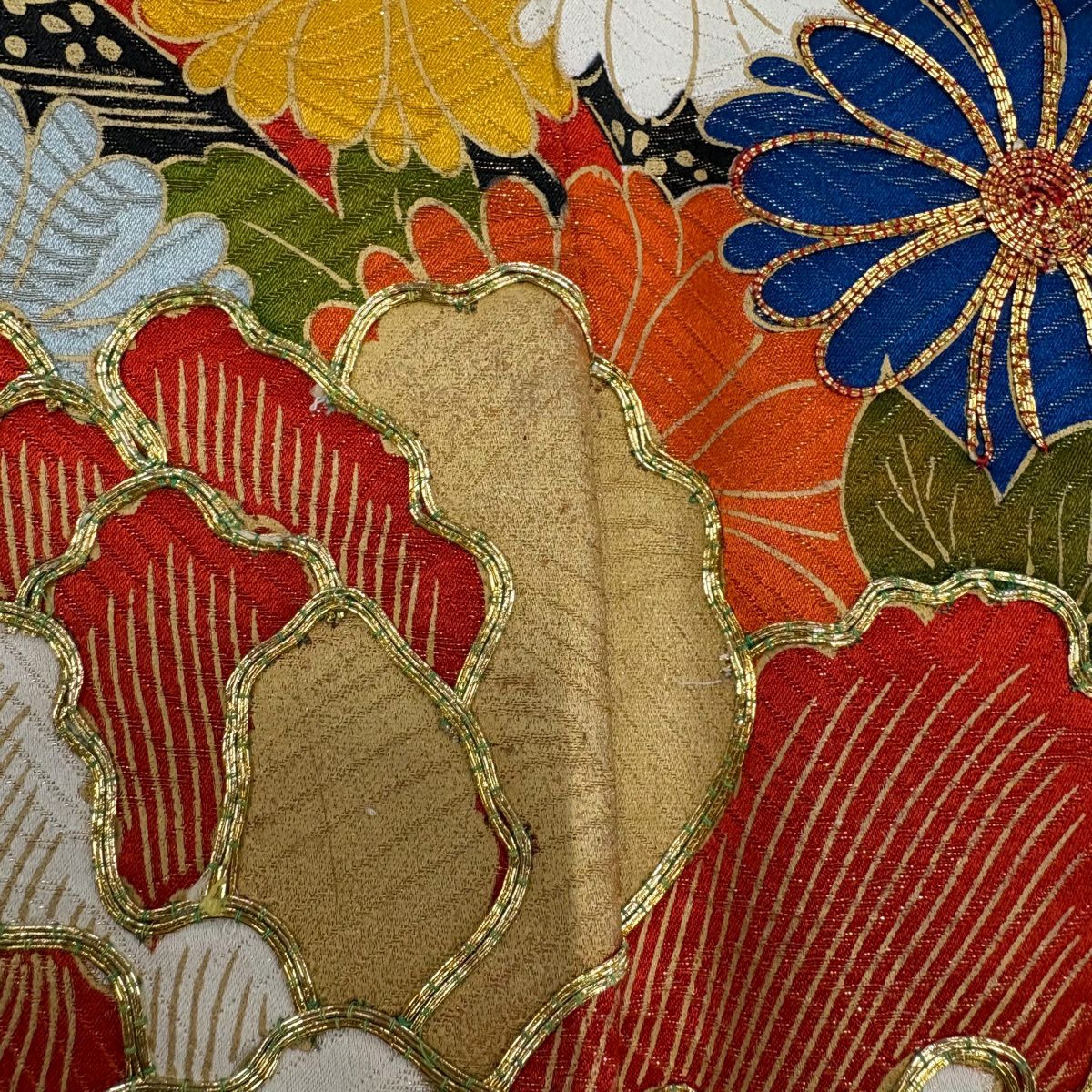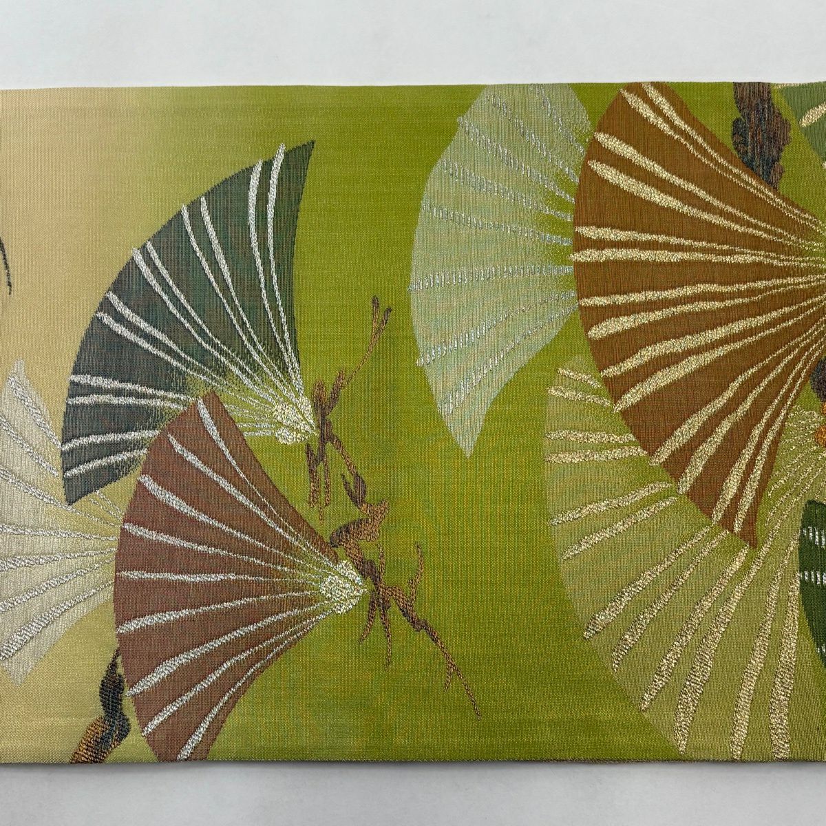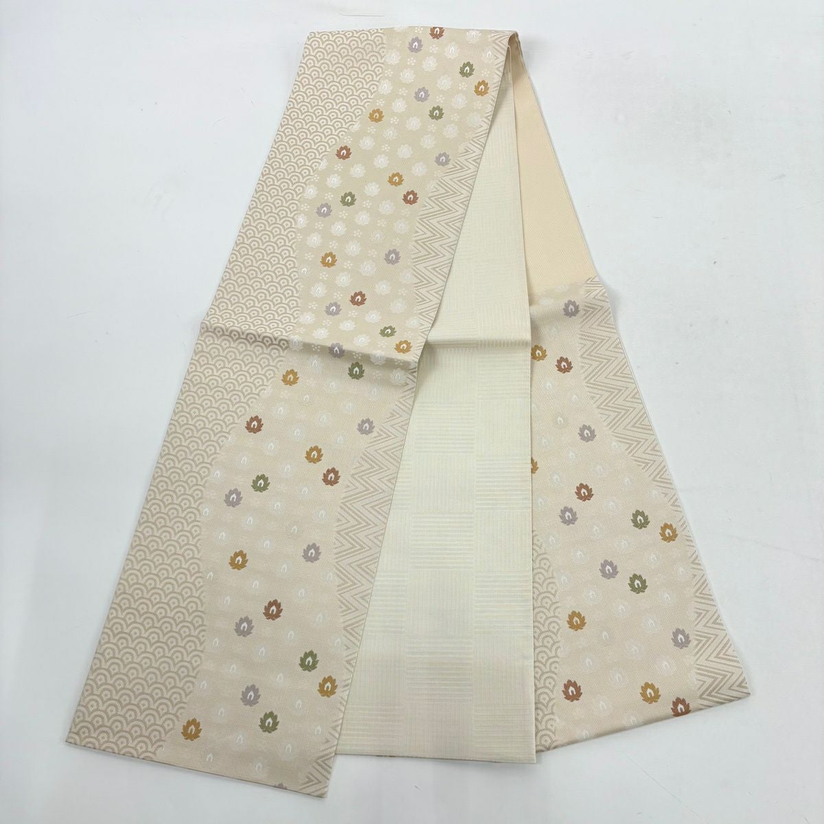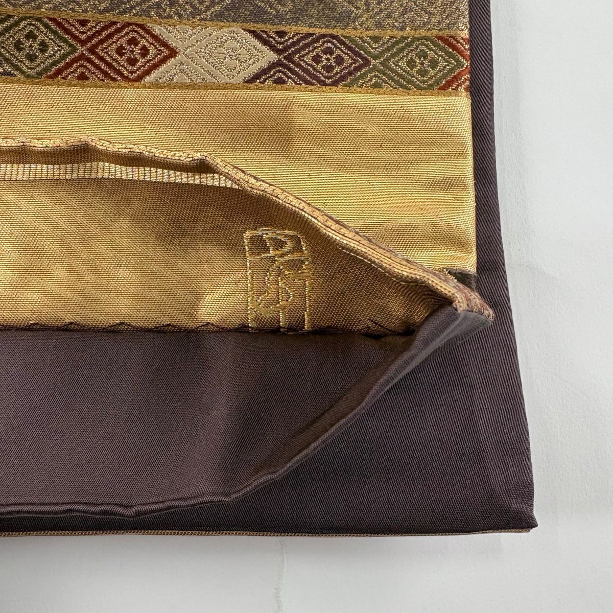 50%OFF 【美品】 袋帯 秀品 加納幸 落款あり 蒔絵段重文 草花 縞 金糸 箔 金色 お太鼓柄 正絹 K50