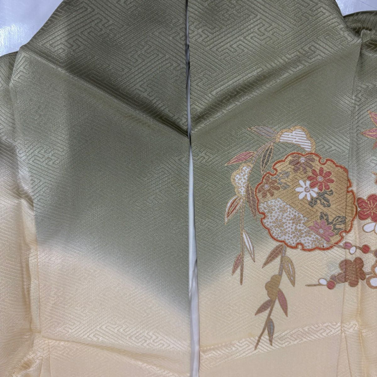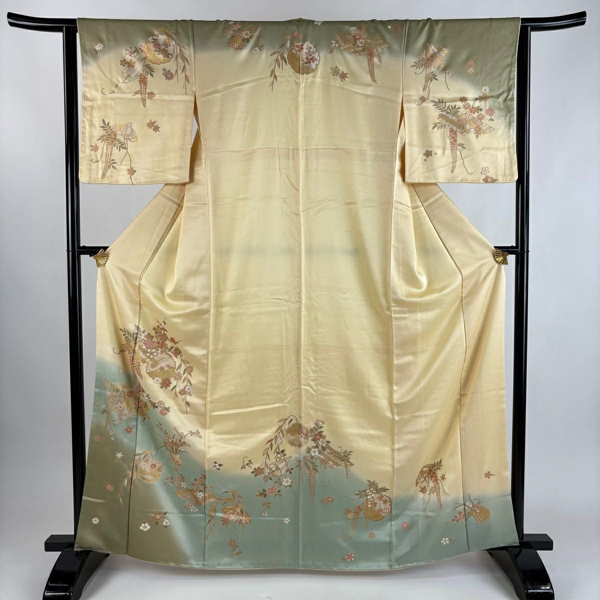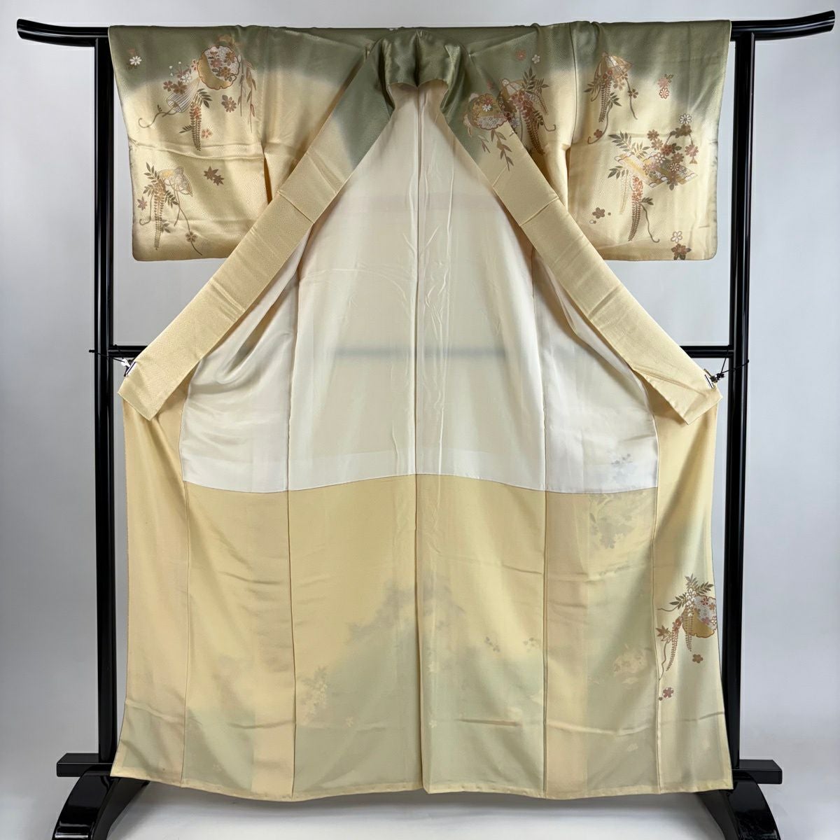 50%OFF 訪問着 身丈164cm 裄丈67cm M 袷 逆さ雲取り 草花 刺繍 絞り 鶯色 正絹 秀品 K50