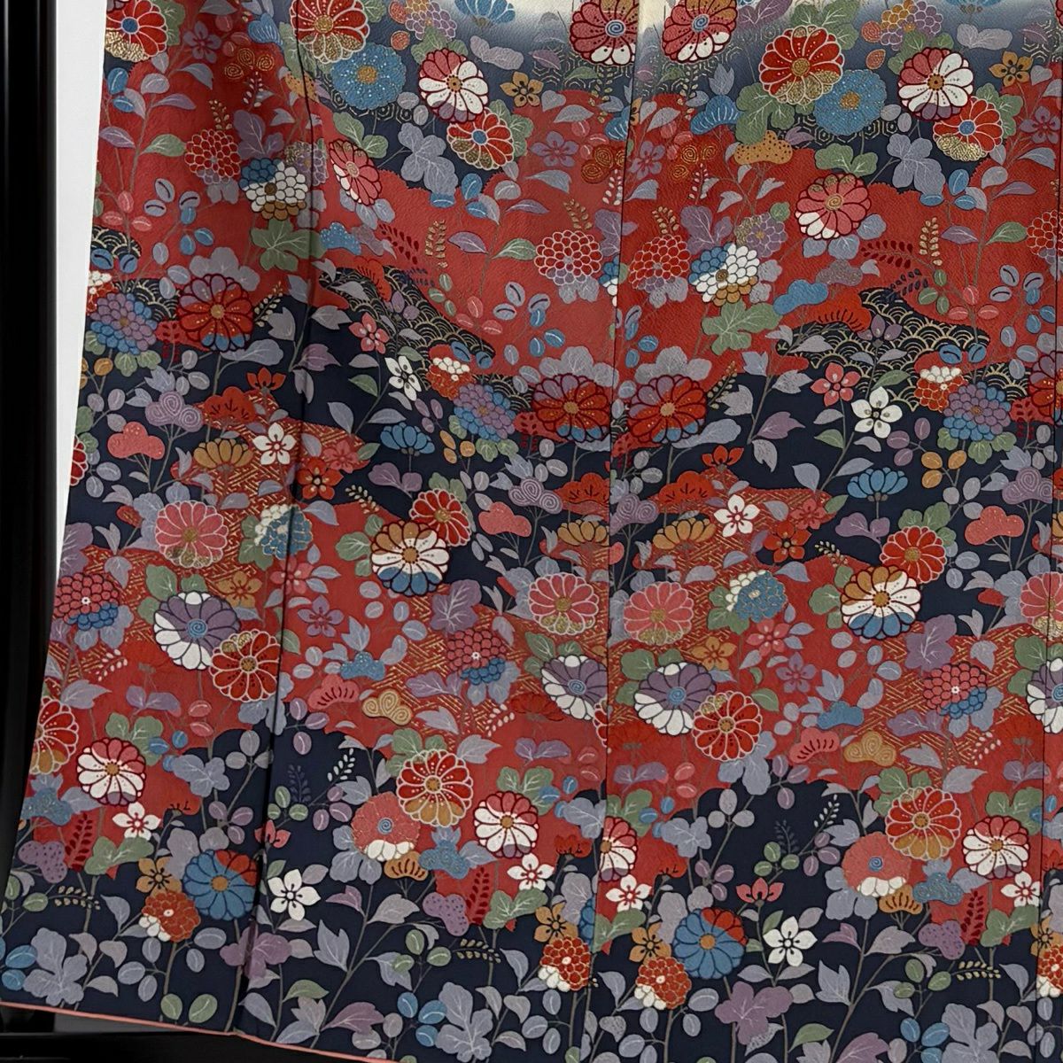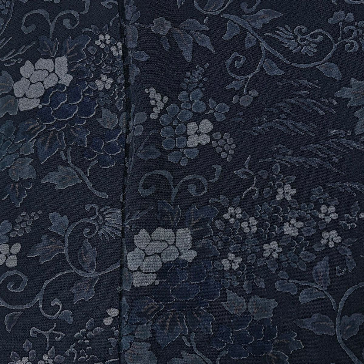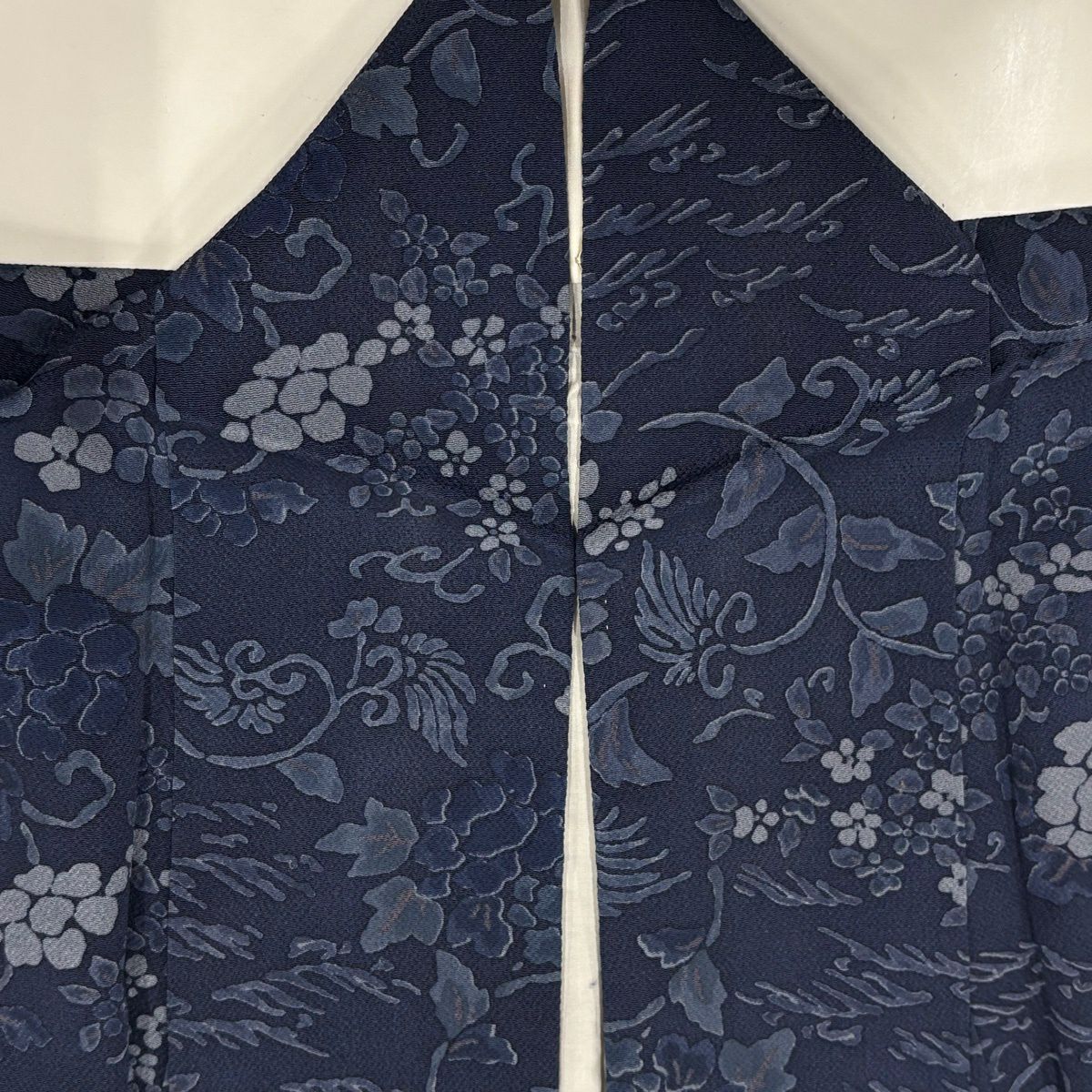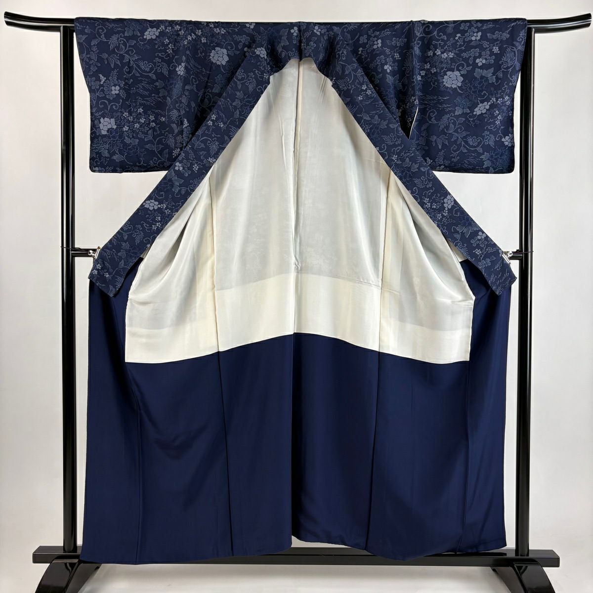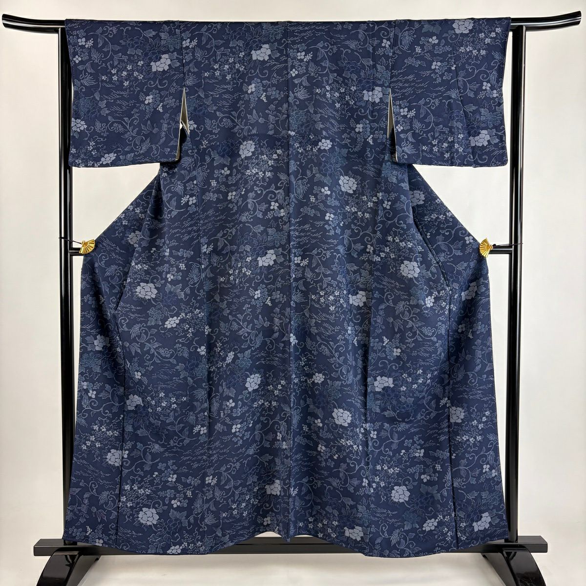 50%OFF 小紋 身丈163.5cm 裄丈66cm M 袷 名古屋帯セット 花唐草 縞 紺色 正絹 秀品 K50