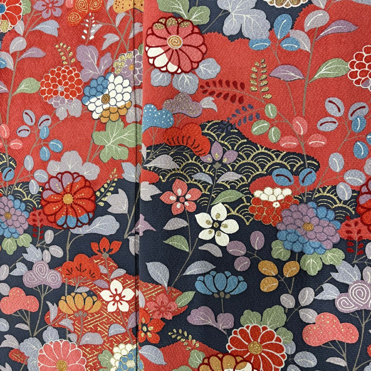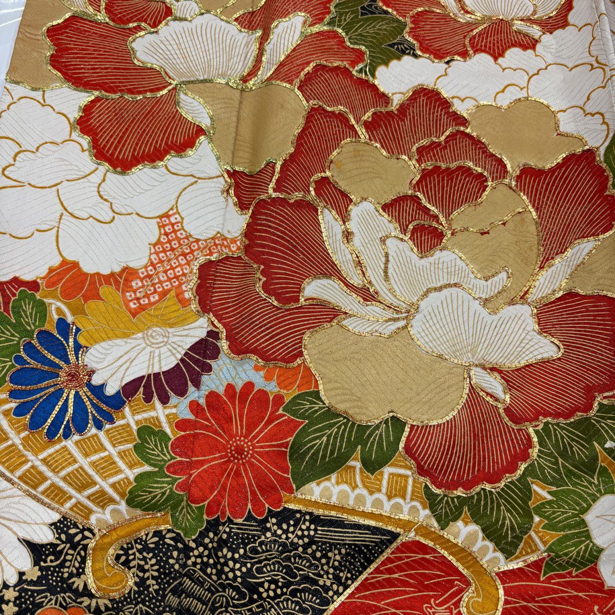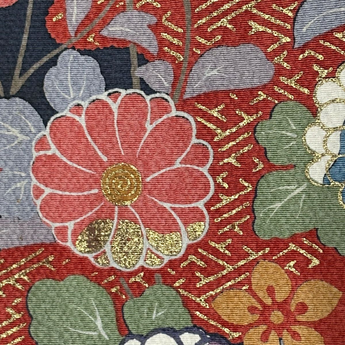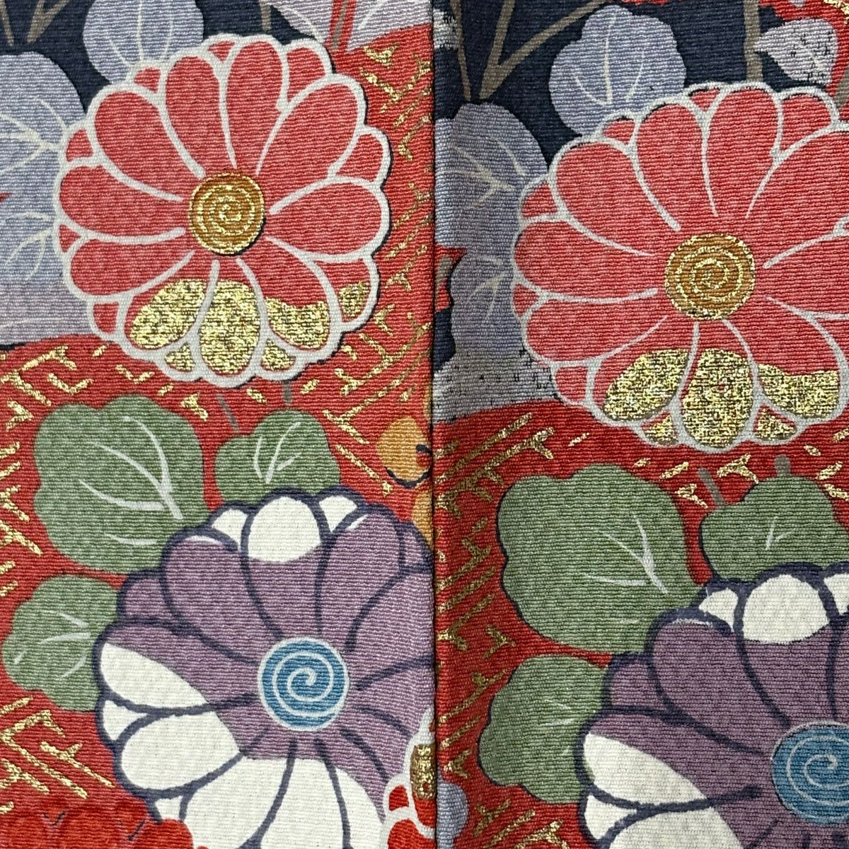 50%OFF 【美品】 小紋 身丈161cm 裄丈65cm M 袷 菊 扇子 金彩 オレンジ 正絹 秀品 K50
