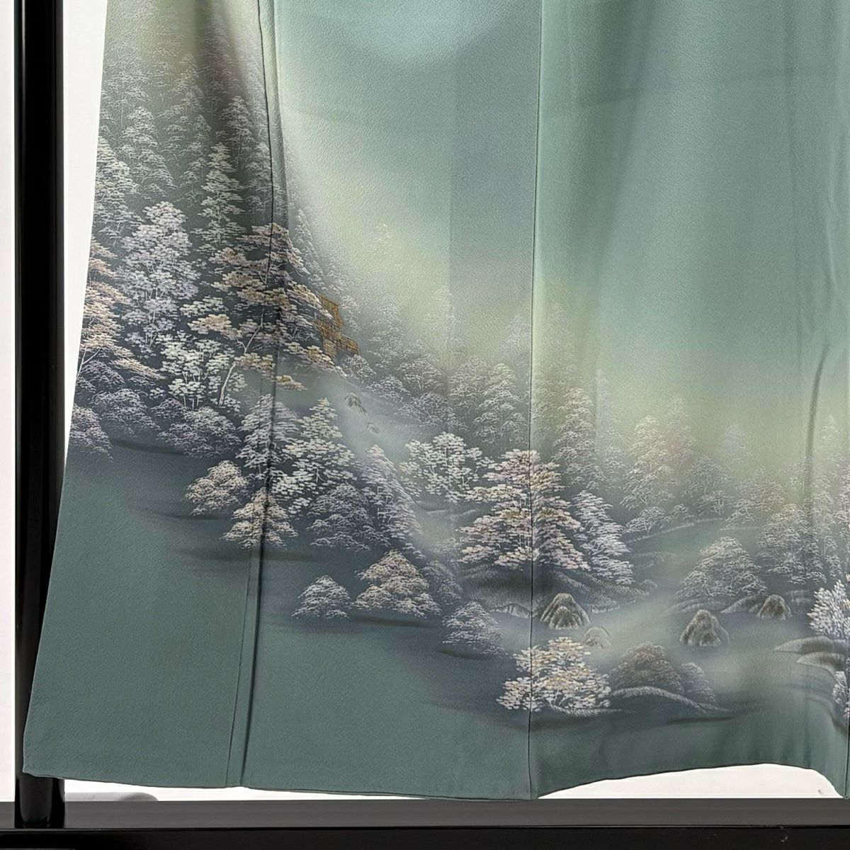 50%OFF 訪問着 身丈158.5cm 裄丈65cm M 袷 扇 草花 金銀彩 染め分け 青緑 正絹 秀品 K50