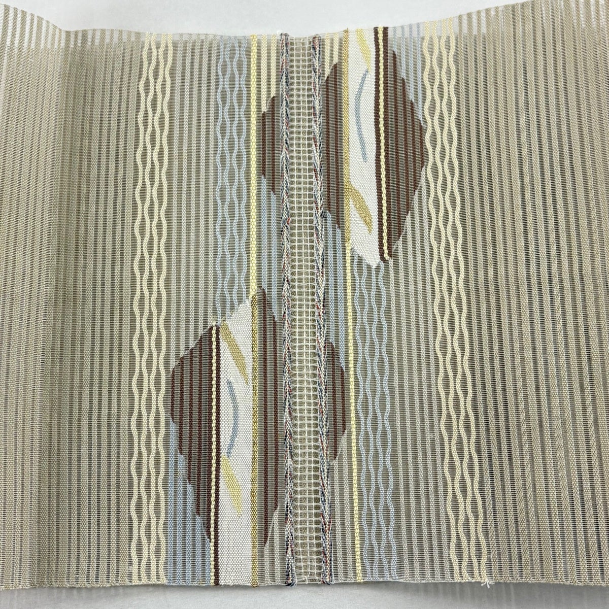 【美品】 名古屋帯 秀品 八寸名古屋帯 夏帯 よろけ縞 幾何学模様 金銀糸 ベージュ 正絹