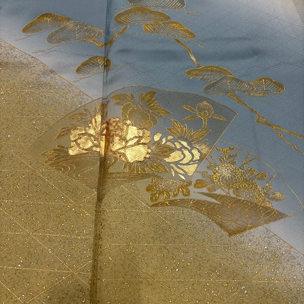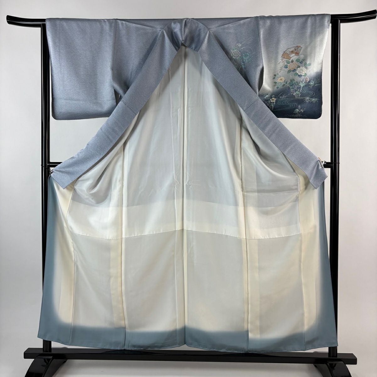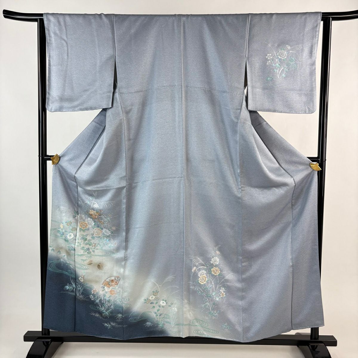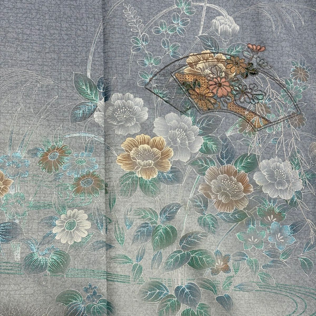 70%OFF 訪問着 身丈165cm 裄丈66.5cm M 袷 扇面 草花 金彩 ぼかし 青灰色 正絹 秀品 K70