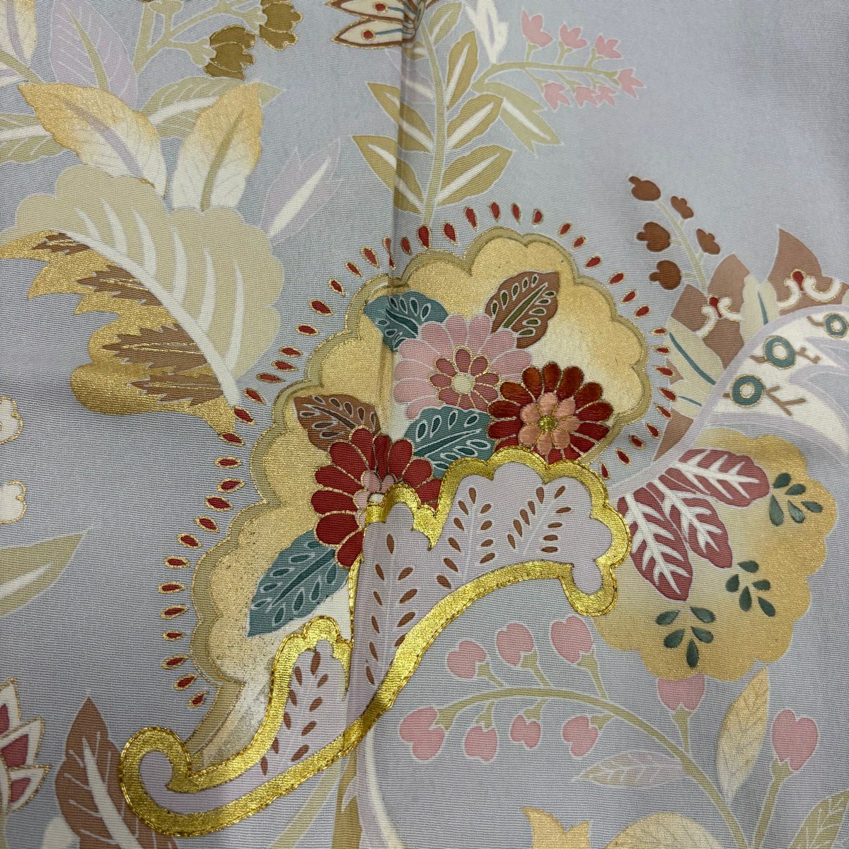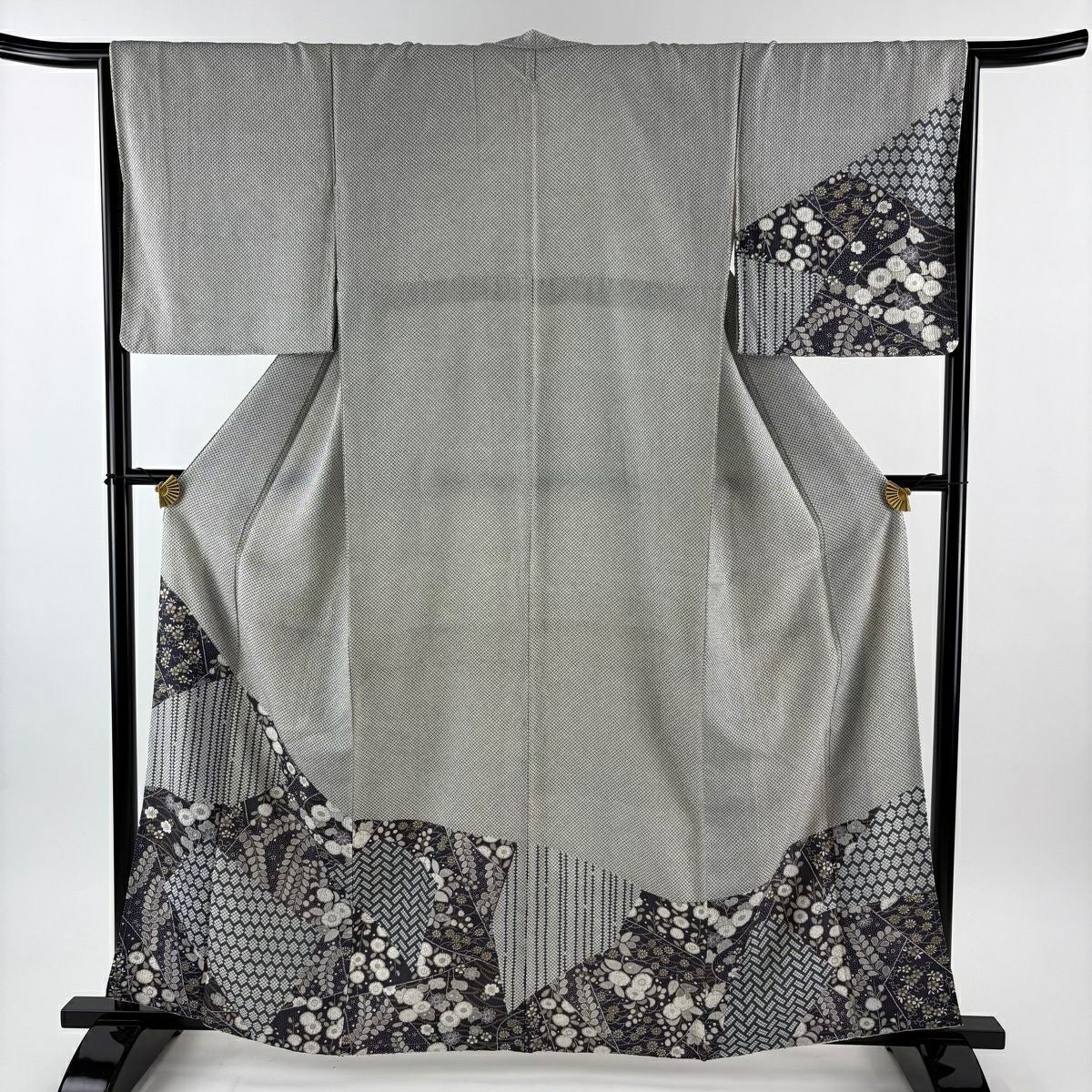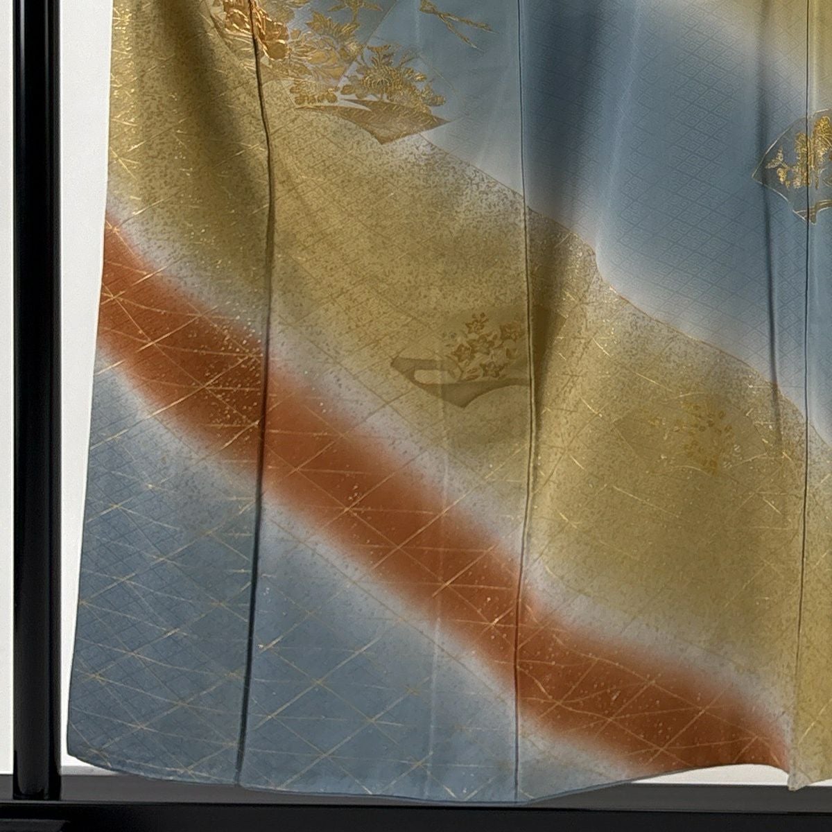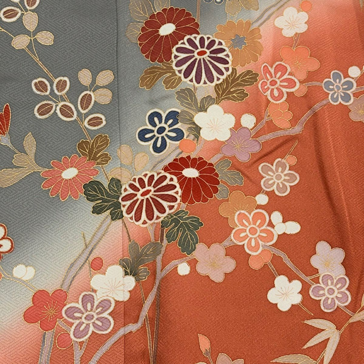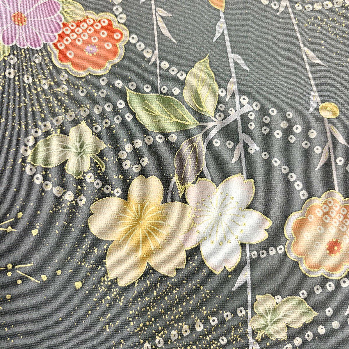 70%OFF 訪問着 身丈165cm 裄丈66.5cm M 袷 扇面 草花 金彩 ぼかし 青灰色 正絹 秀品 K70