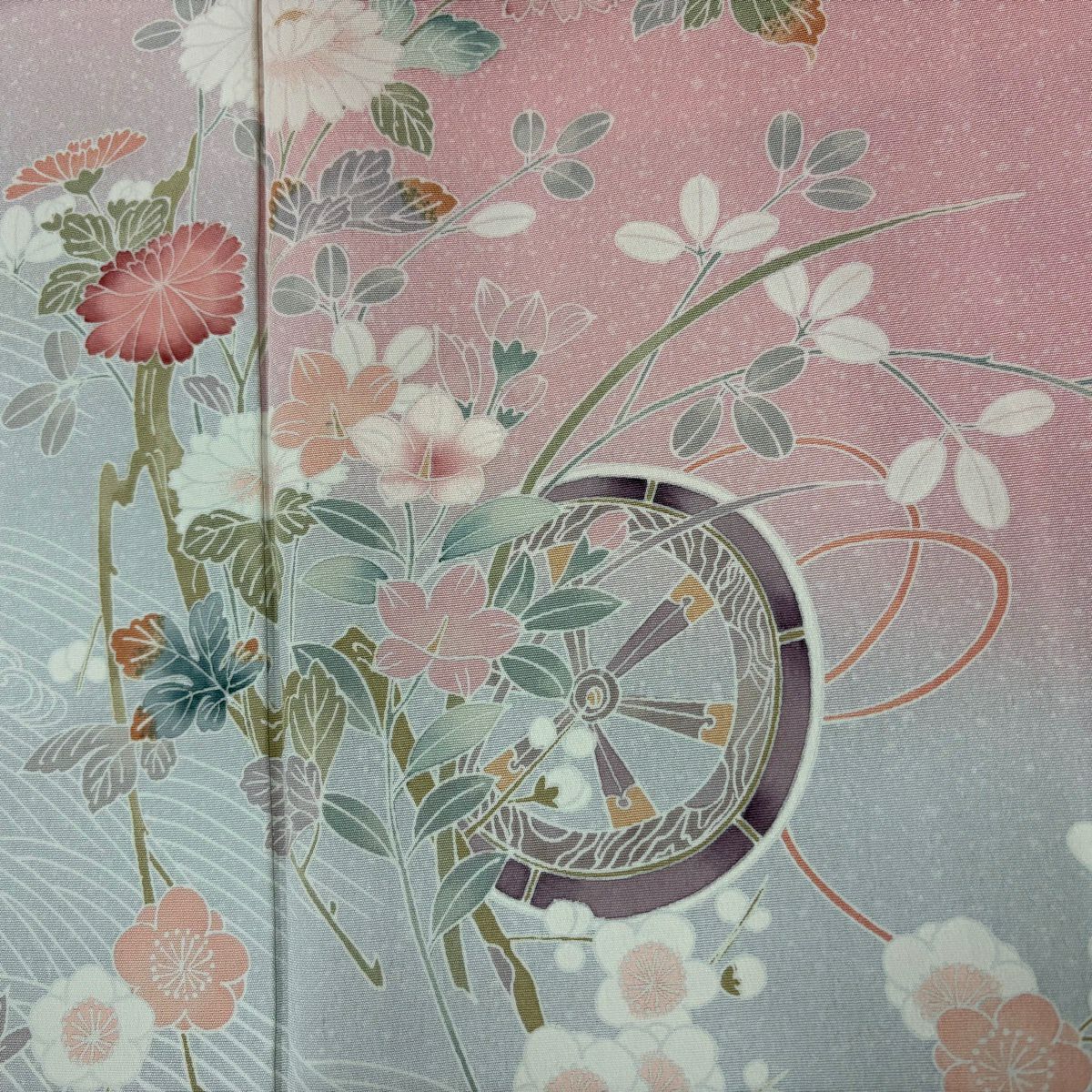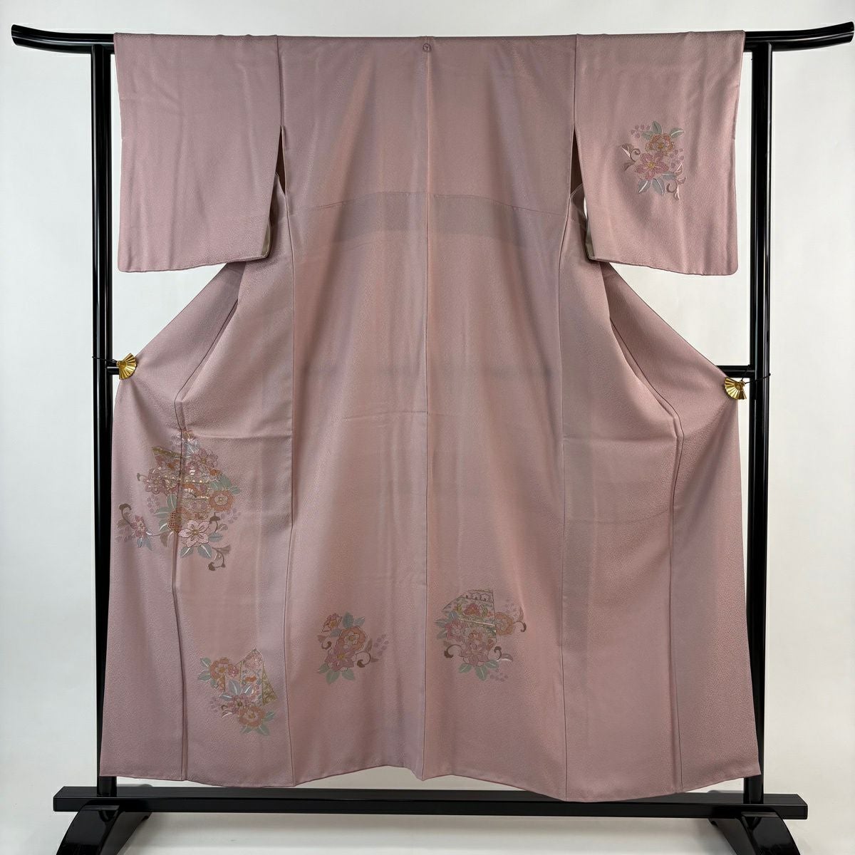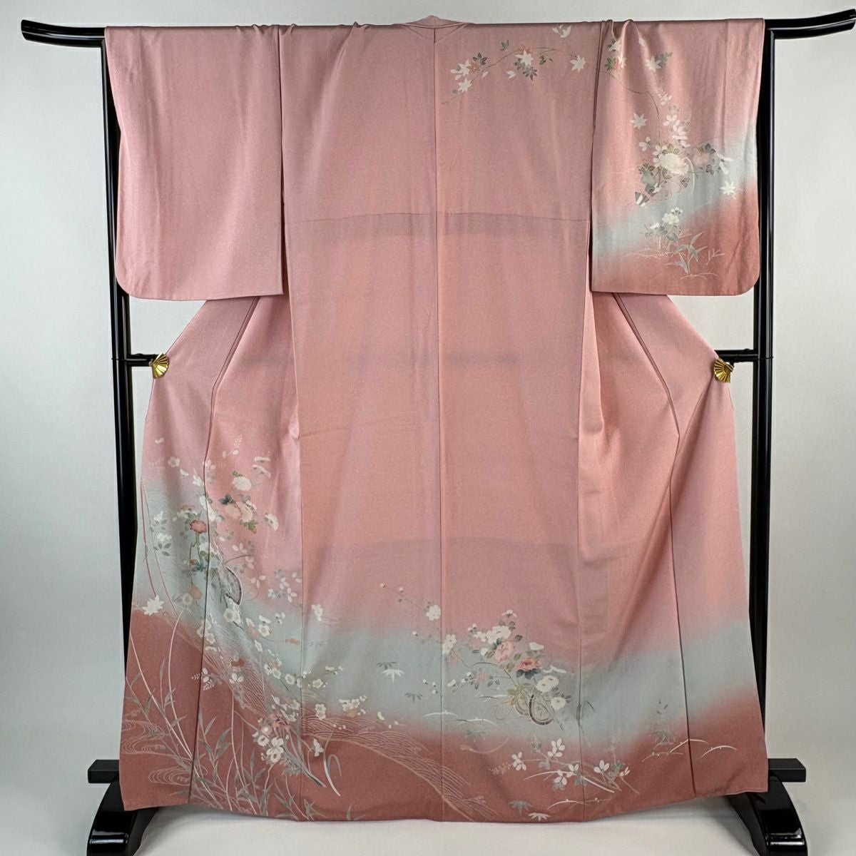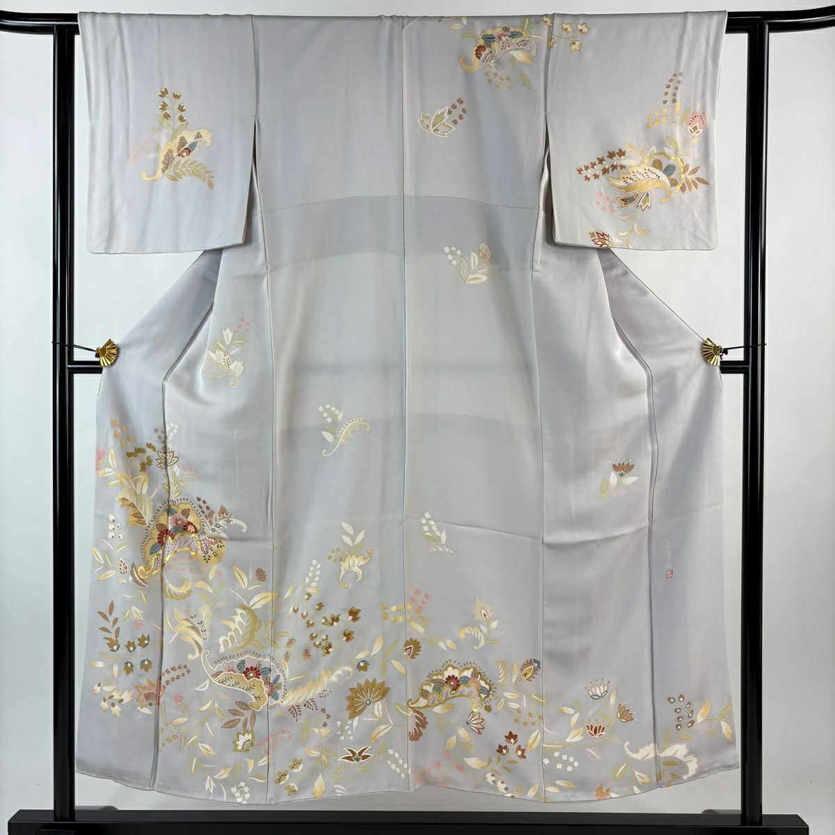 70%OFF 訪問着 身丈165cm 裄丈66.5cm M 袷 扇面 草花 金彩 ぼかし 青灰色 正絹 秀品 K70
