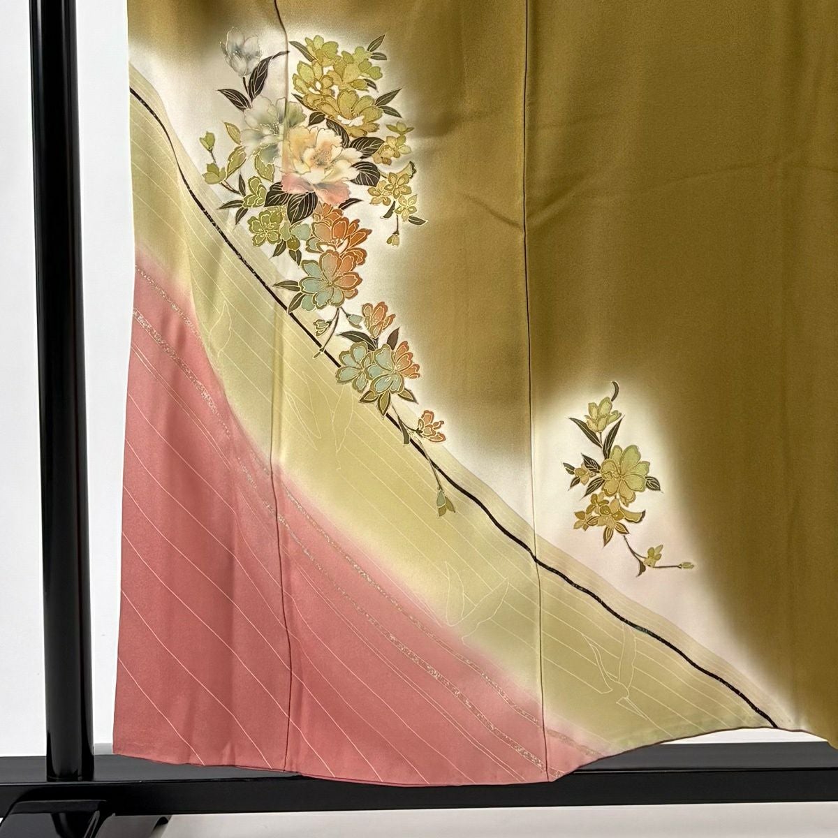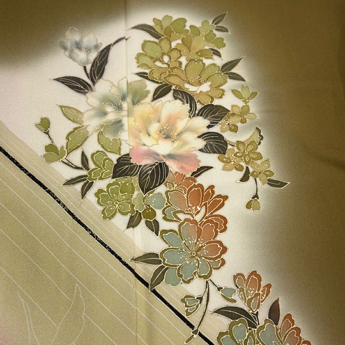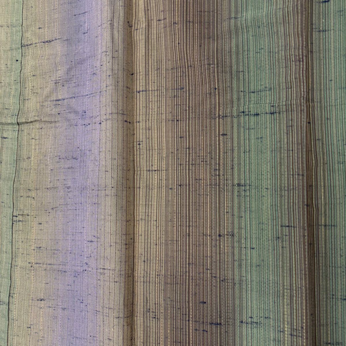 70%OFF 付下げ 身丈157cm 裄丈66cm M 袷 枝花 斜縞 金銀彩 染め分け 鶯色 正絹 秀品 K70