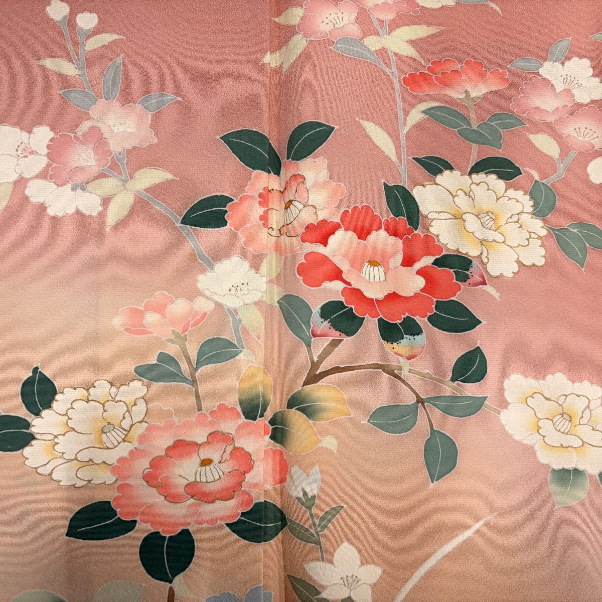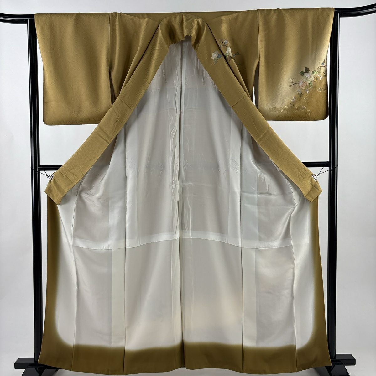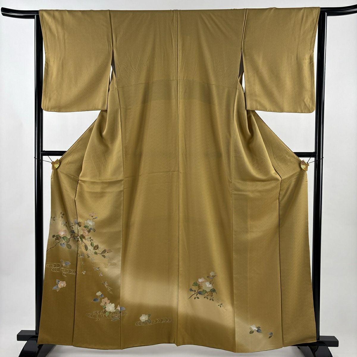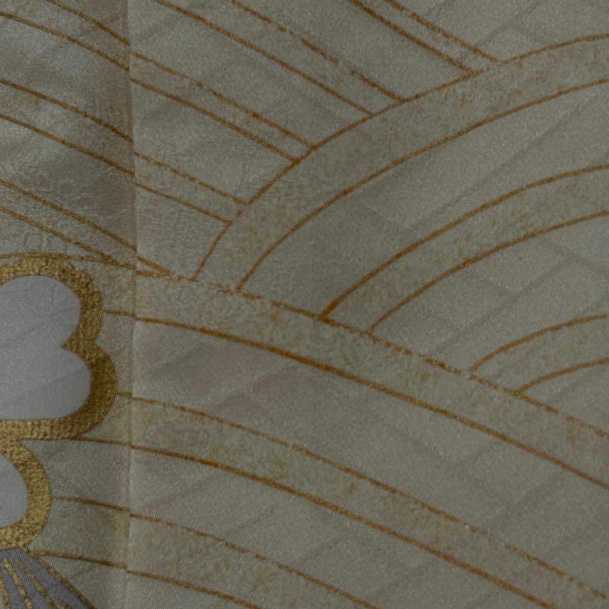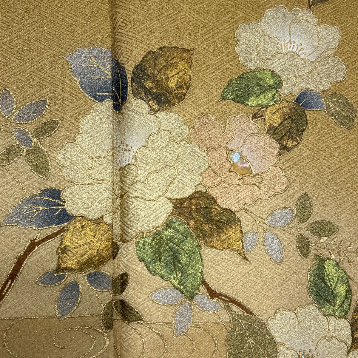 70%OFF 付下げ 身丈162cm 裄丈64cm M 袷 椿 観世水 螺鈿 金銀彩 薄黄土色 正絹 秀品 K70