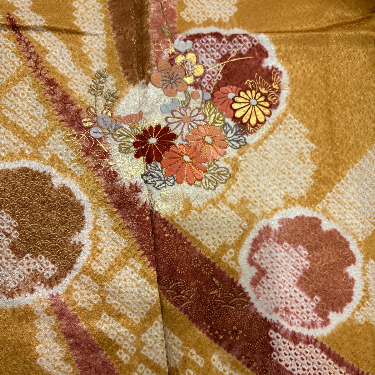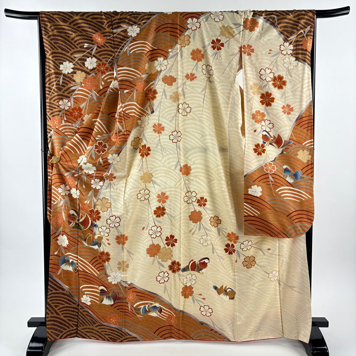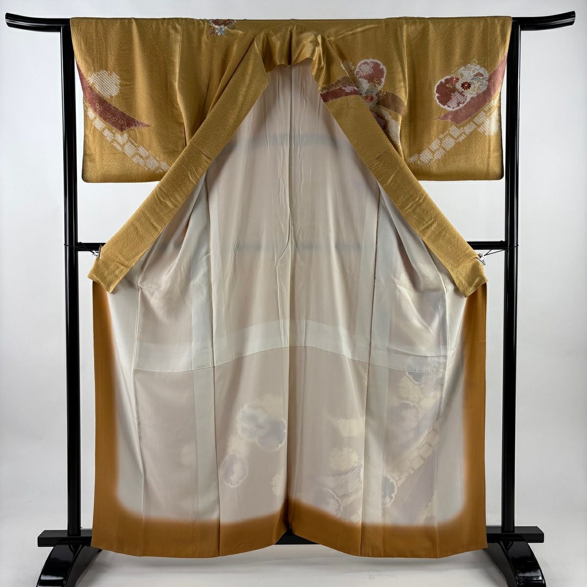 70%OFF 【美品】 振袖 身丈162cm 裄丈67cm M 袷 鶴 梅 金糸 金彩 山吹茶色 正絹 秀品 K70