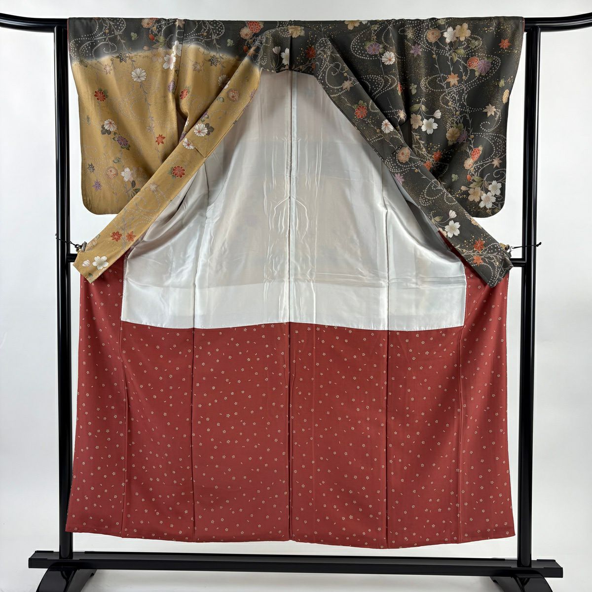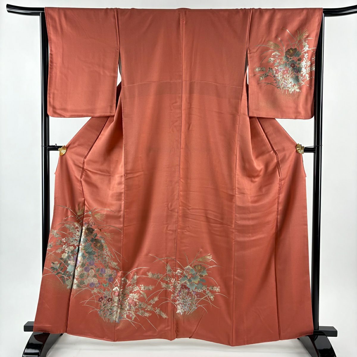 70%OFF 訪問着 身丈166cm 裄丈65.5cm M 袷 花器 花唐草 金銀彩 金糸 薄茶色 正絹 秀品 K70