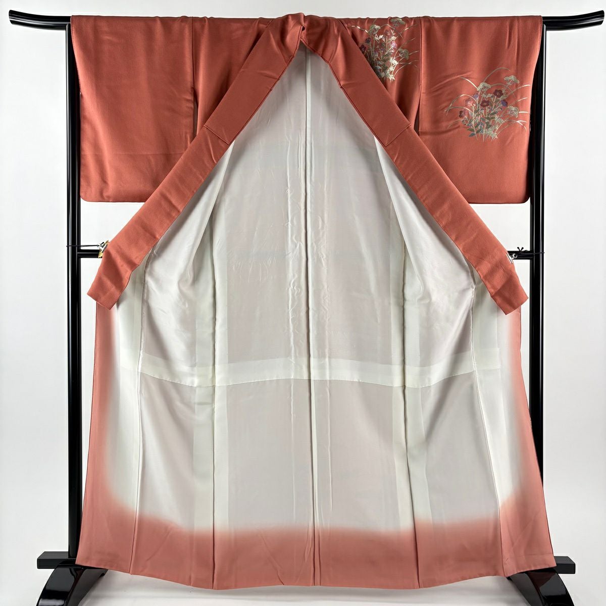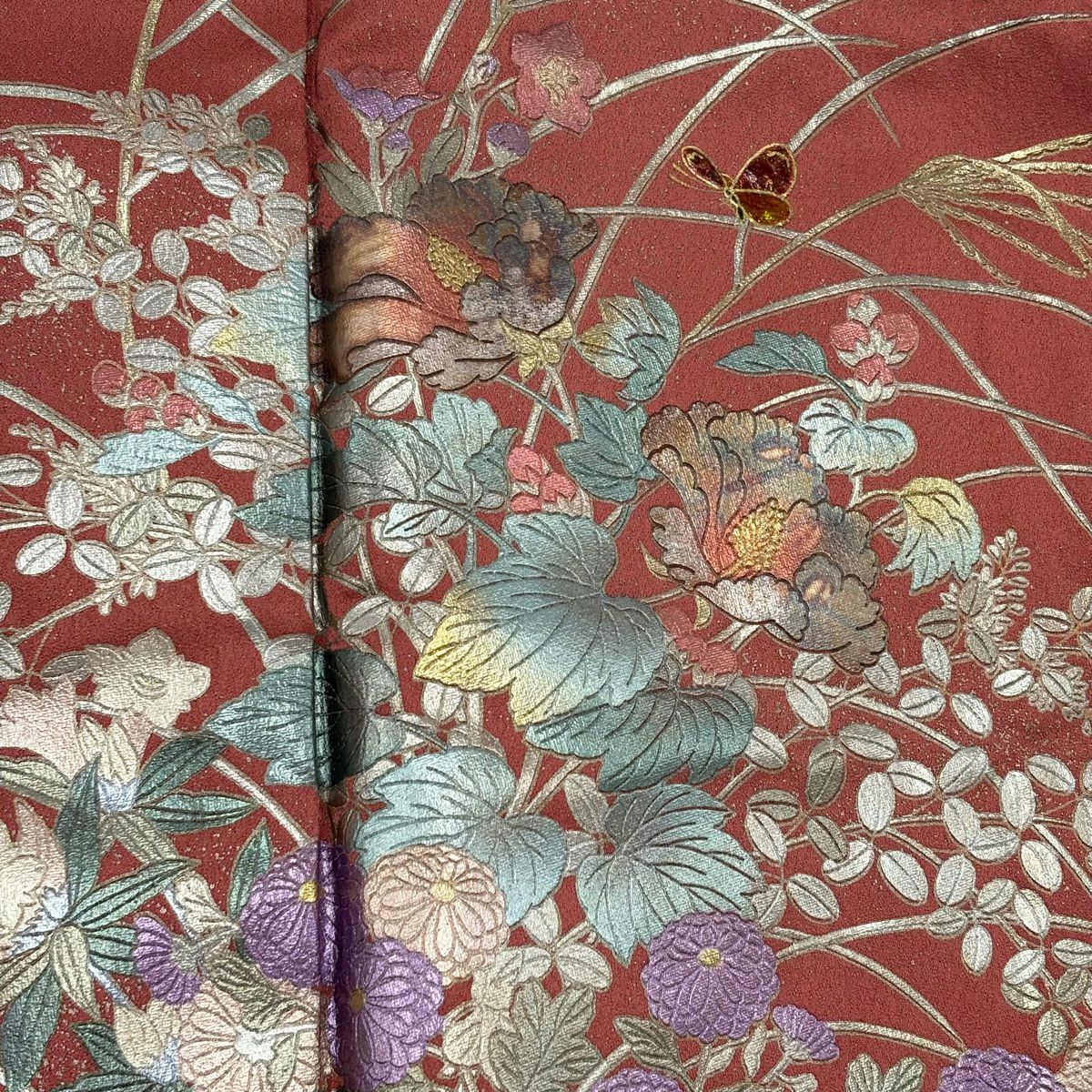 70%OFF 付下げ 身丈161cm 裄丈64cm M 袷 落款あり 葉 実 刺繍 金彩 赤茶 正絹 秀品 K70
