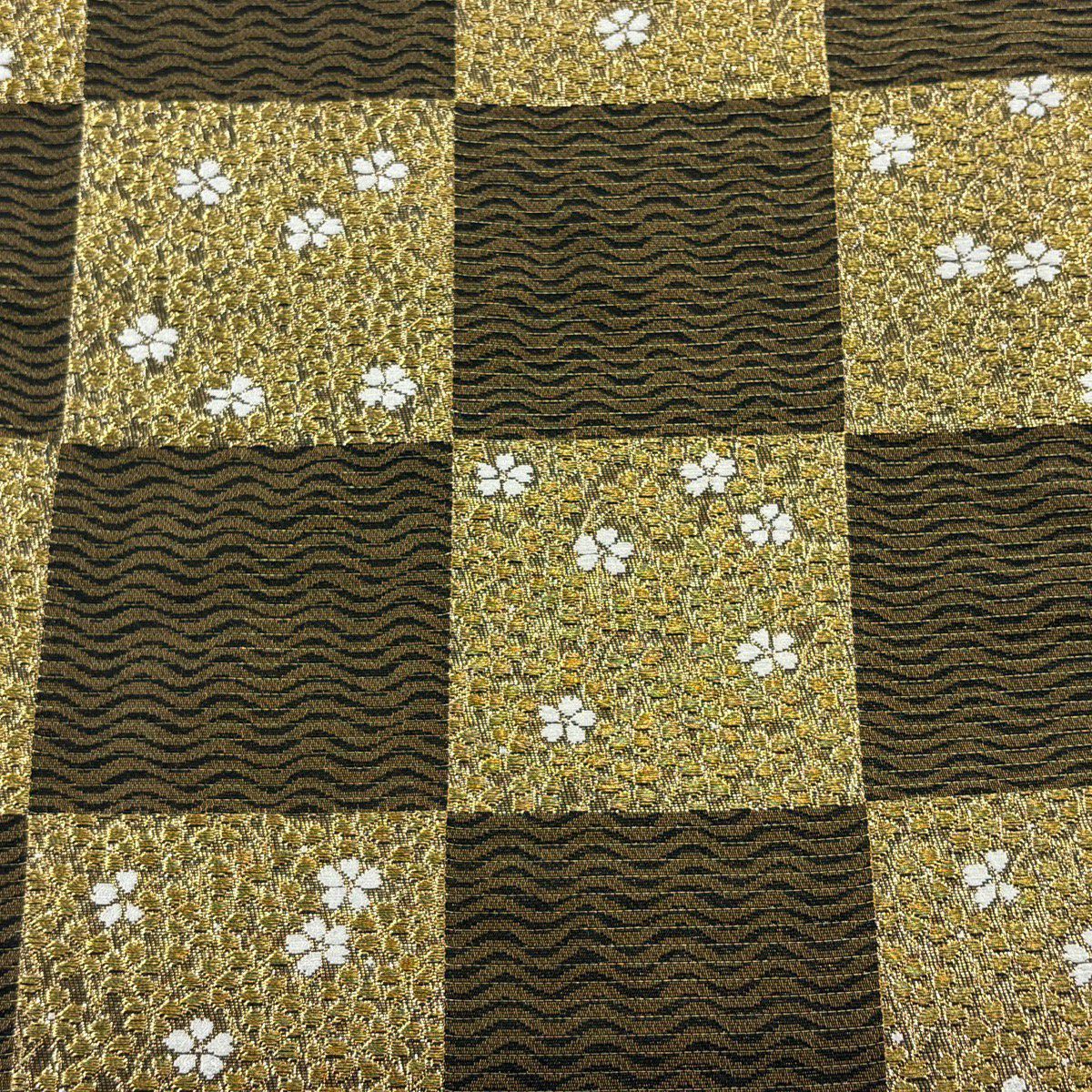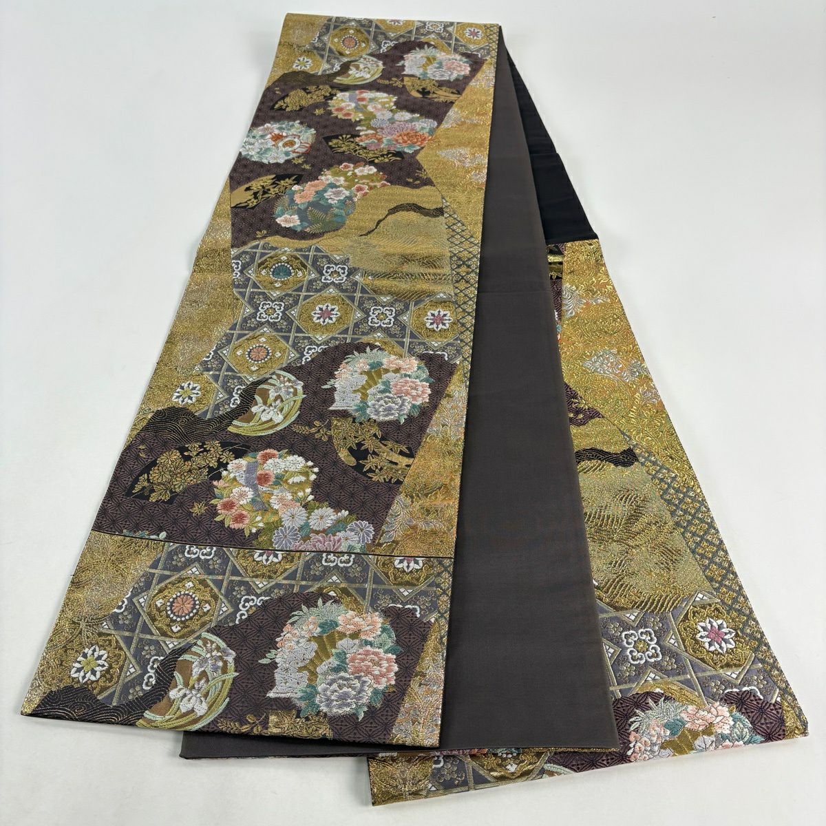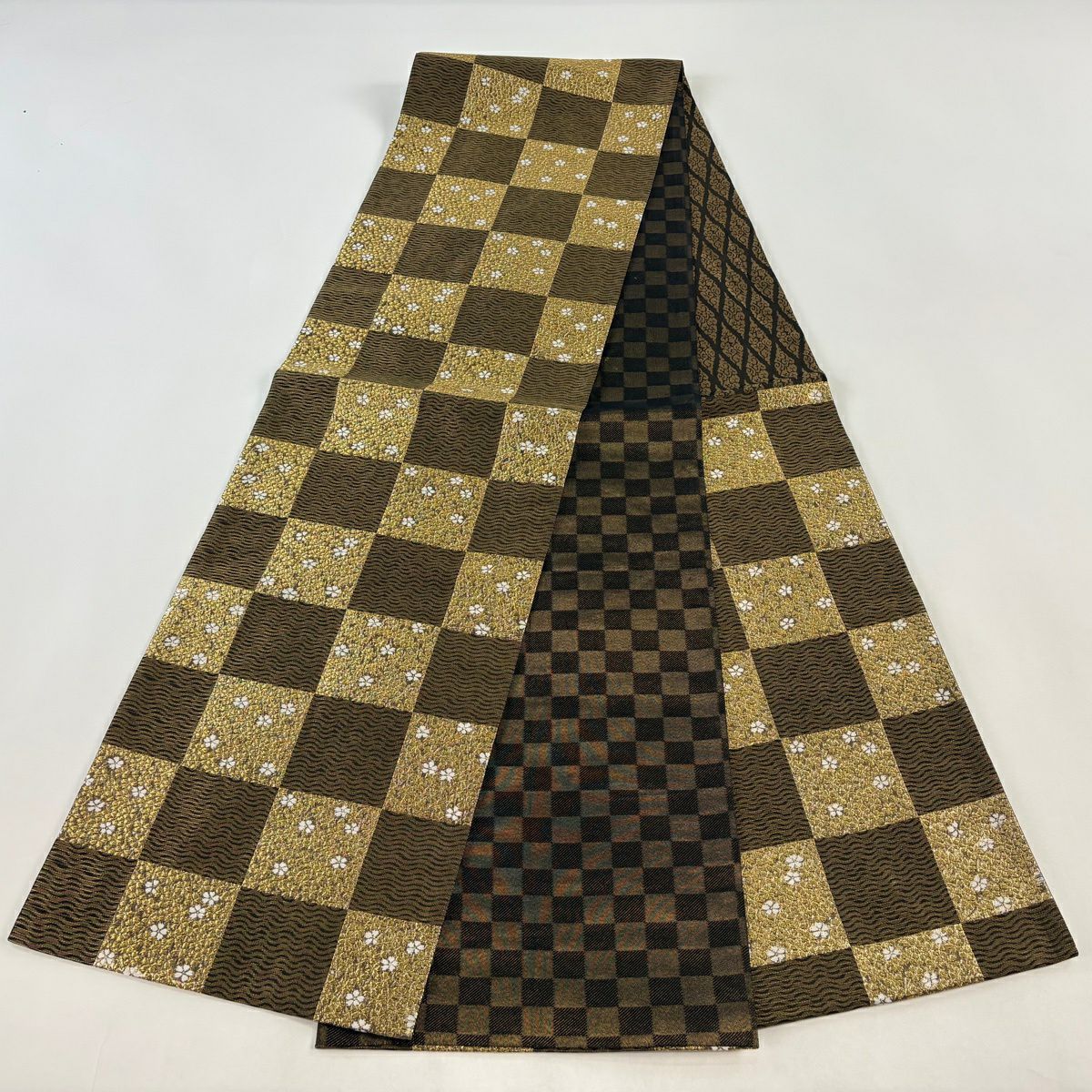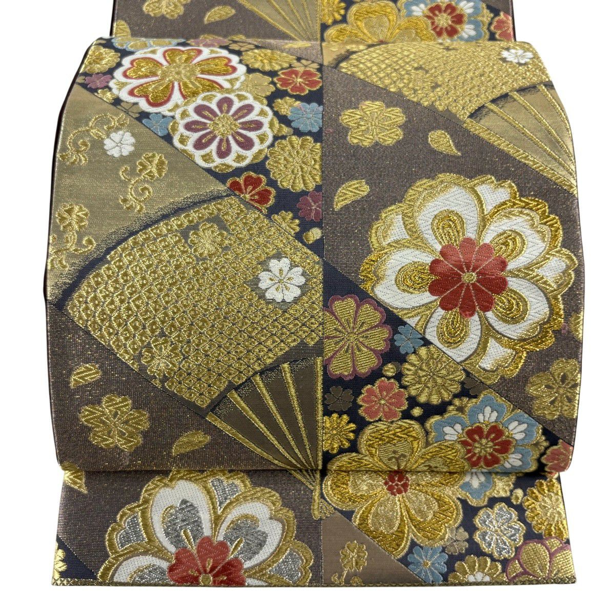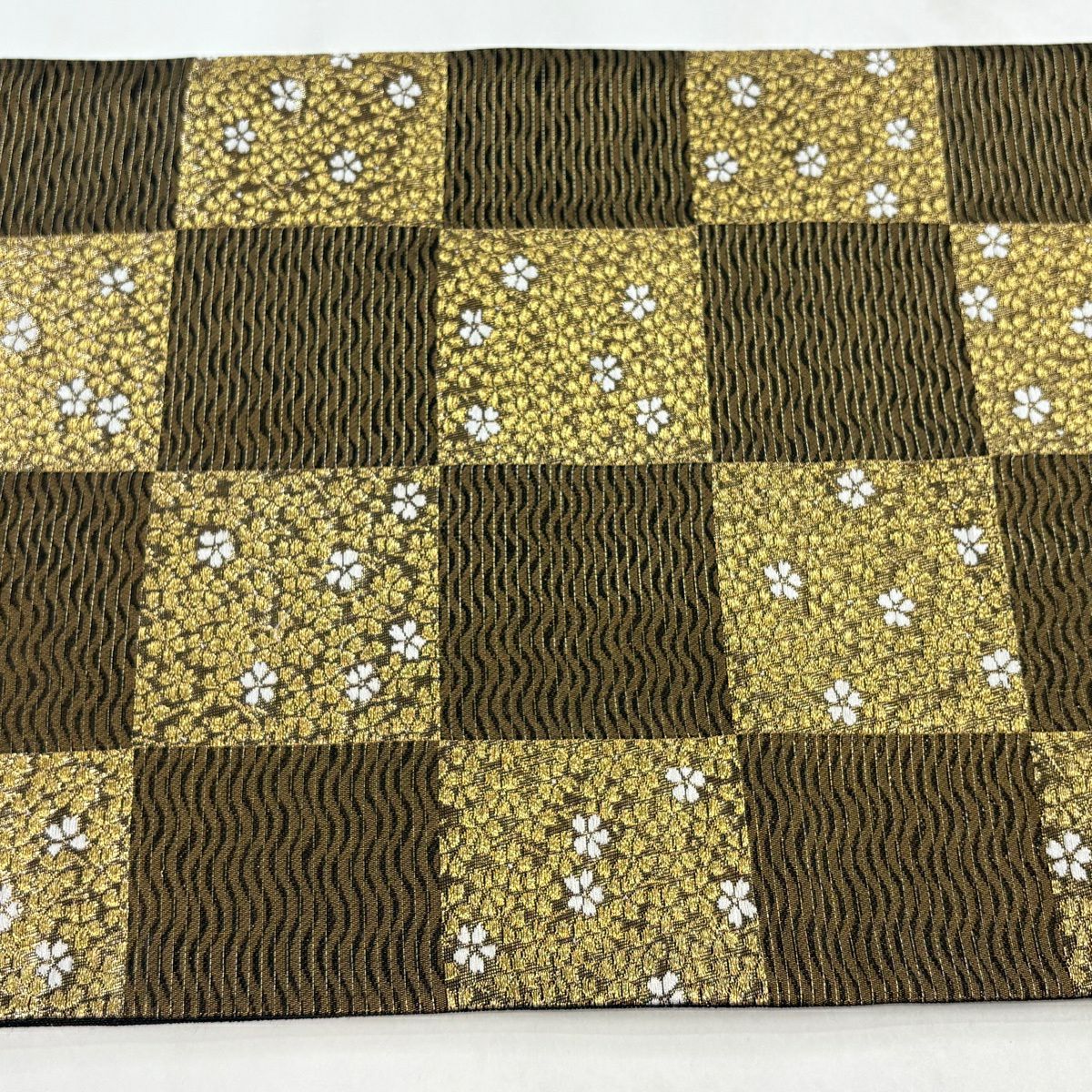 【美品】 袋帯 秀品 市松 桜 金糸 箔 茶色 六通 正絹