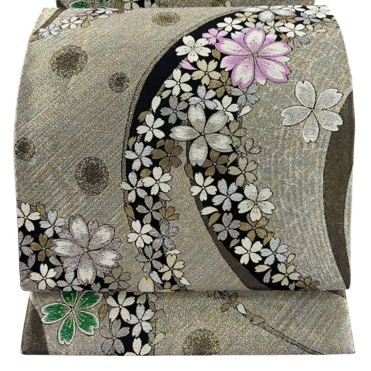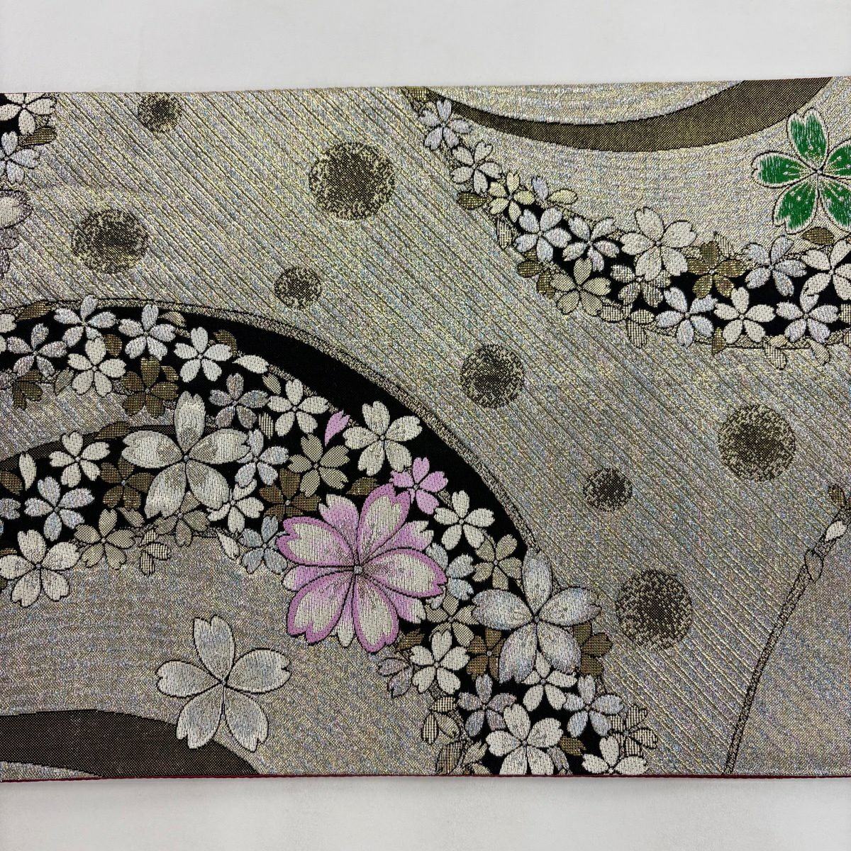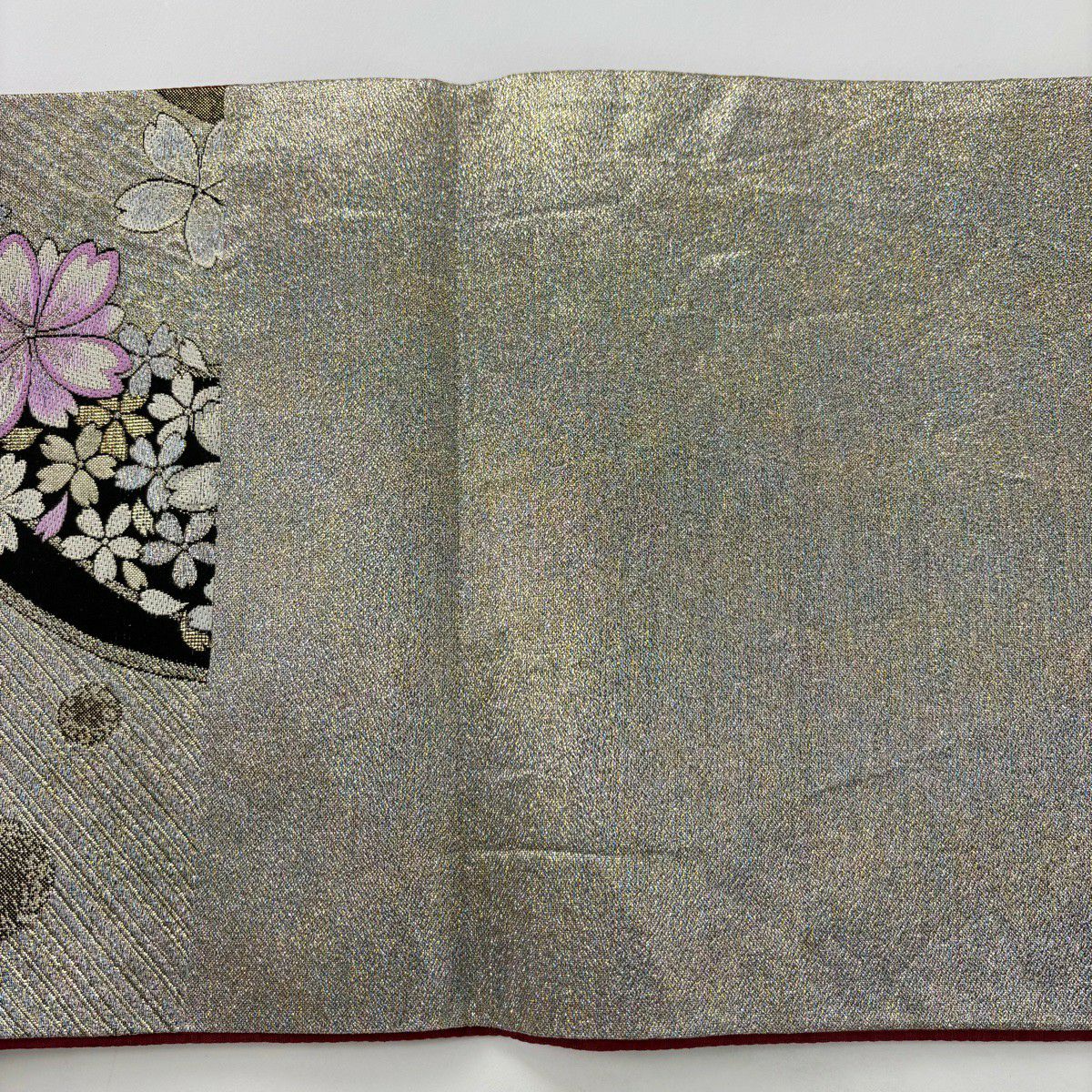 【美品】 袋帯 秀品 桜 扇 金銀彩 箔 黒灰 六通 正絹