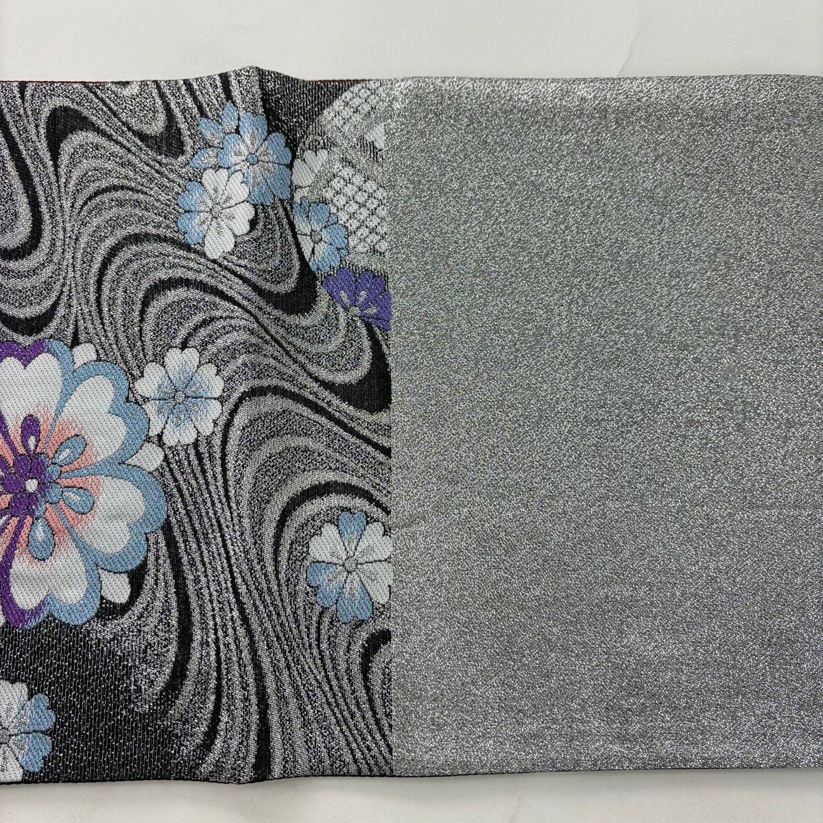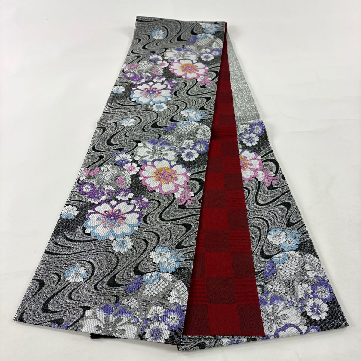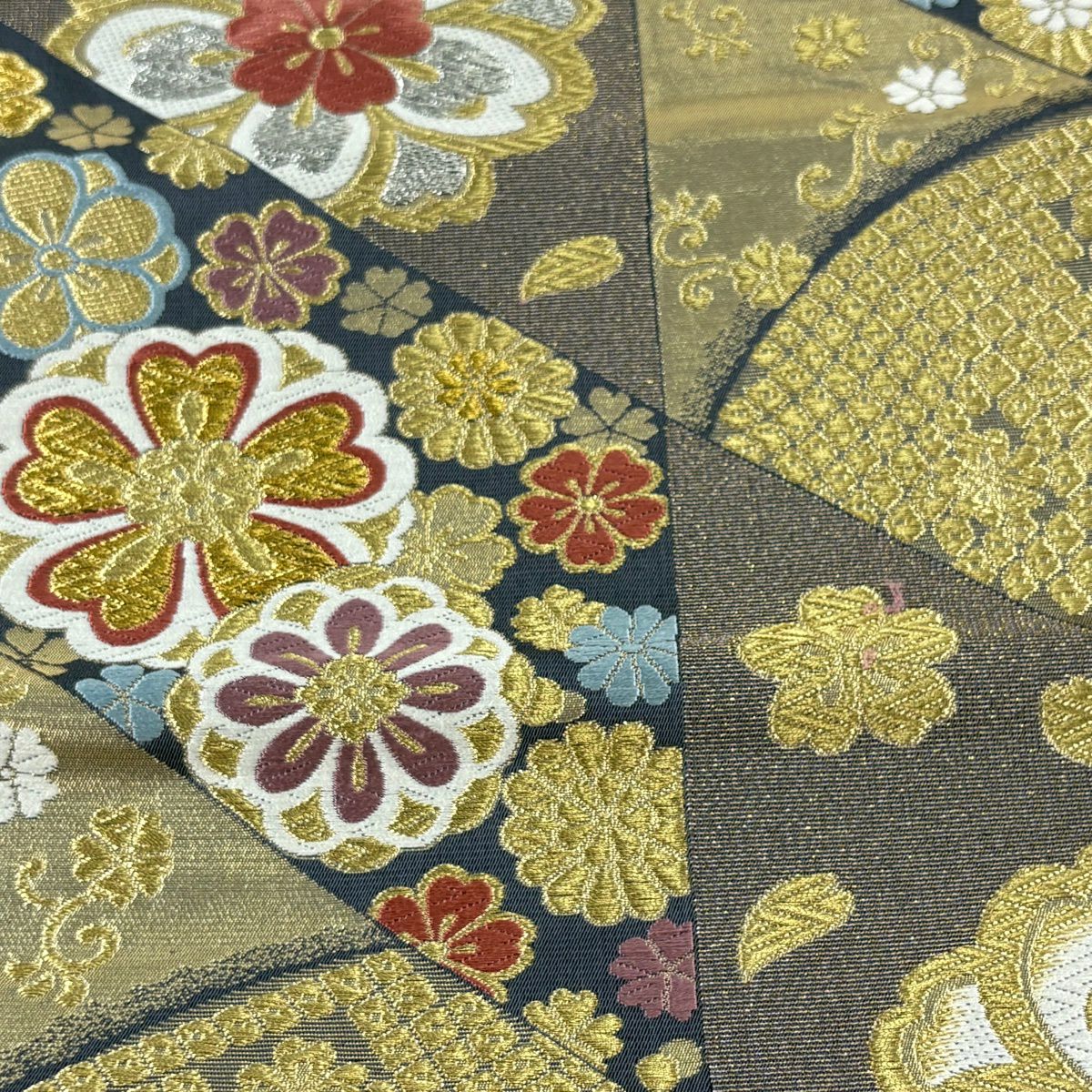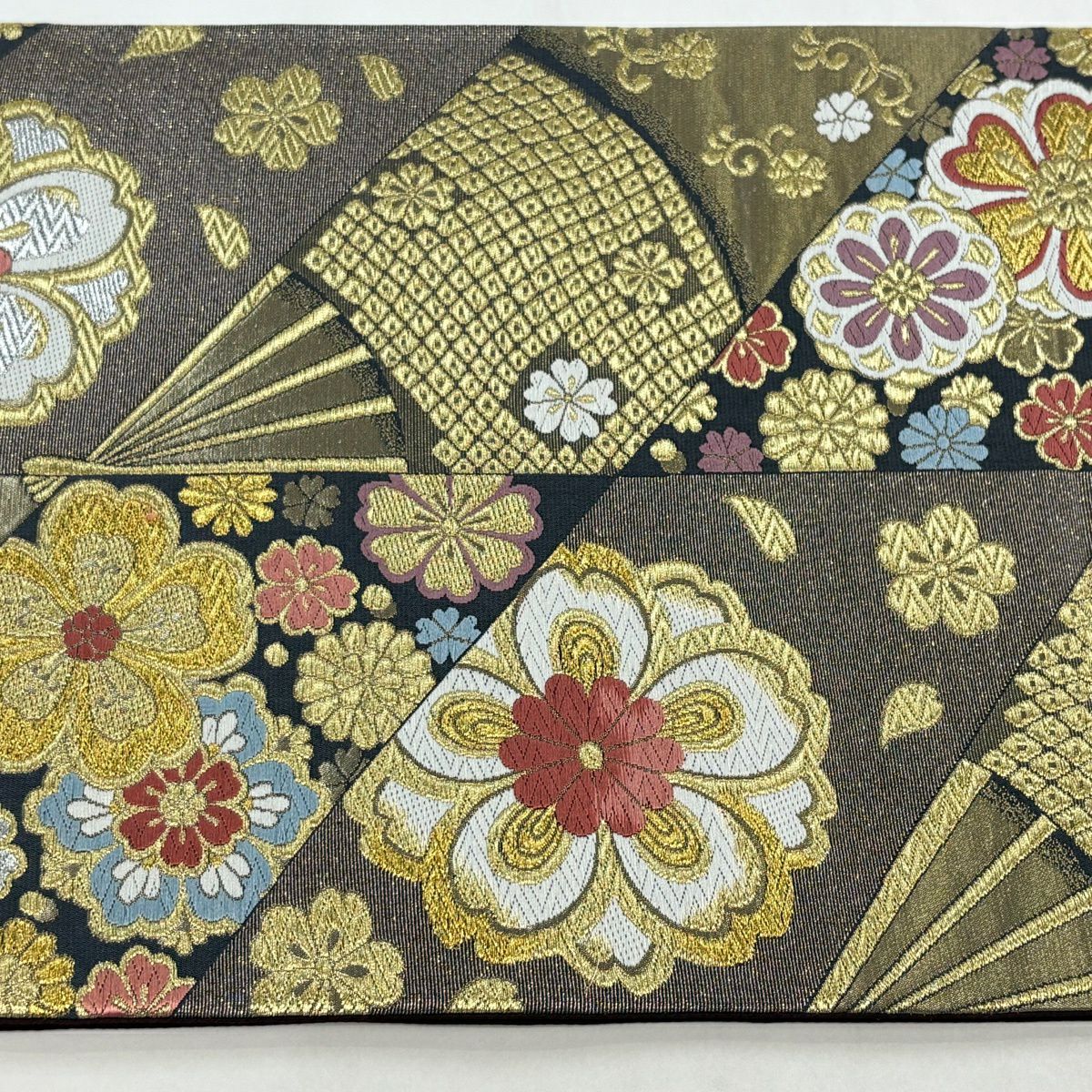 【美品】 袋帯 秀品 桜 扇 金銀彩 箔 黒灰 六通 正絹