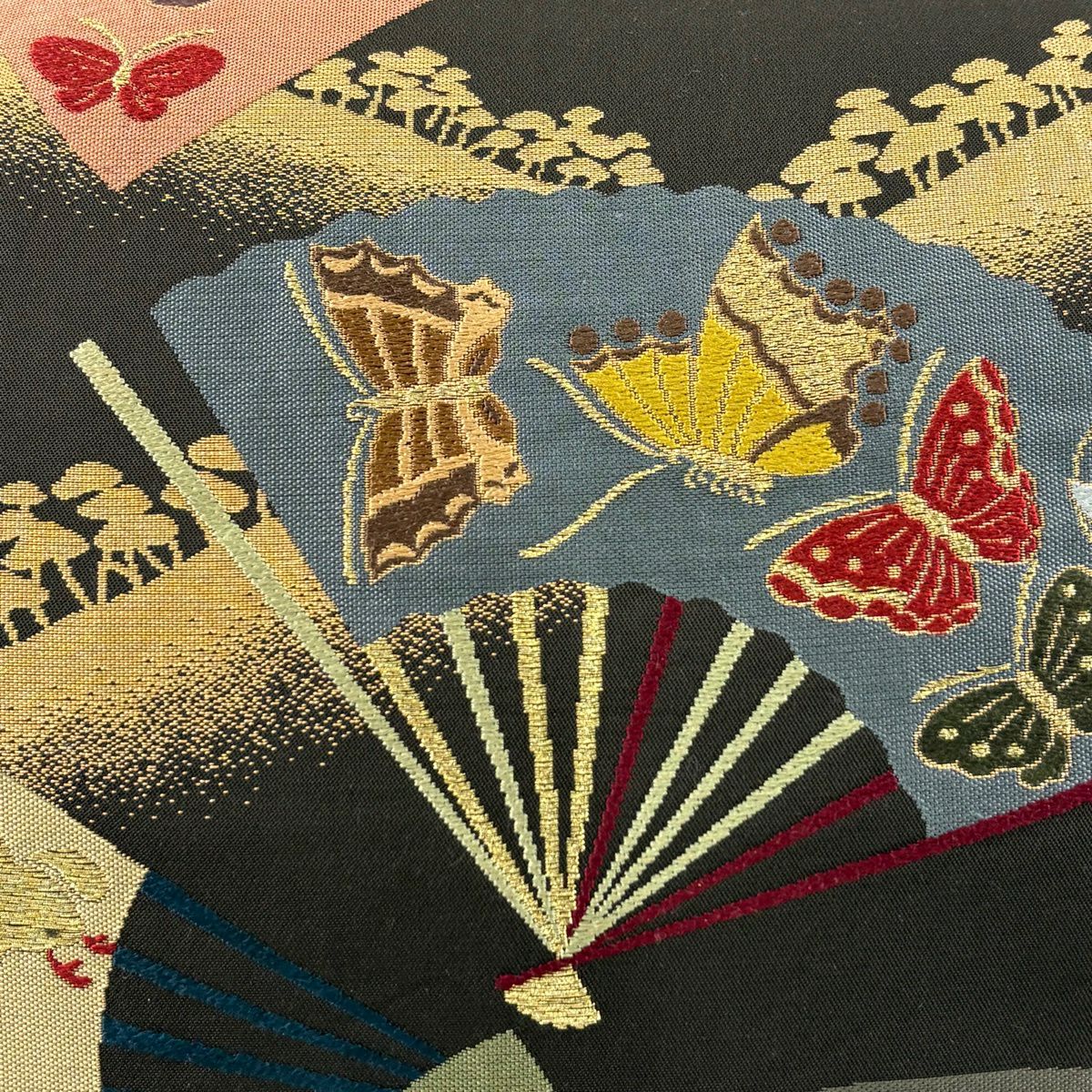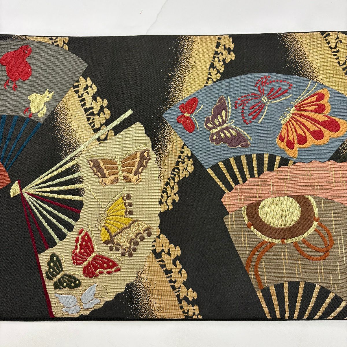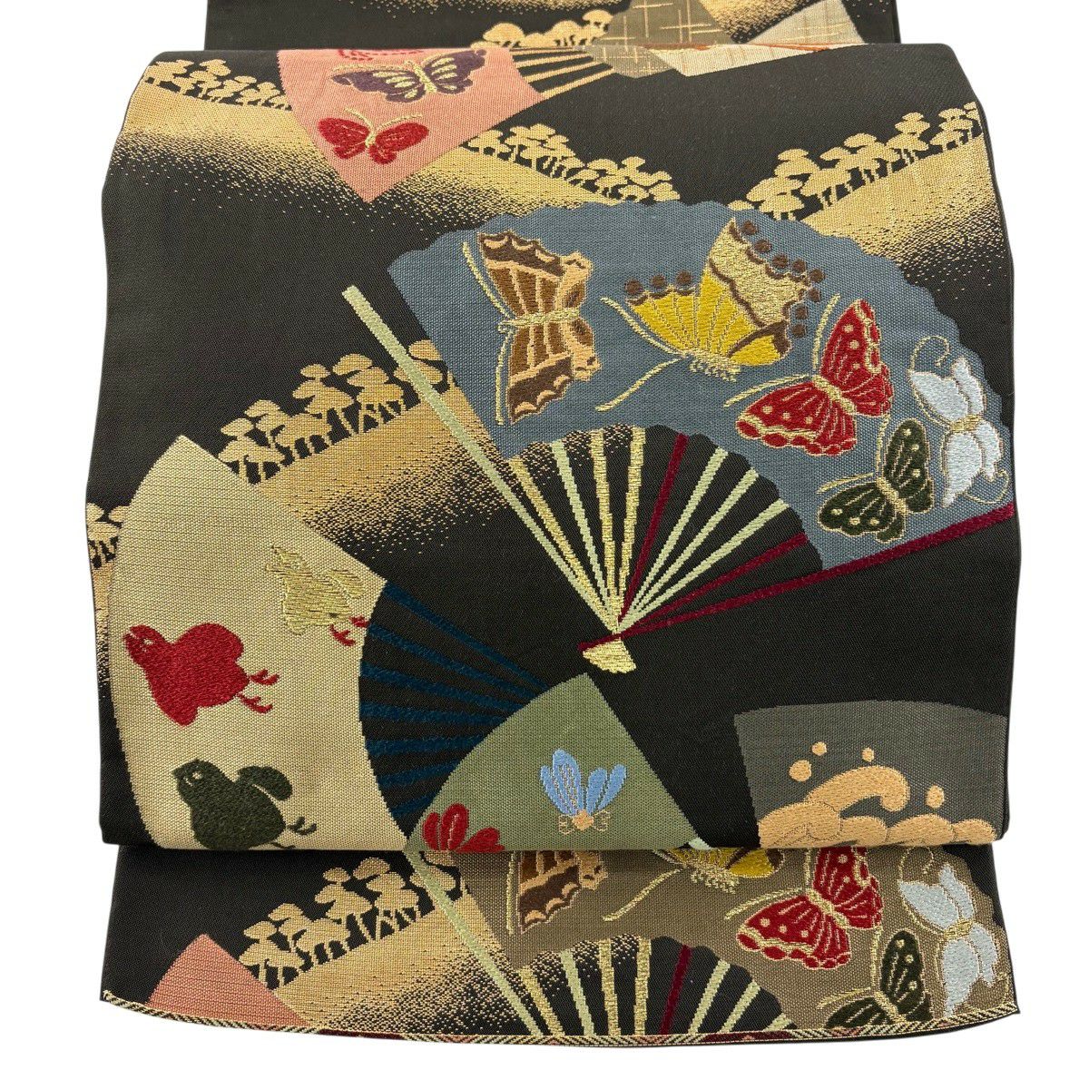 袋帯 秀品 関西仕立て 扇 蝶 金糸 箔 墨色 六通 正絹