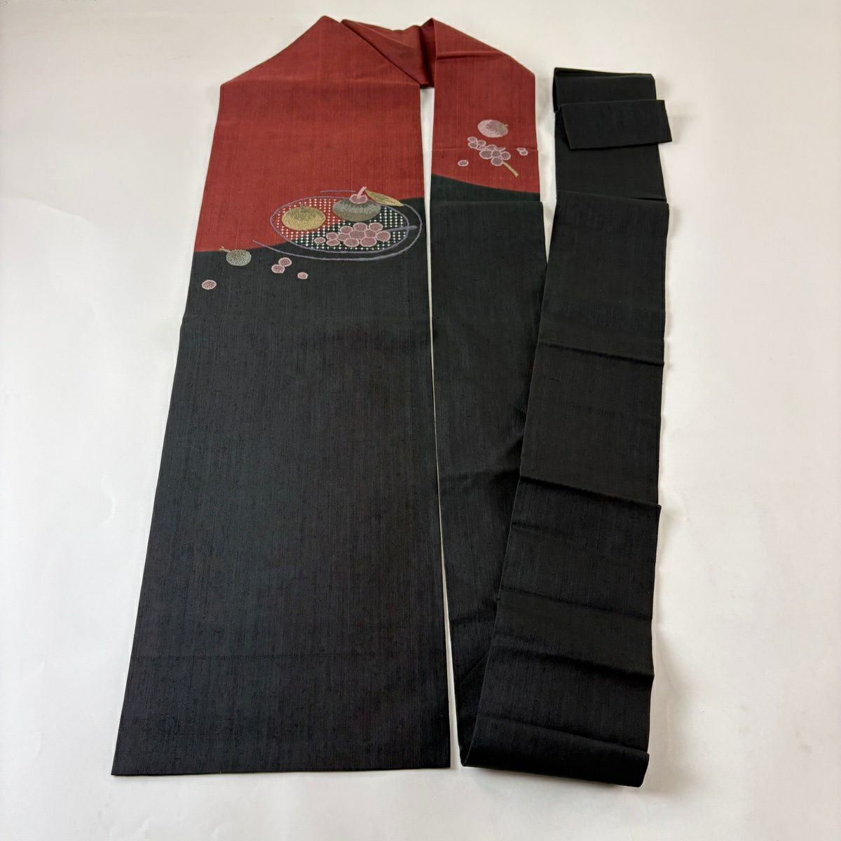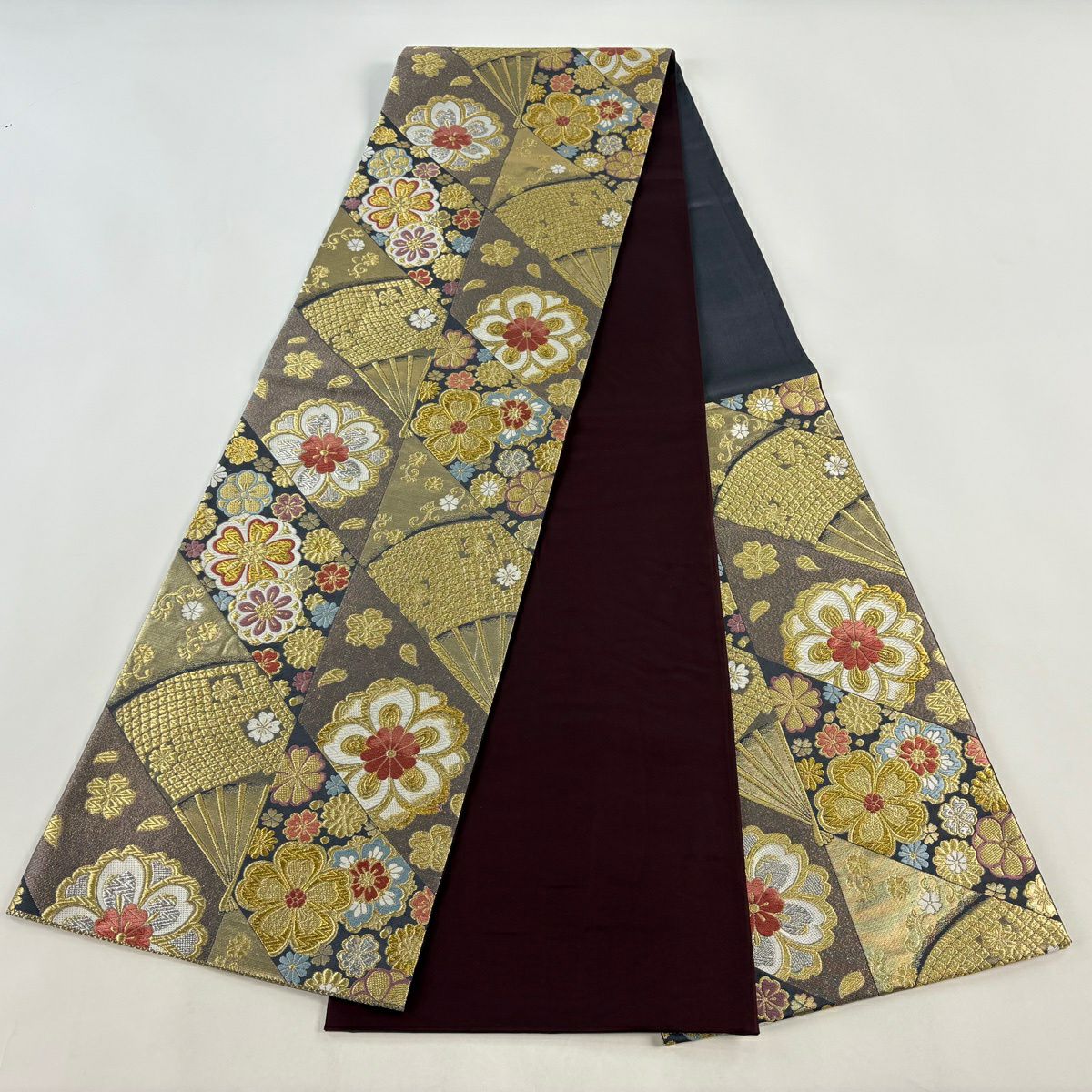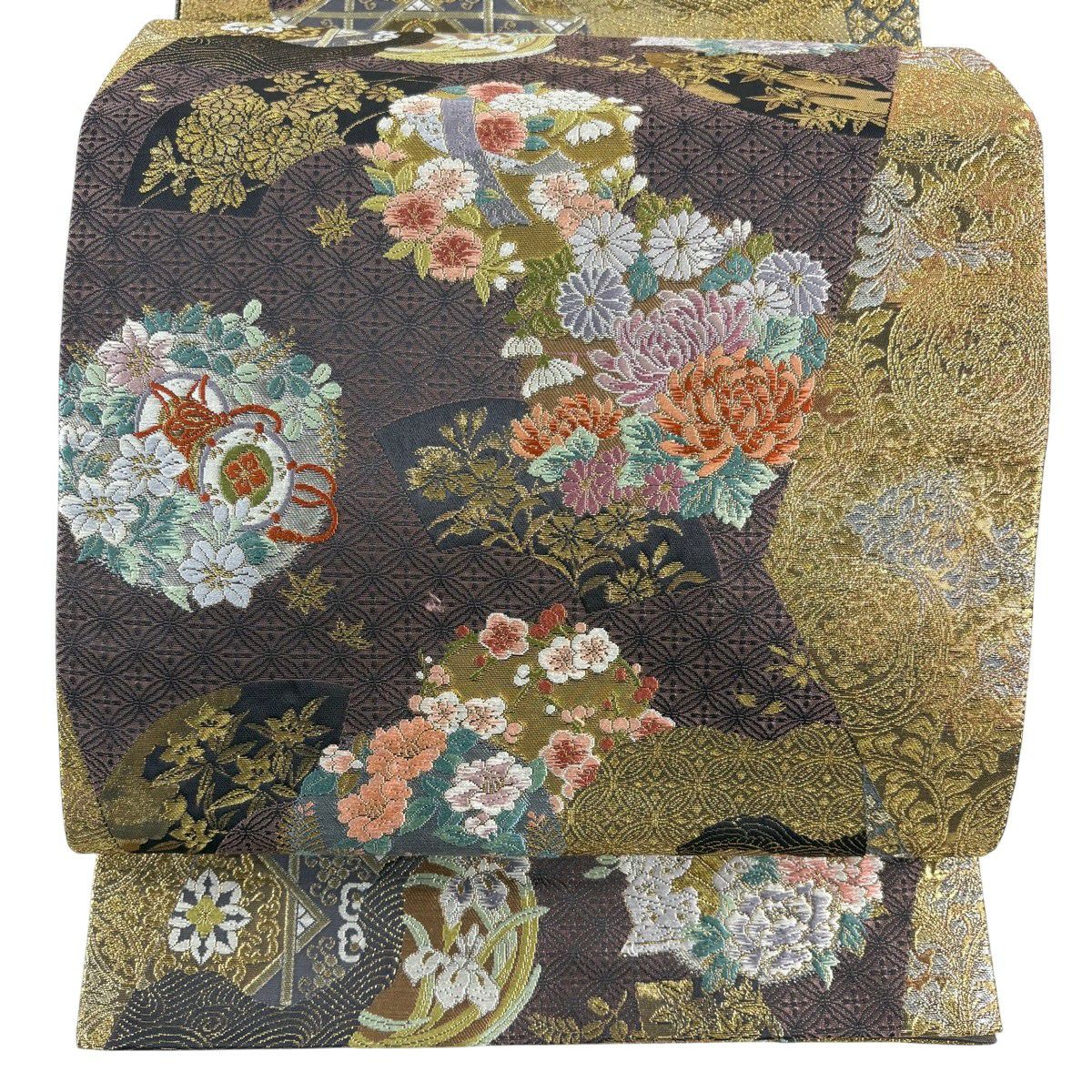 袋帯 秀品 関西仕立て 扇 蝶 金糸 箔 墨色 六通 正絹