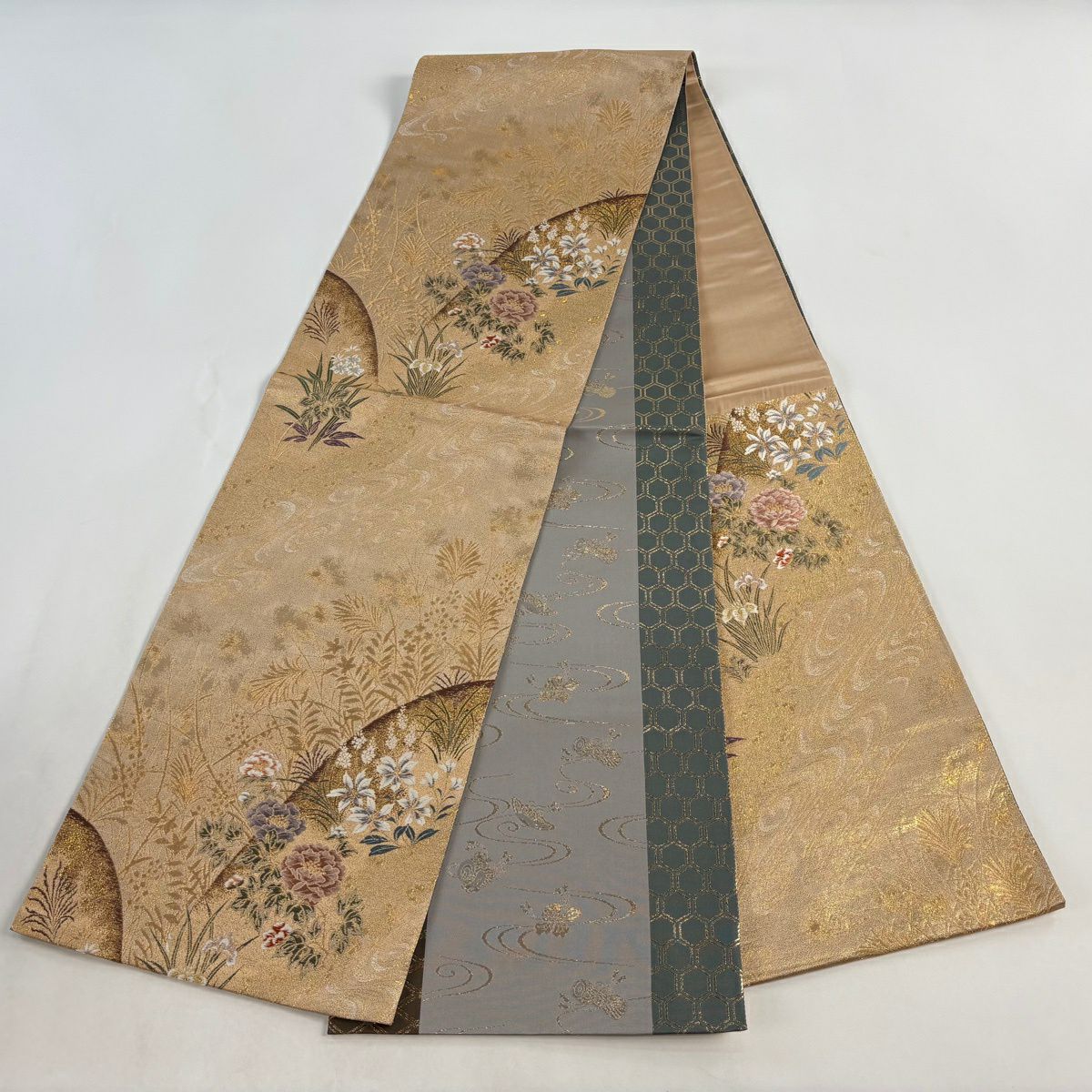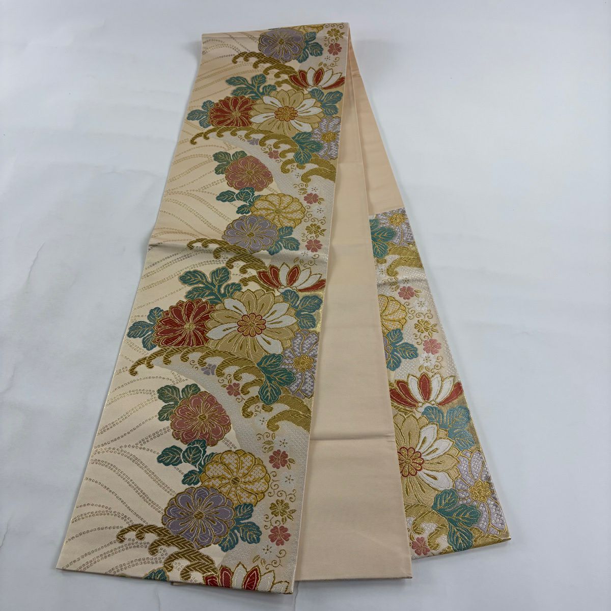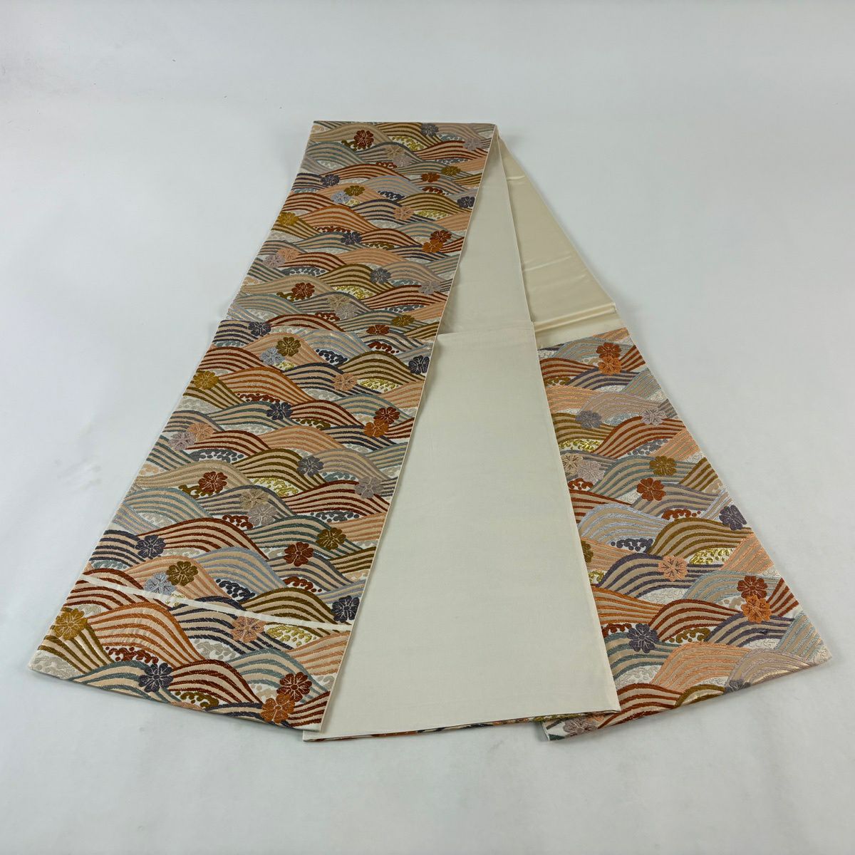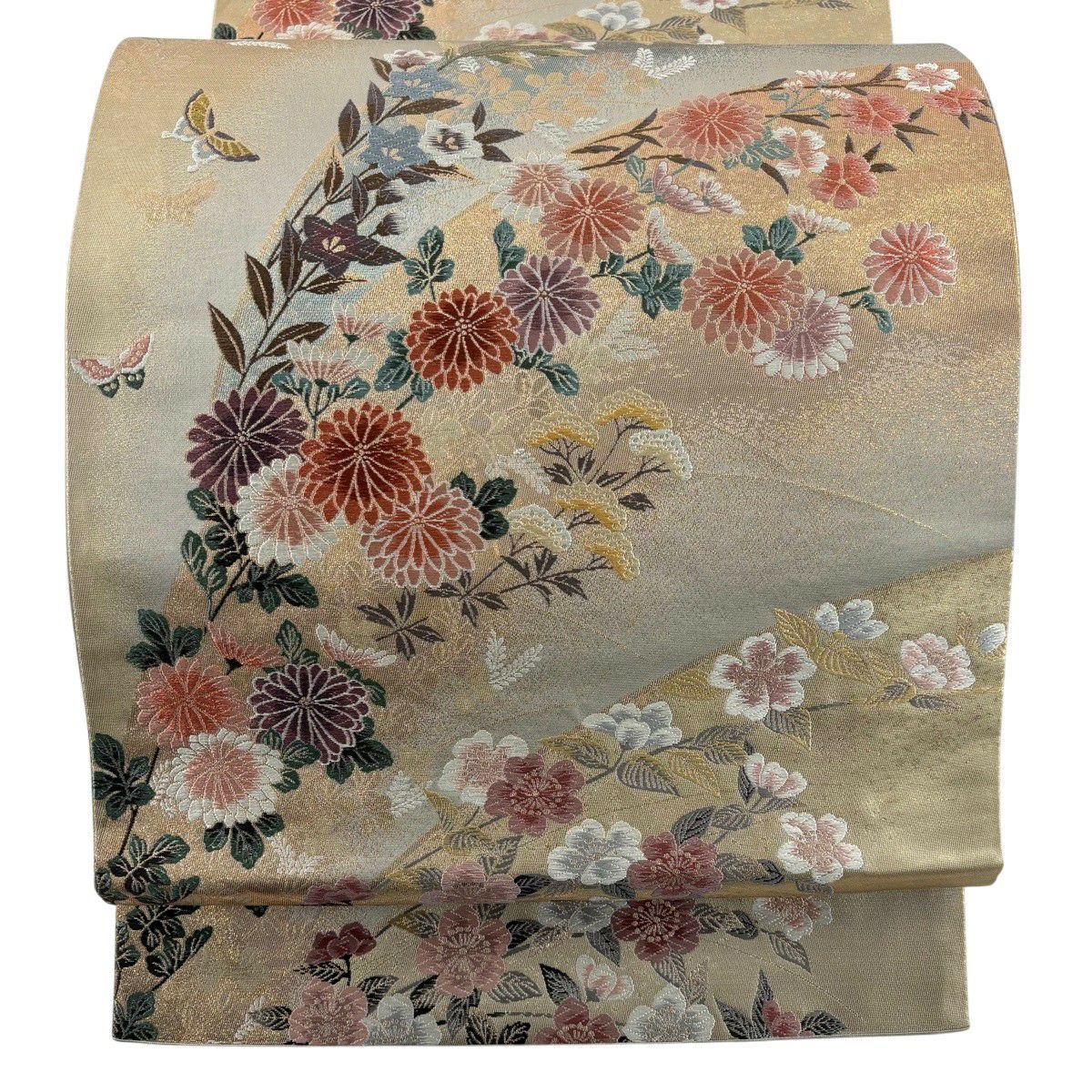 袋帯 秀品 桜 波頭 刺繍 金糸 ベージュ 六通 正絹