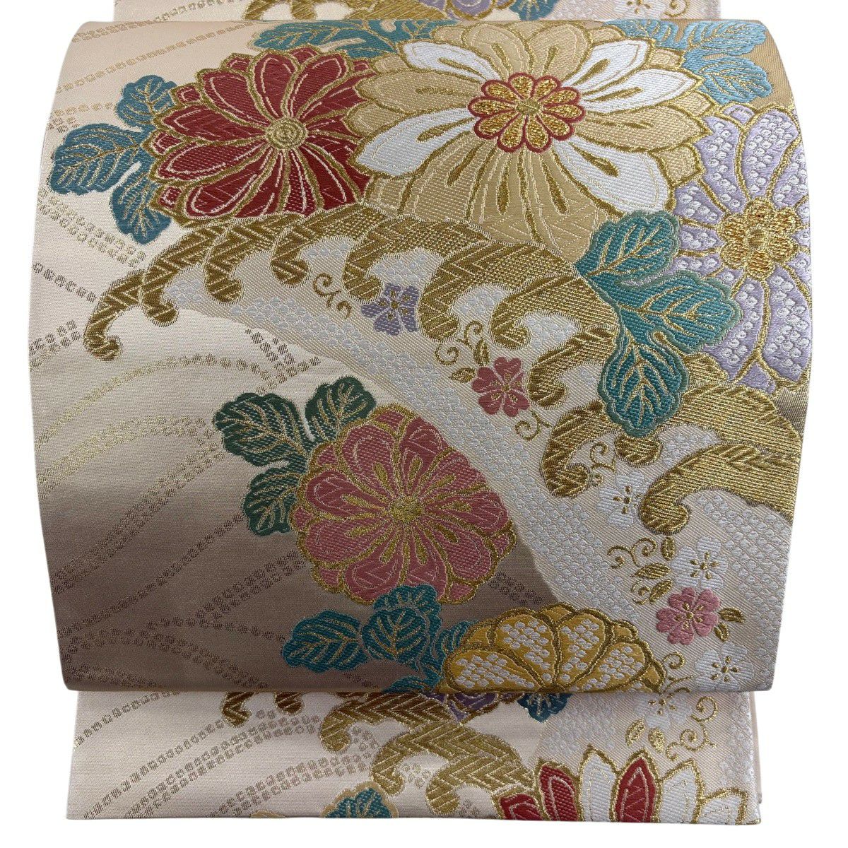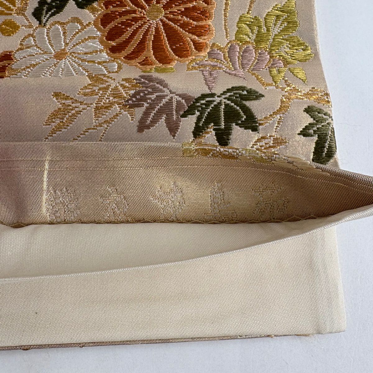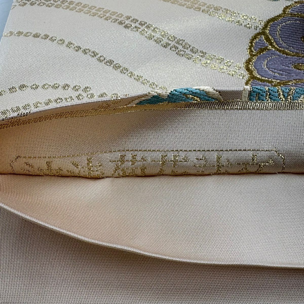 袋帯 秀品 桜 波頭 刺繍 金糸 ベージュ 六通 正絹