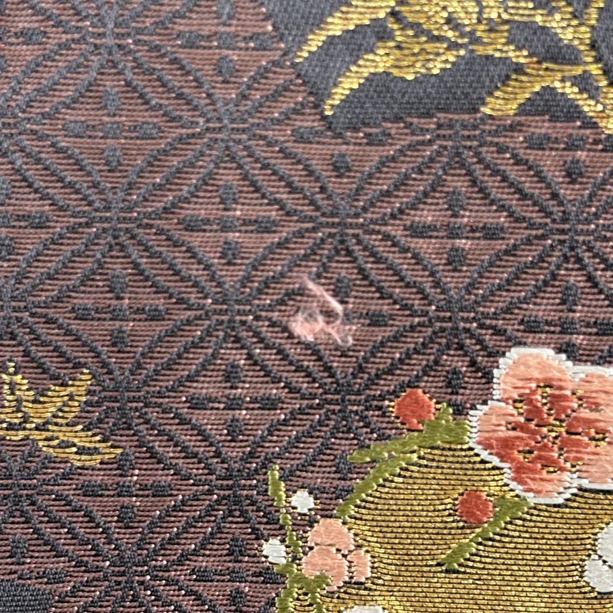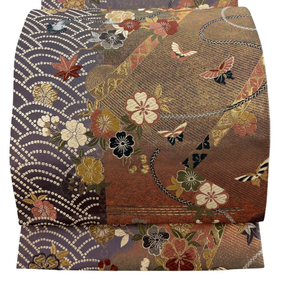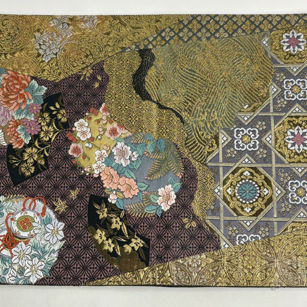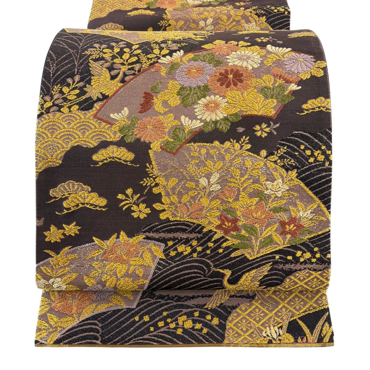 【美品】 袋帯 秀品 扇面 鶴 金糸 箔 茶紫 六通 正絹