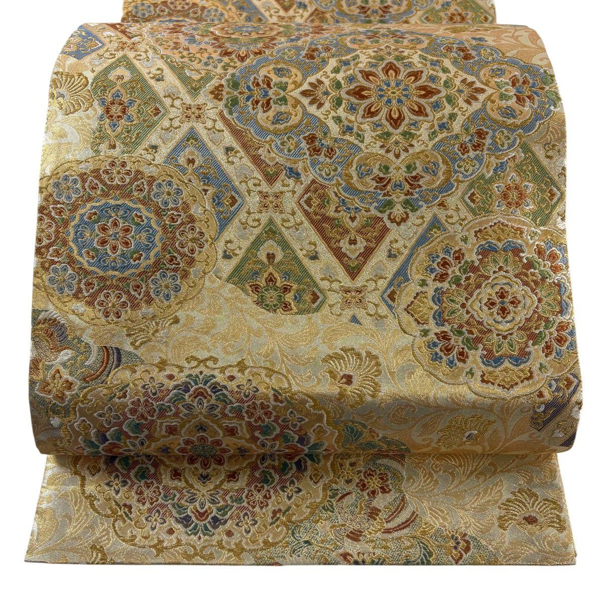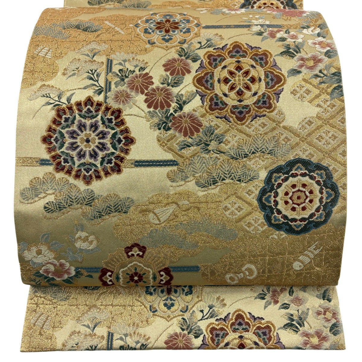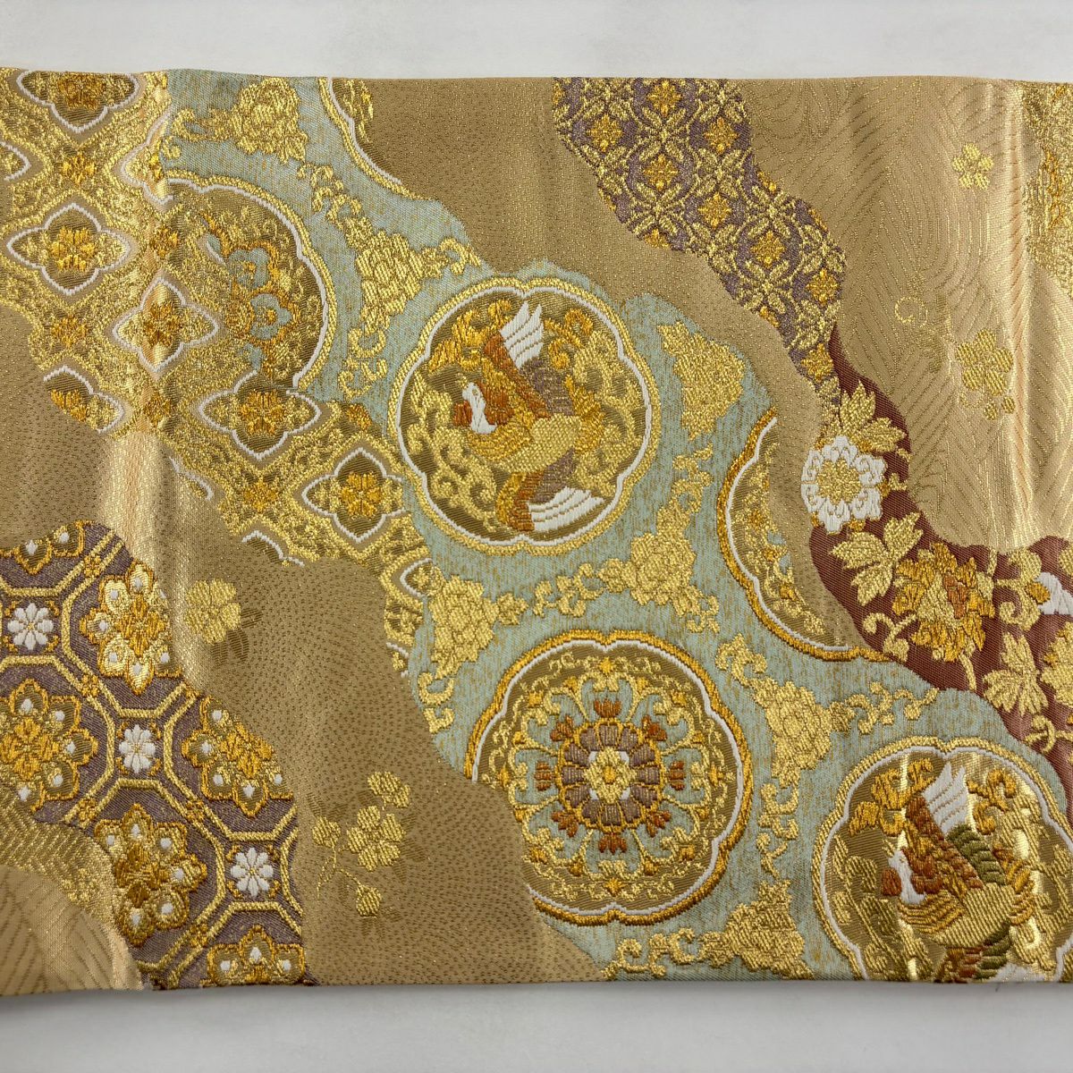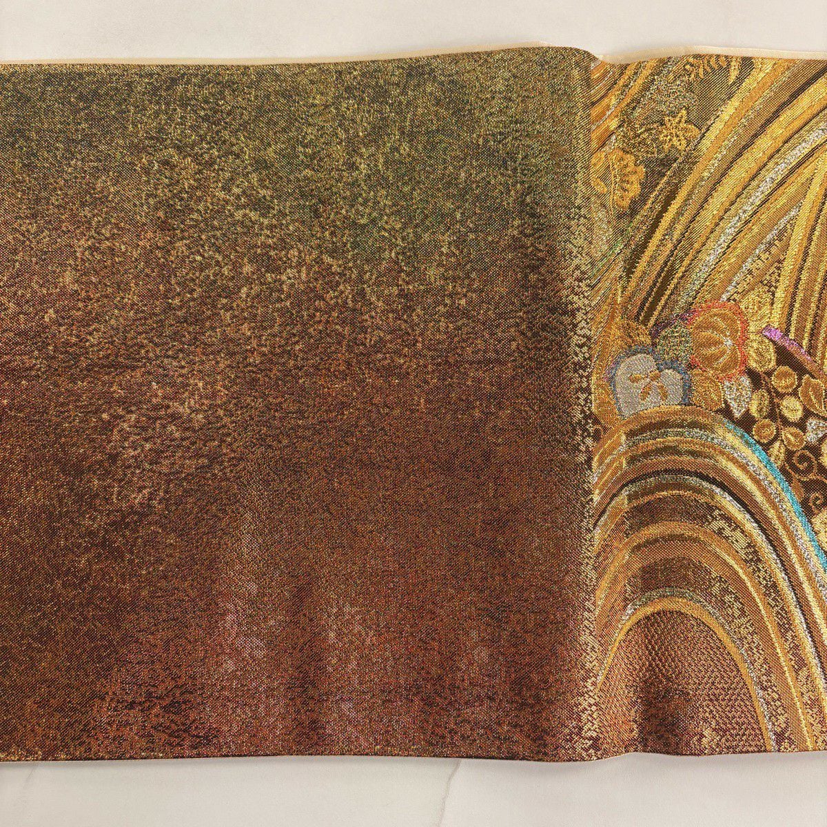 袋帯 秀品 扇面 蜀江華文 刺繍 箔 金茶 お太鼓柄 正絹