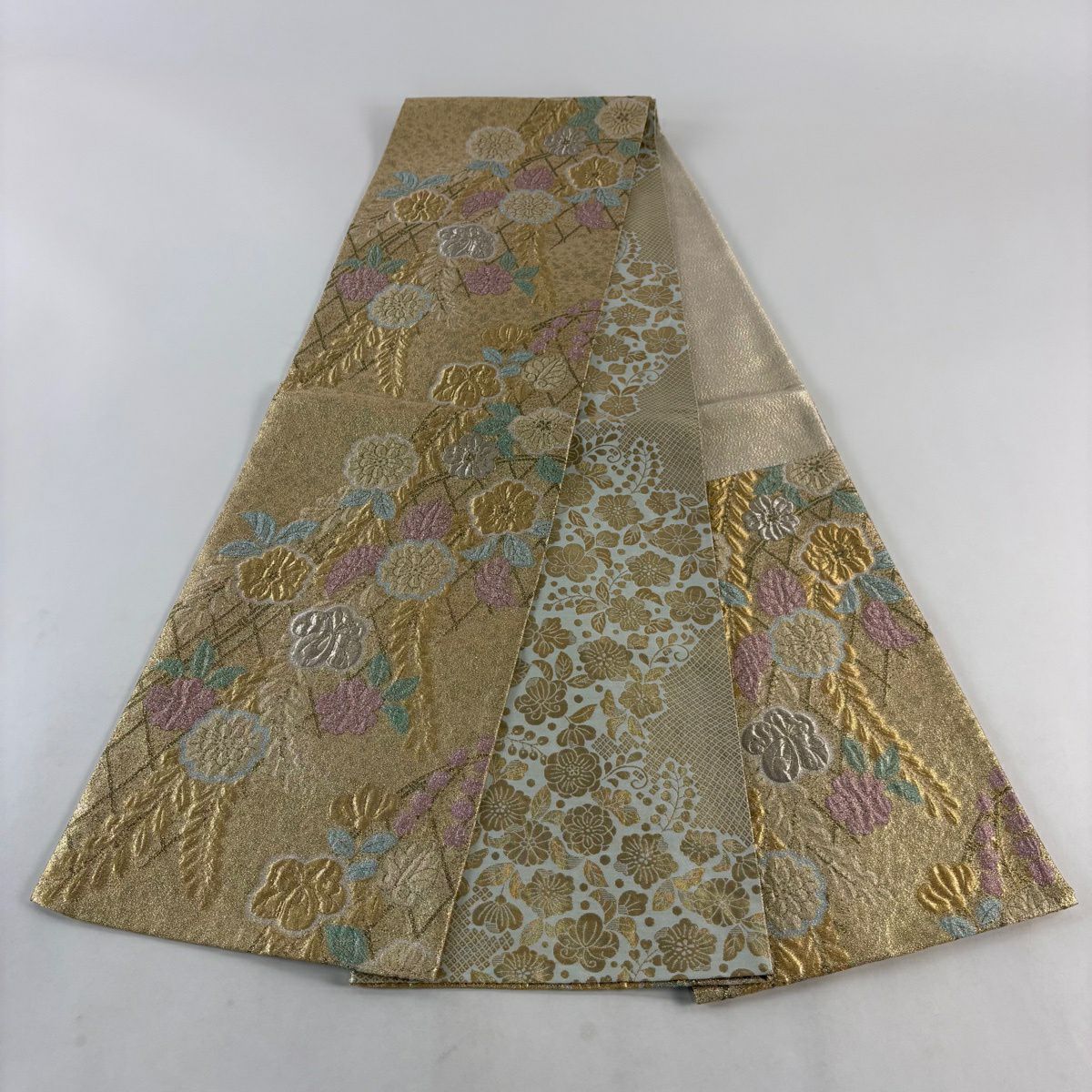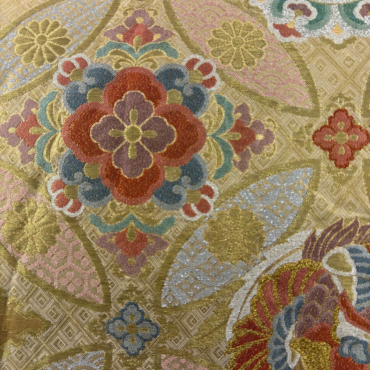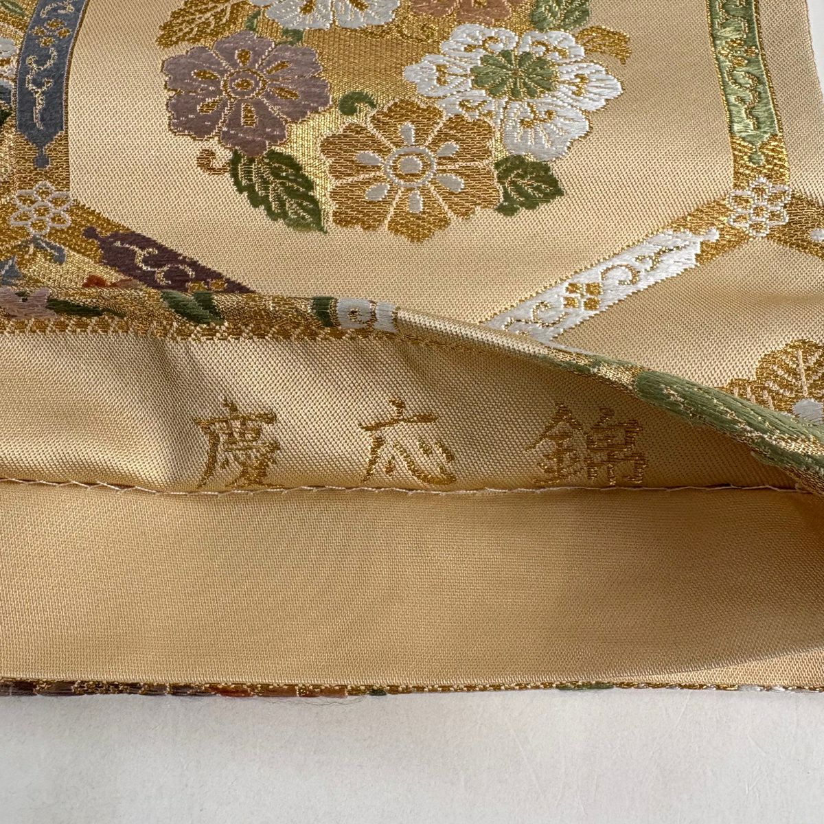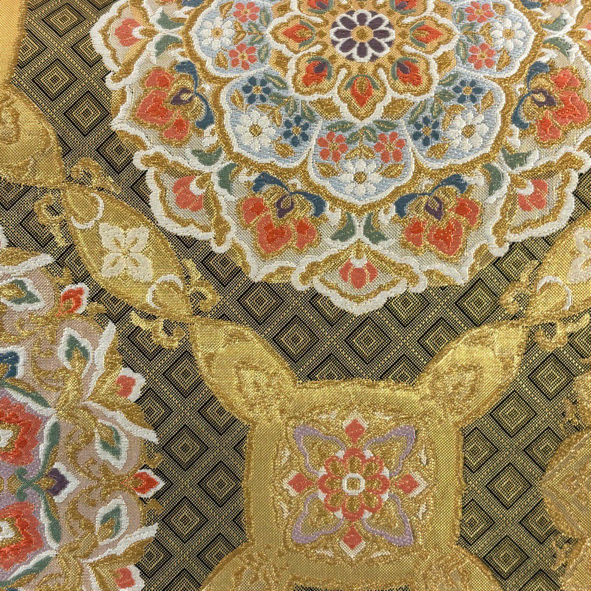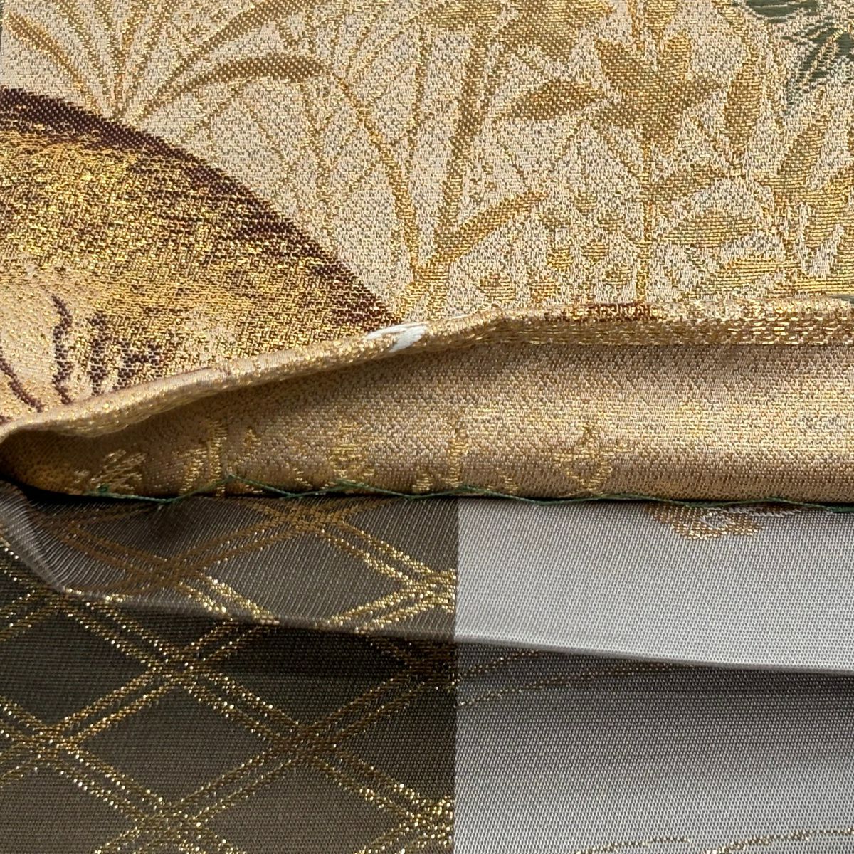 袋帯 秀品 扇面 蜀江華文 刺繍 箔 金茶 お太鼓柄 正絹