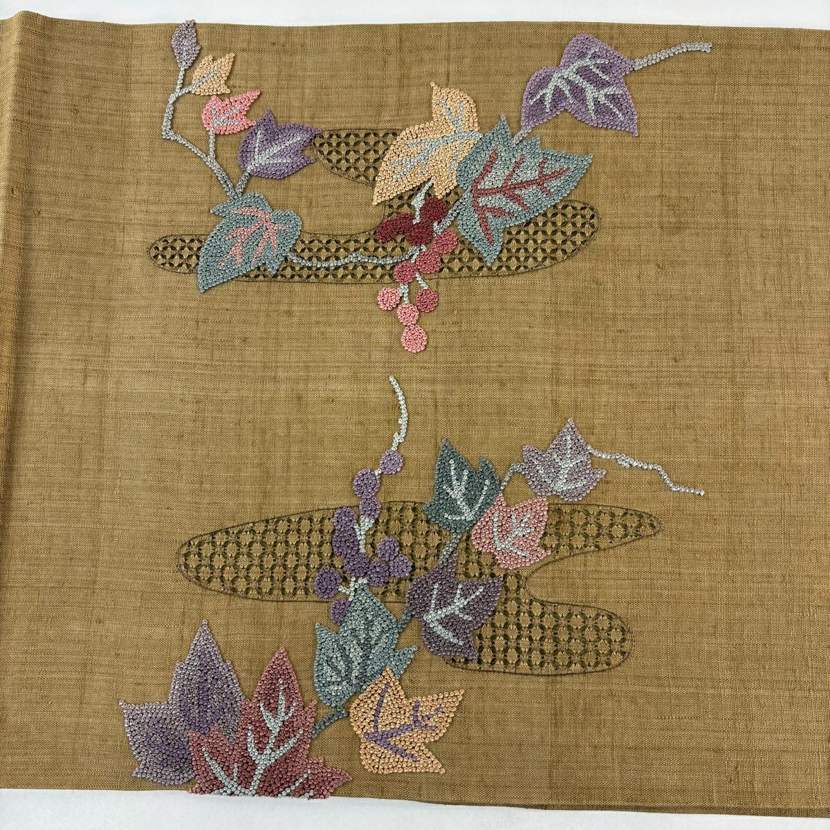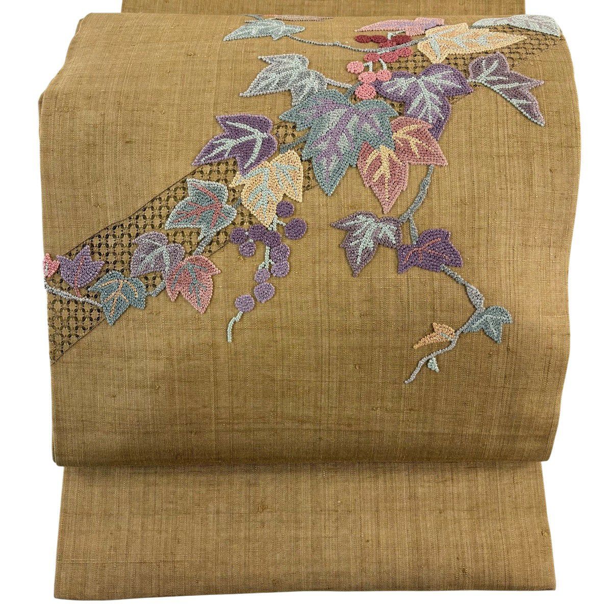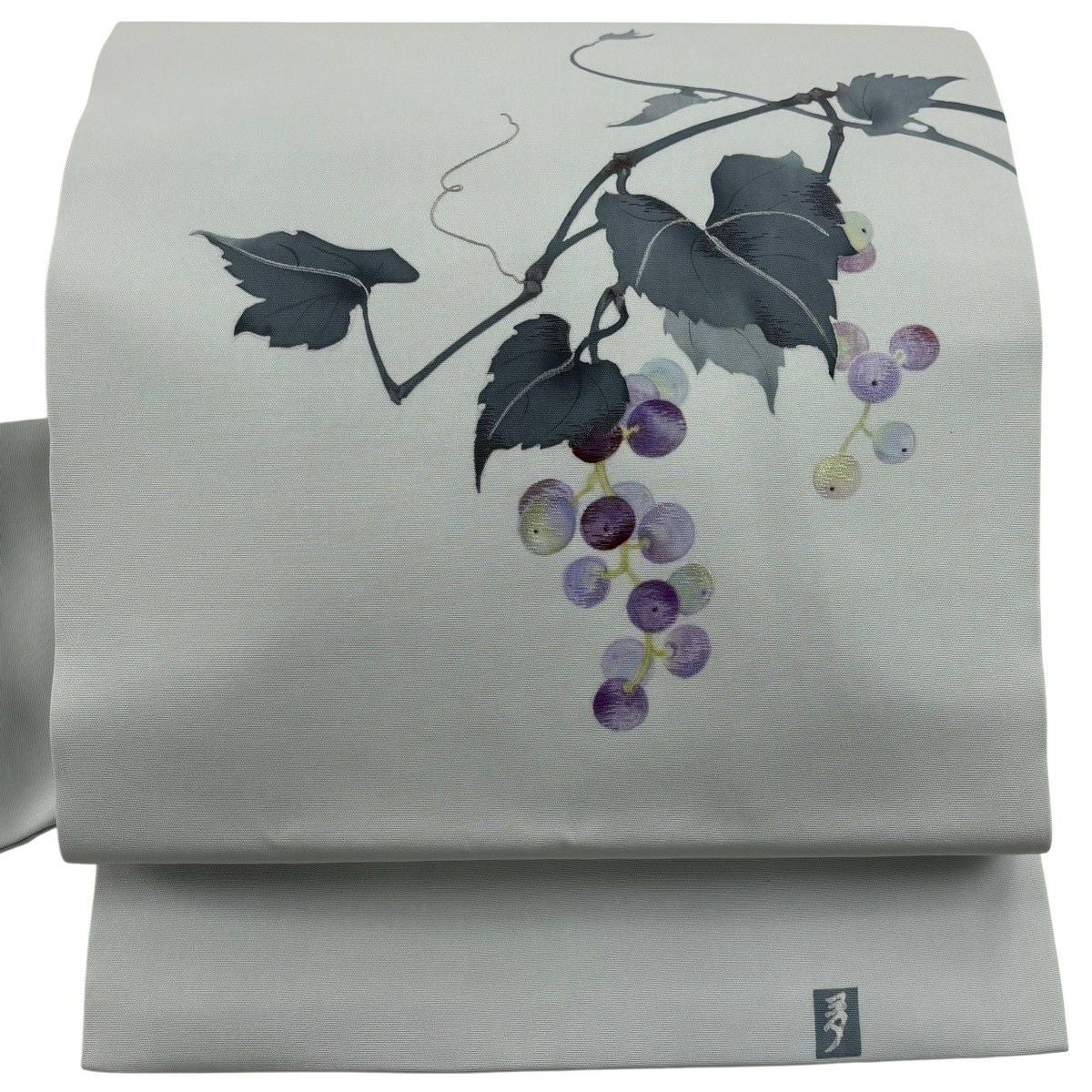【美品】 名古屋帯 秀品 落款あり 葡萄 刺繍 薄緑 正絹