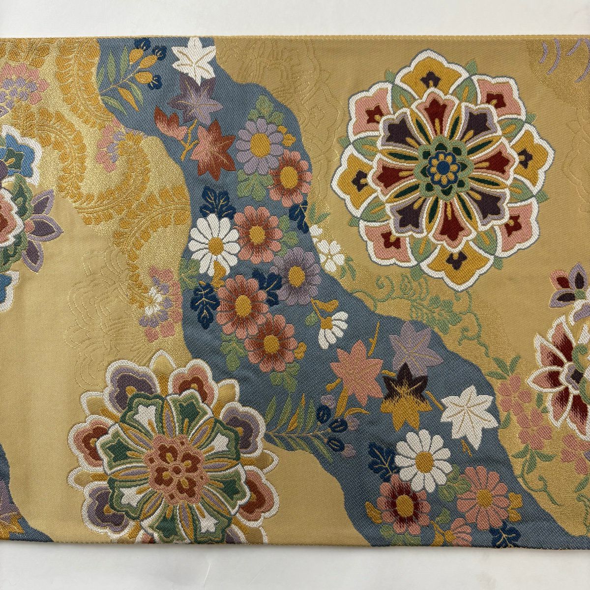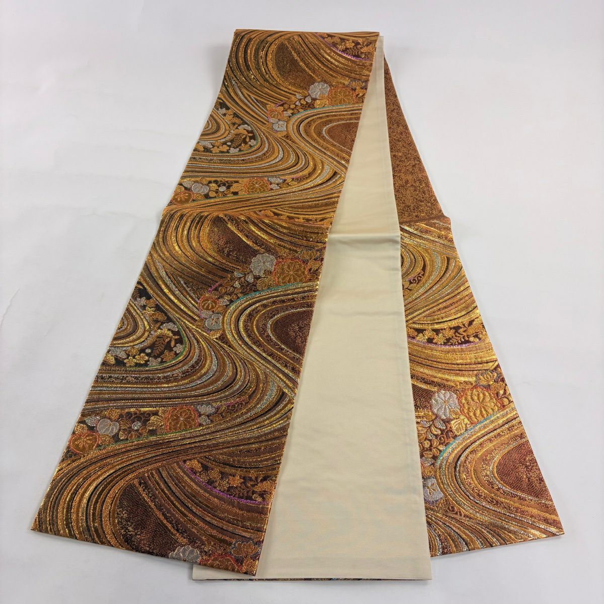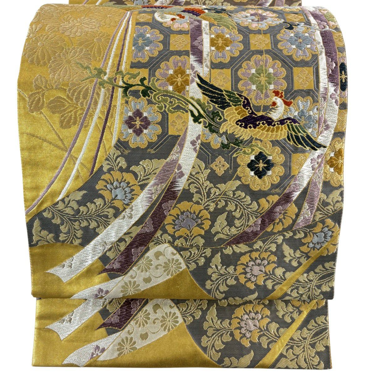 【美品】 袋帯 秀品 菊 波頭 金糸 唐織 金色 六通 正絹