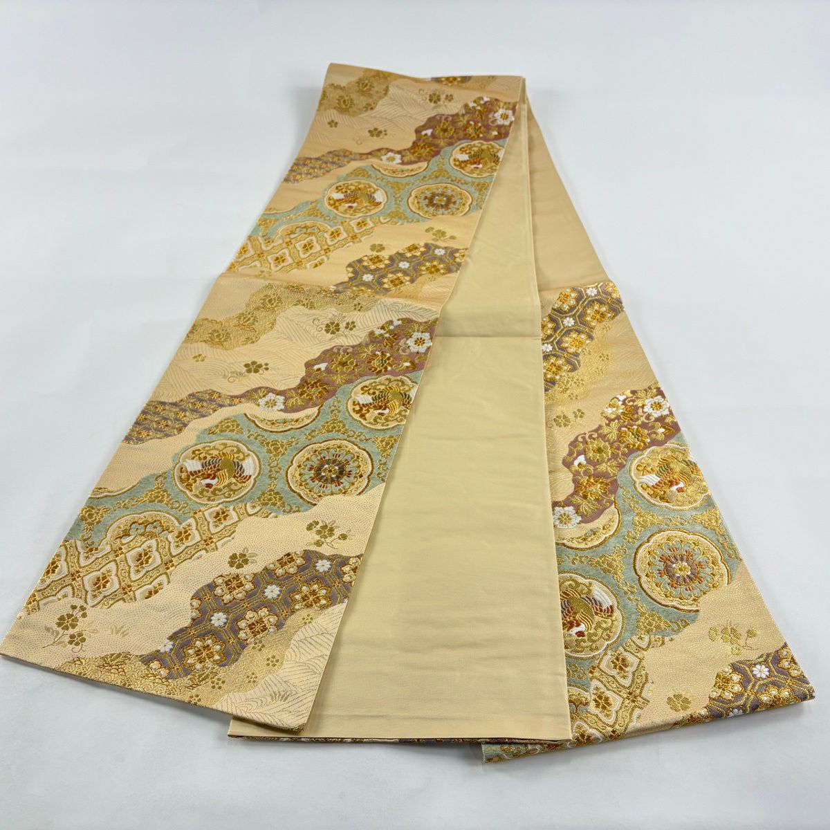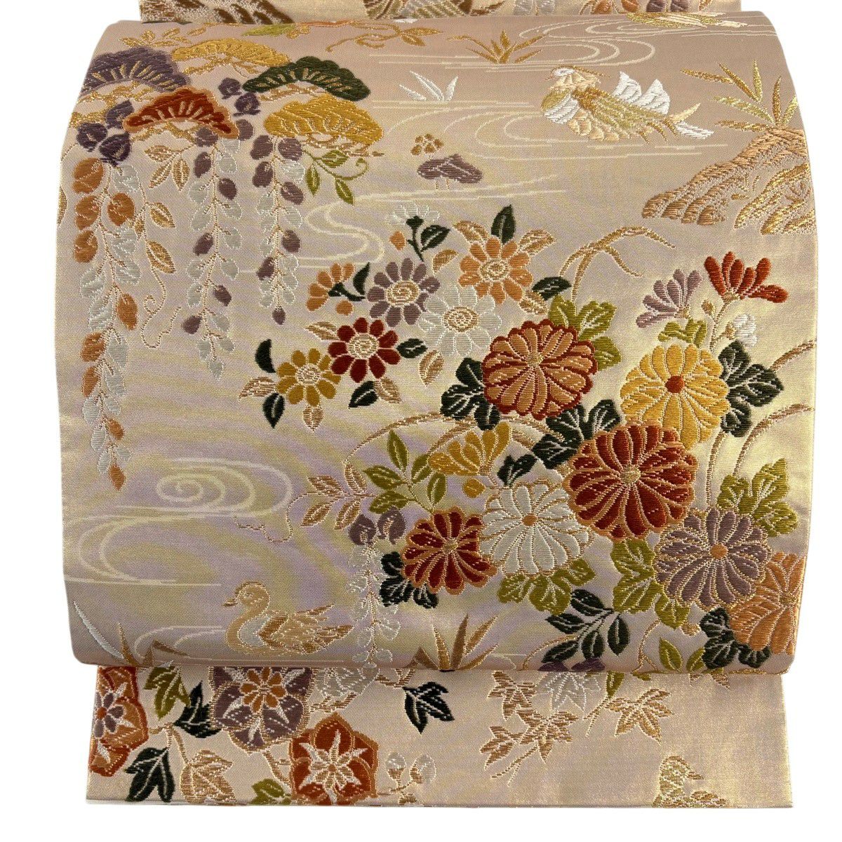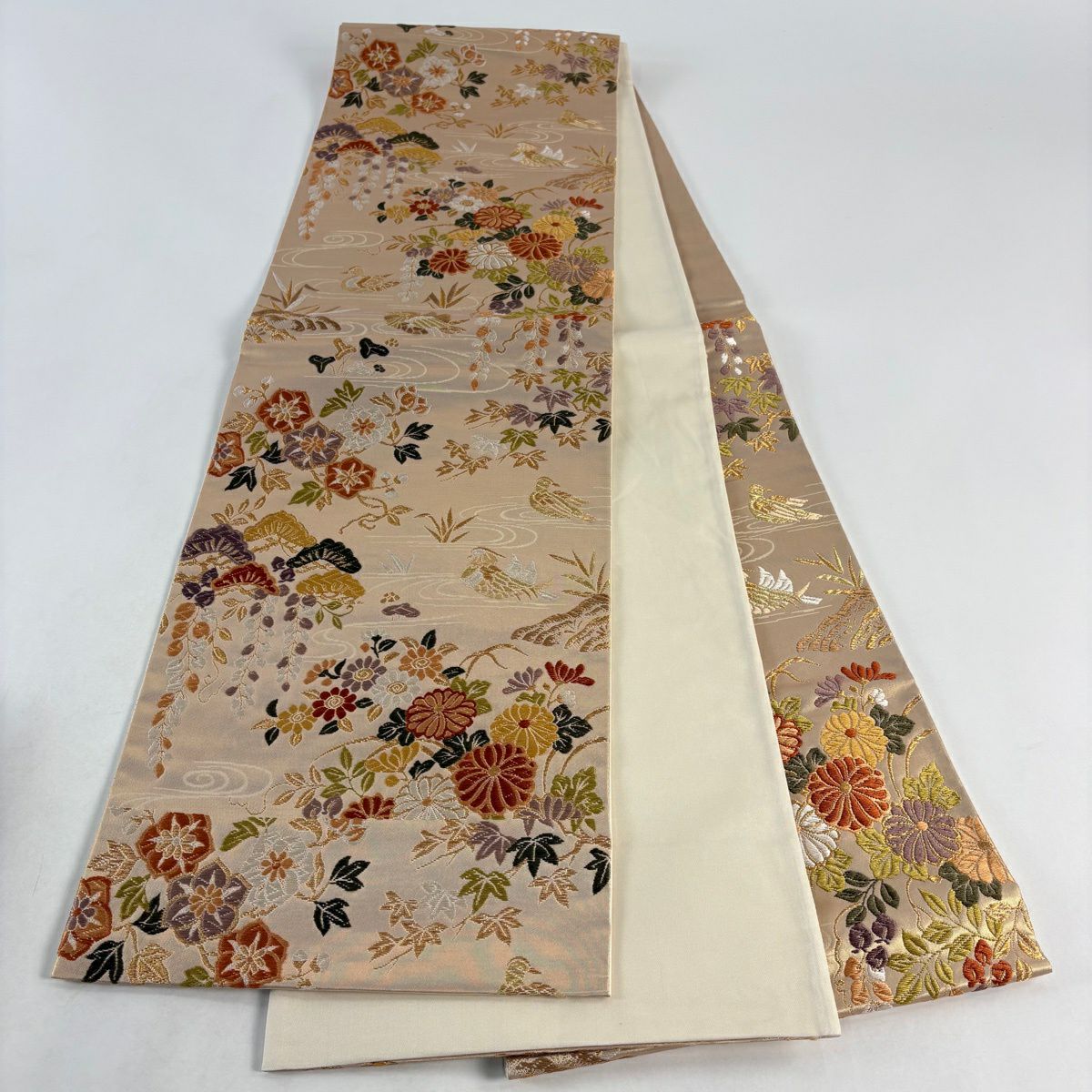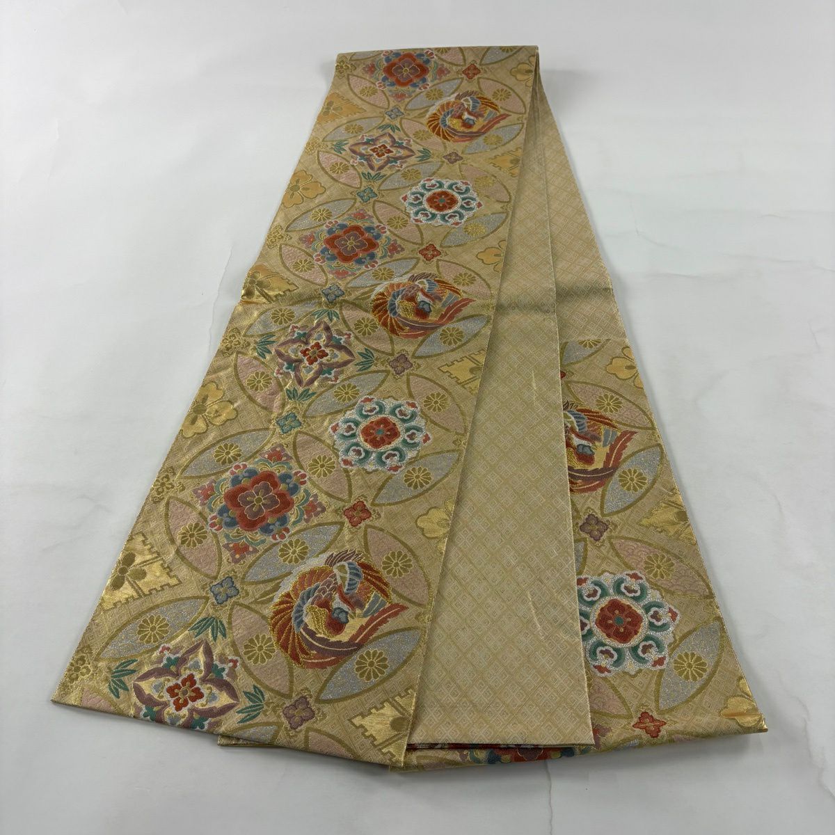 袋帯 秀品 華文 花鳥 刺繍 箔 ベージュ 六通 正絹