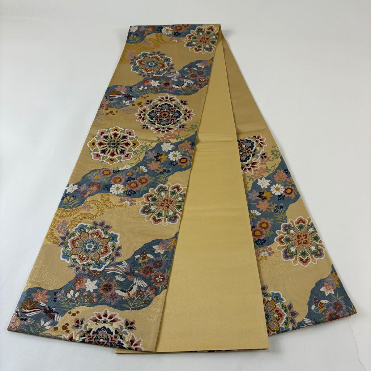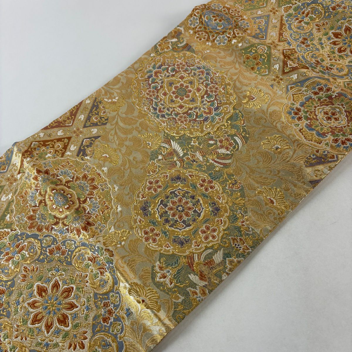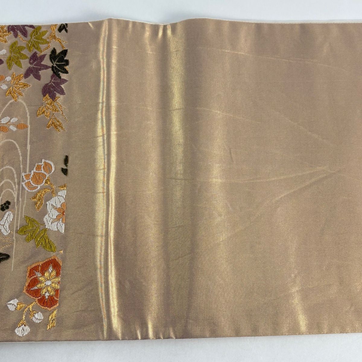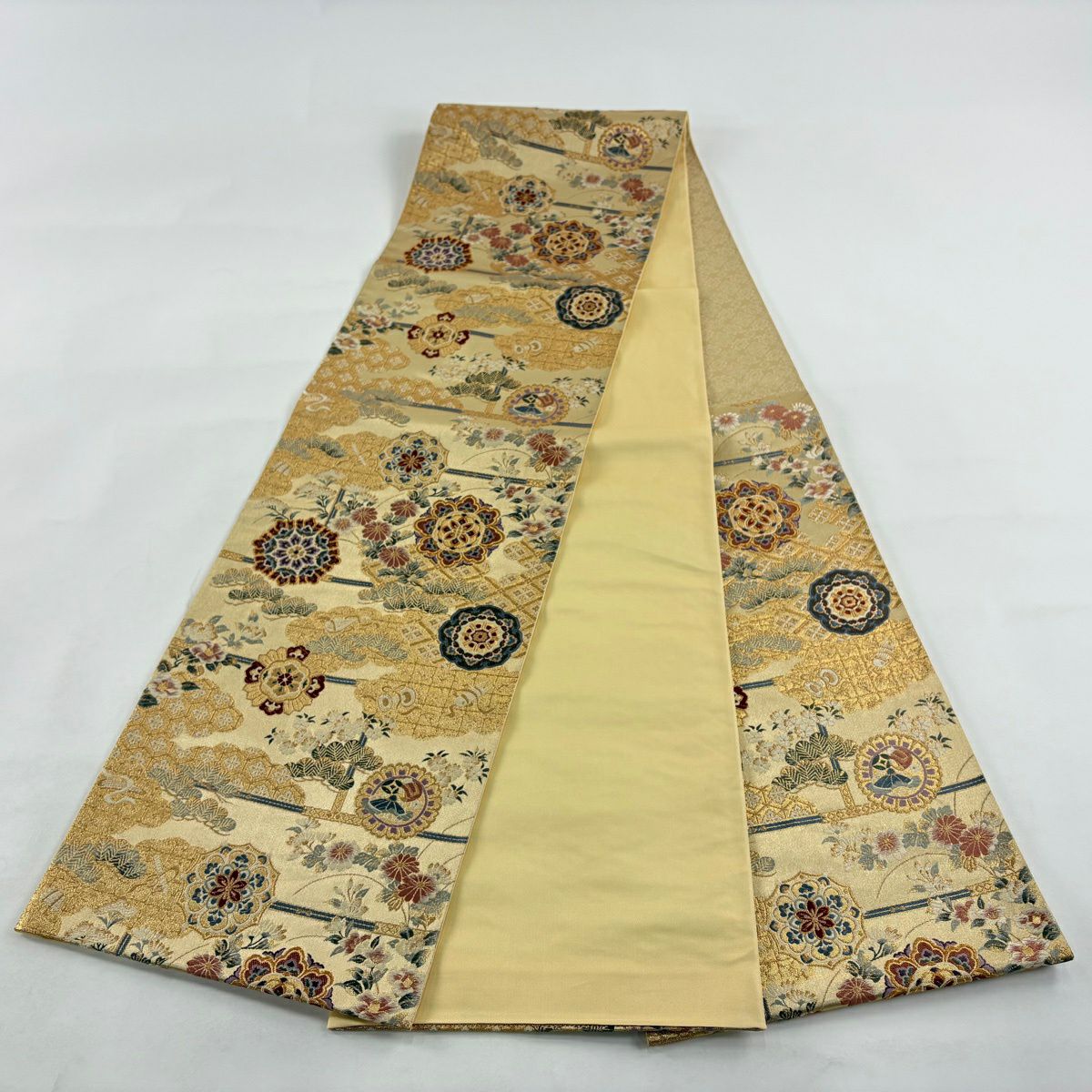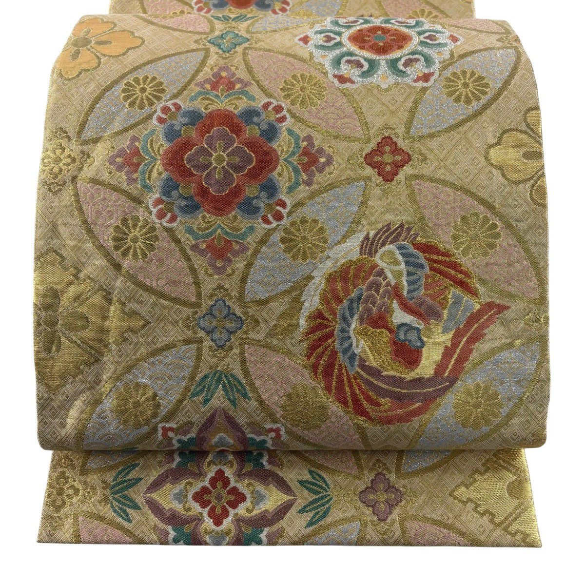 袋帯 秀品 華文 花鳥 刺繍 箔 ベージュ 六通 正絹