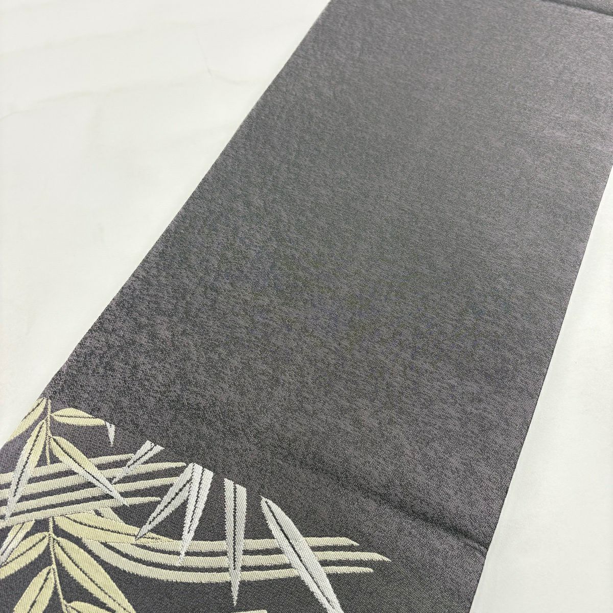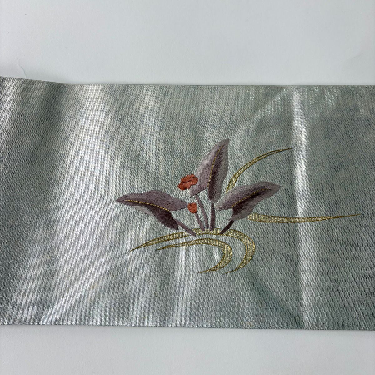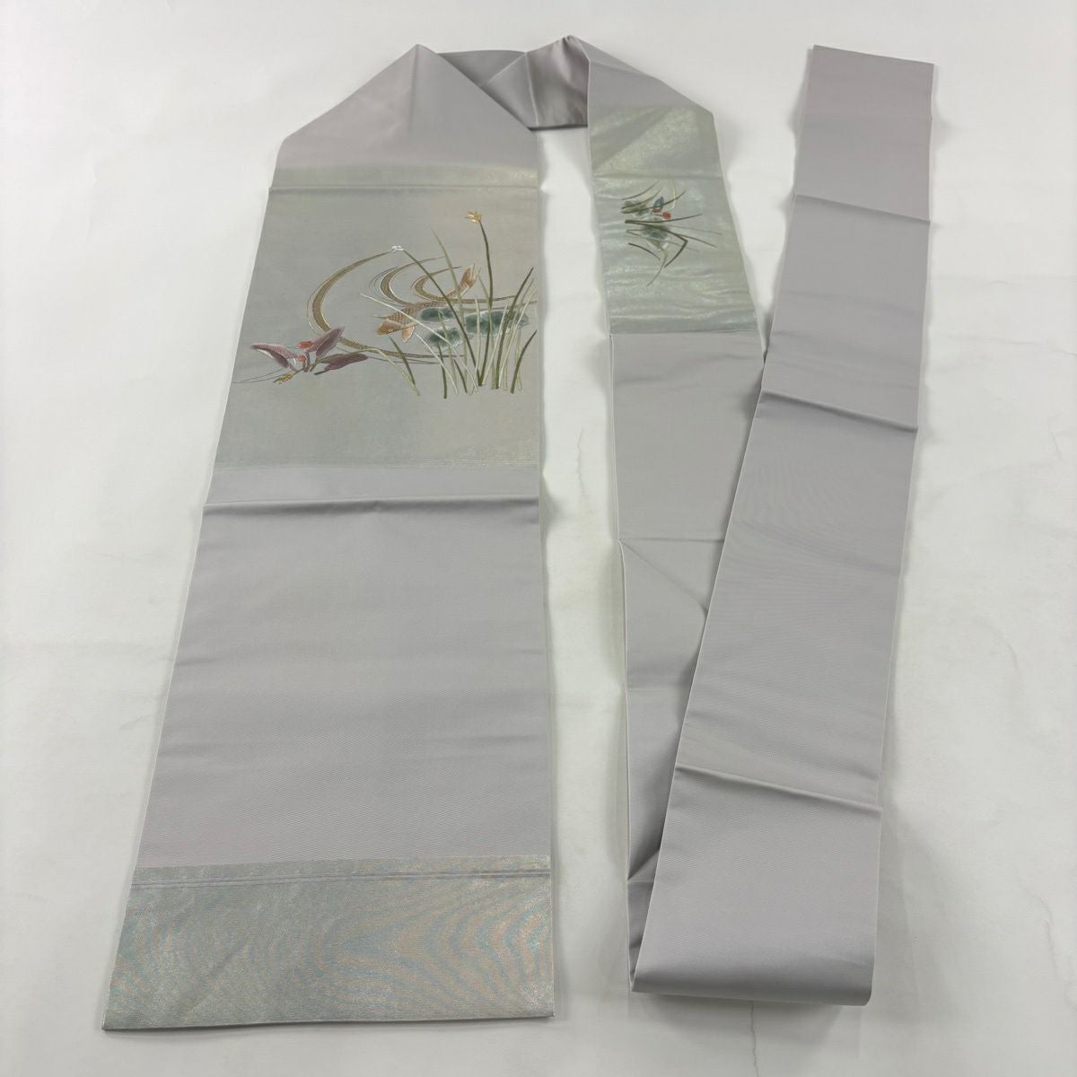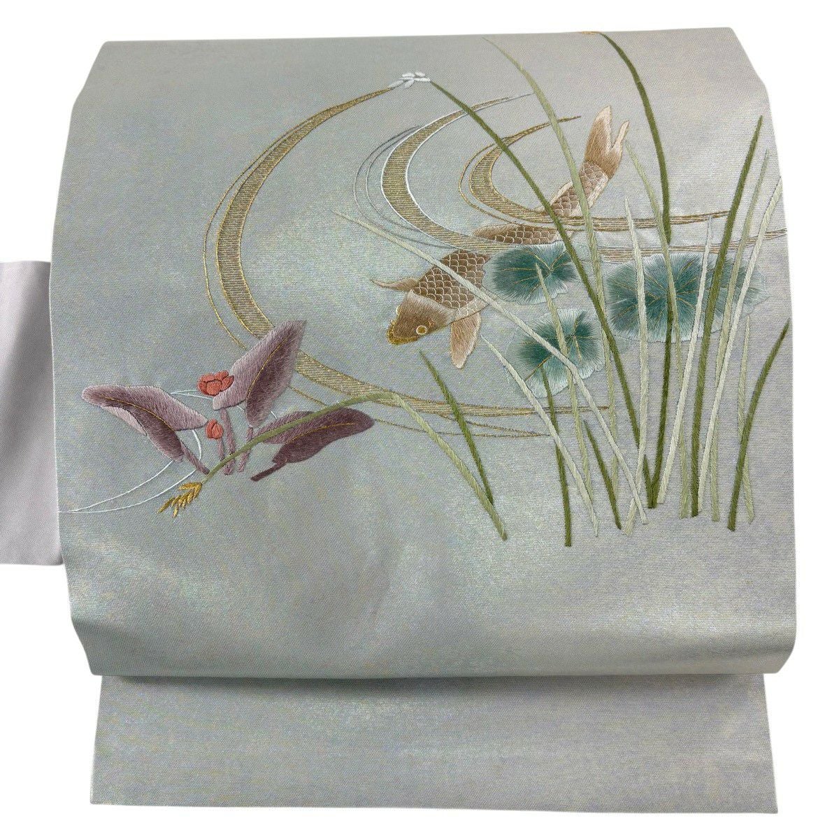 【美品】 名古屋帯 秀品 鯉 水草 刺繍 金糸 灰色 正絹