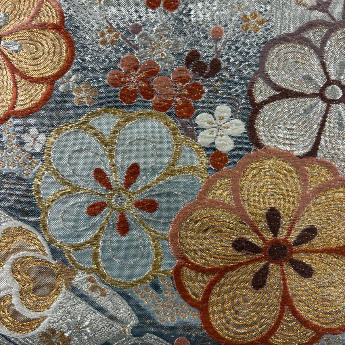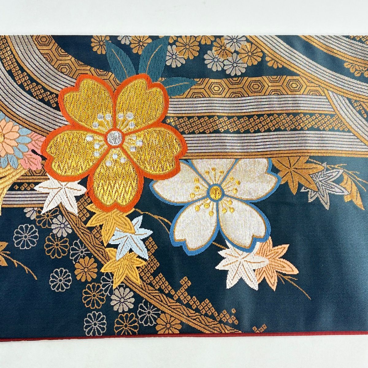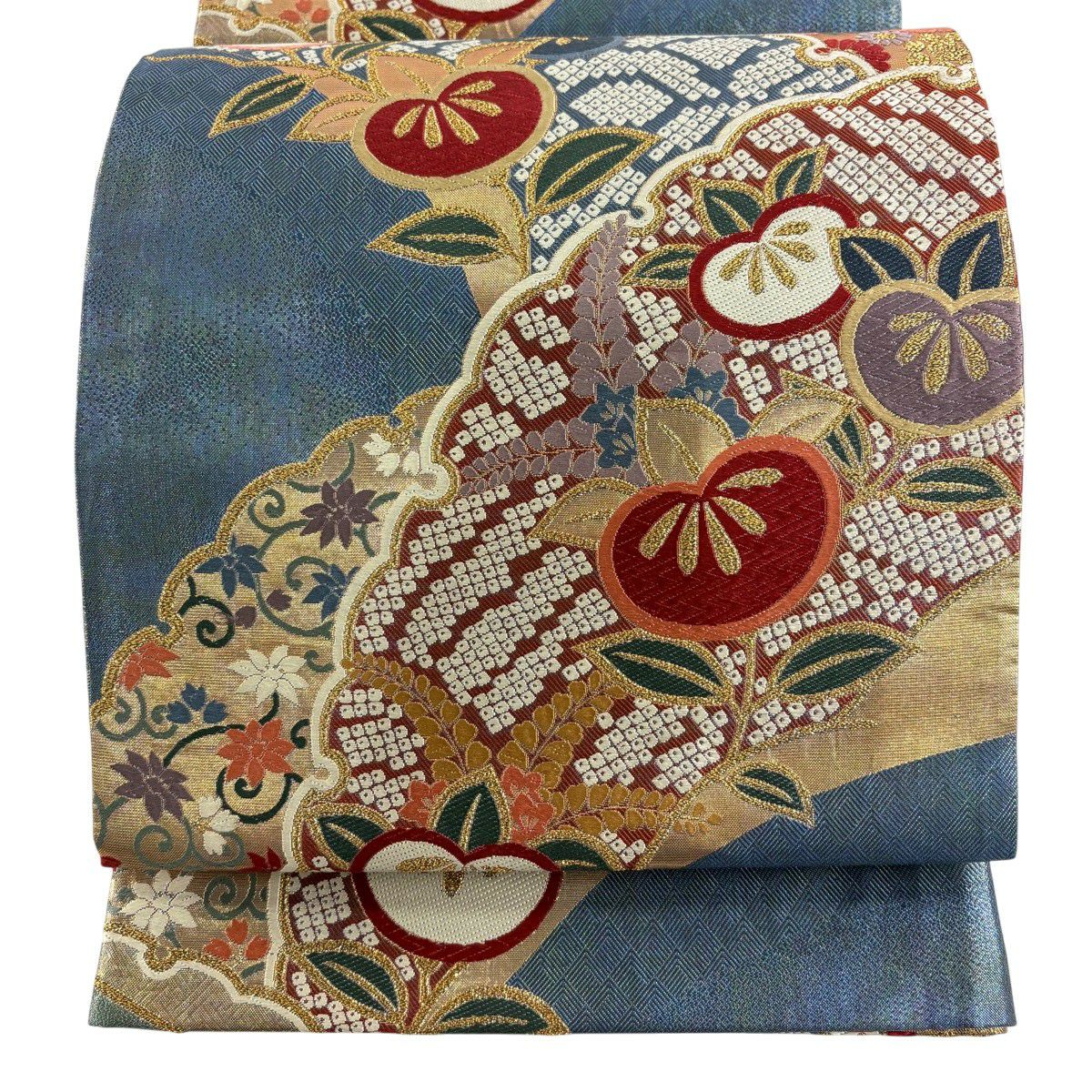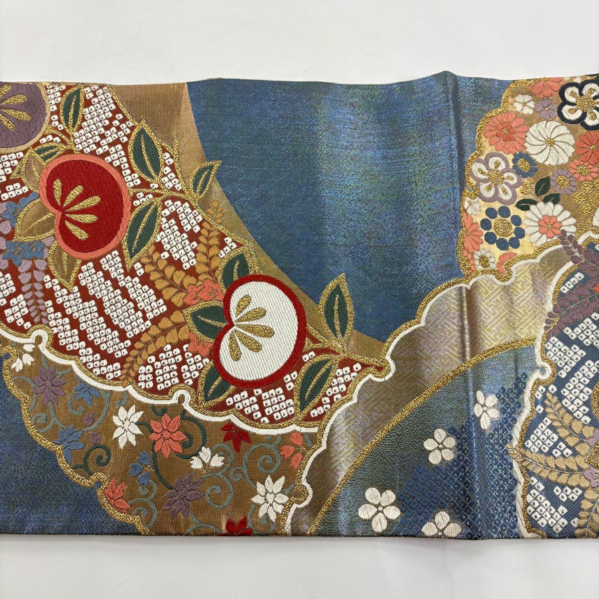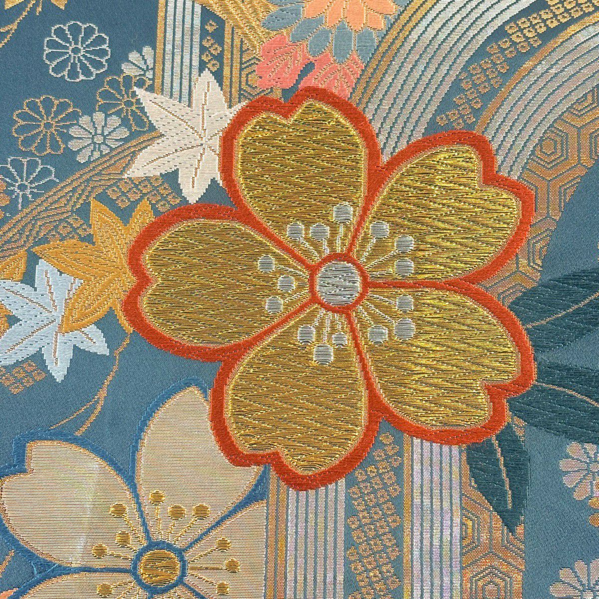 袋帯 秀品 振袖向き 草花 流水 金糸 箔 青 六通 正絹