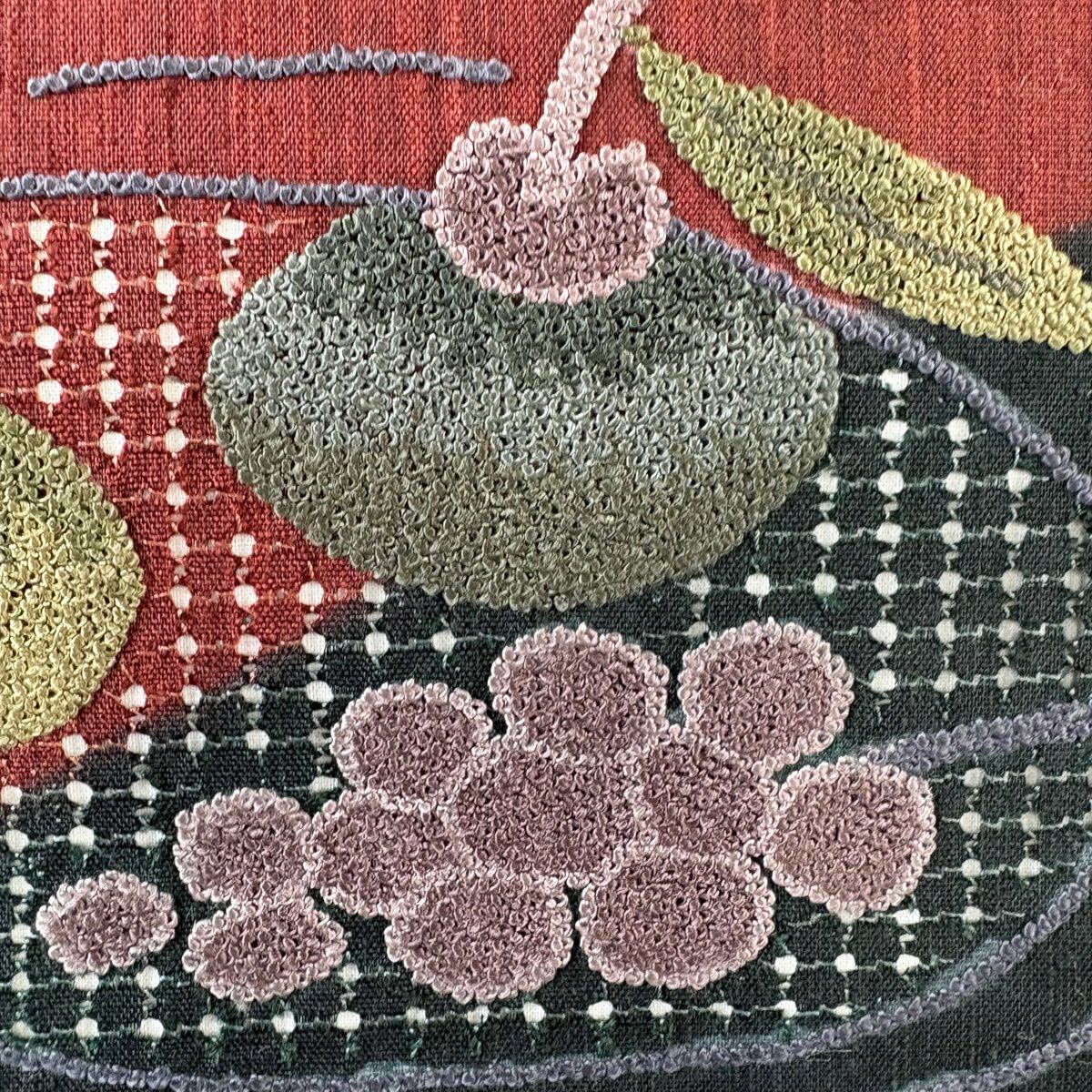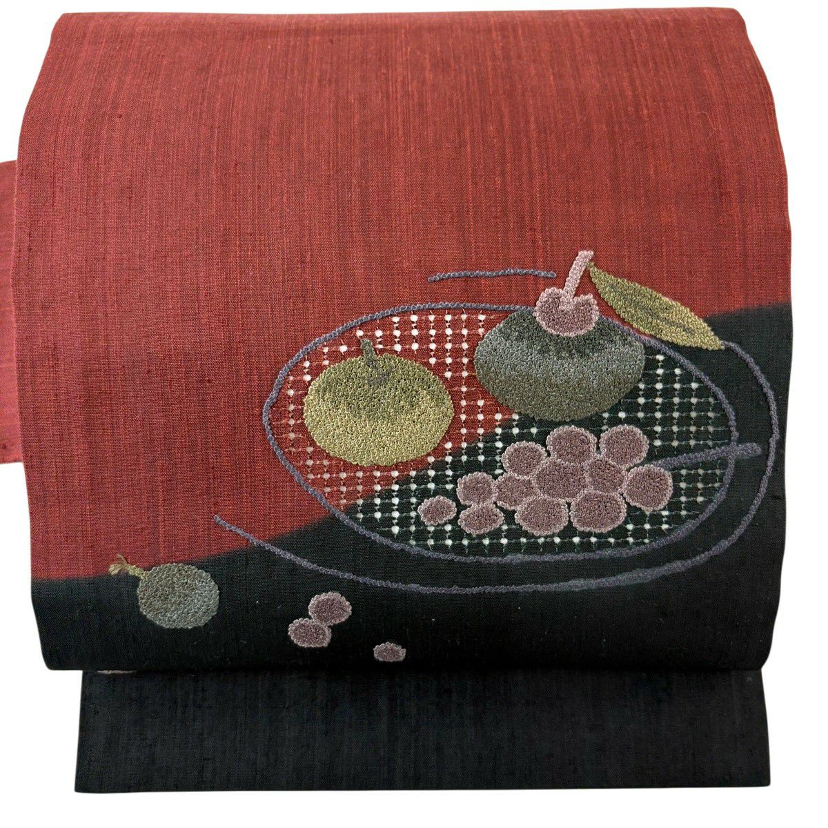 名古屋帯 秀品 紬地 葡萄 果実 相良刺繍 えんじ色 正絹