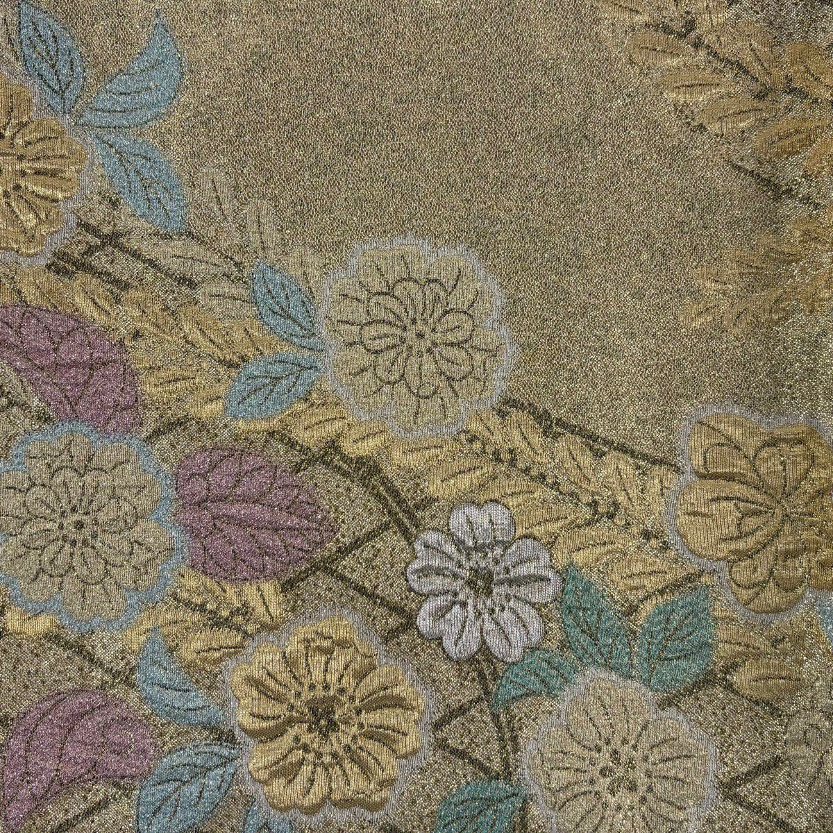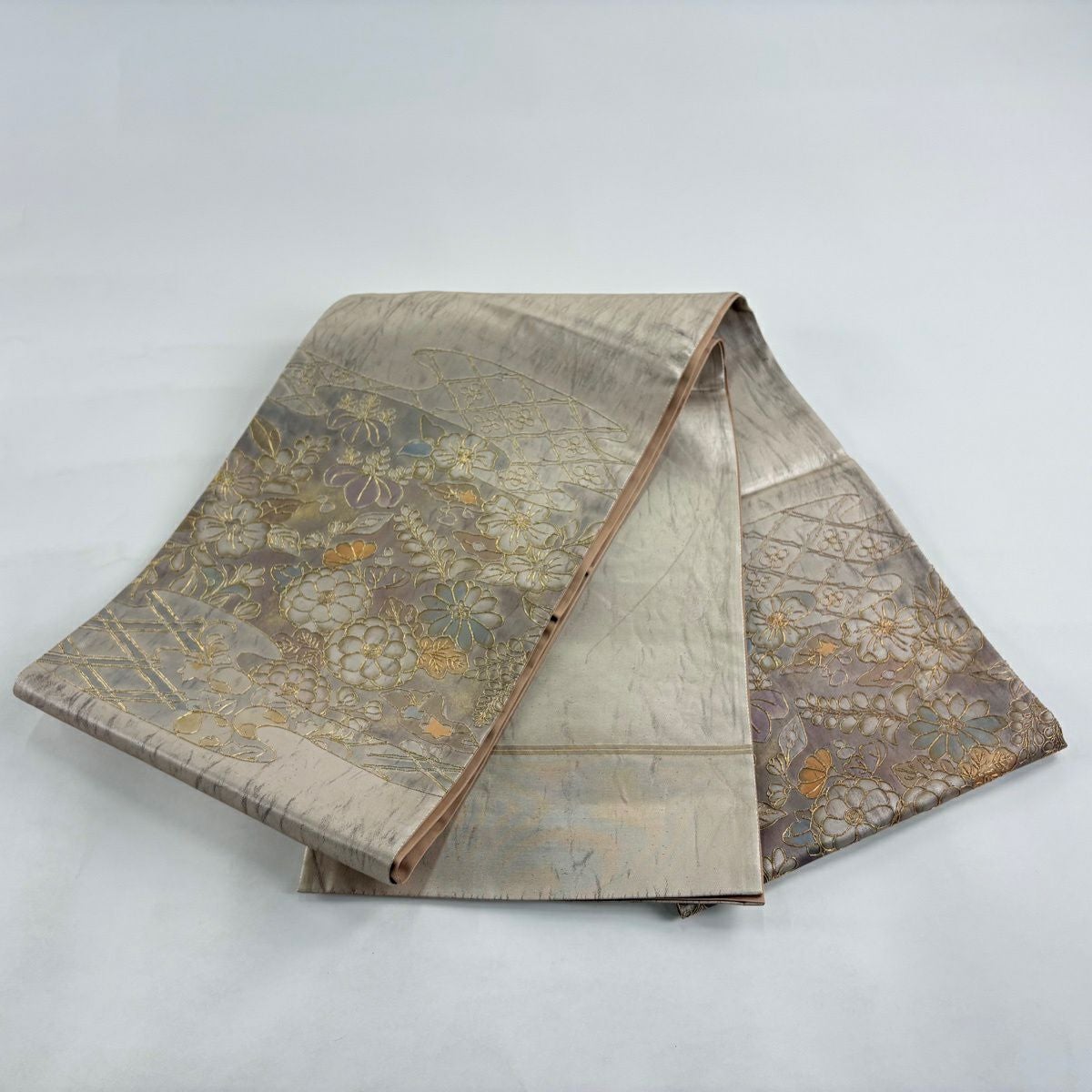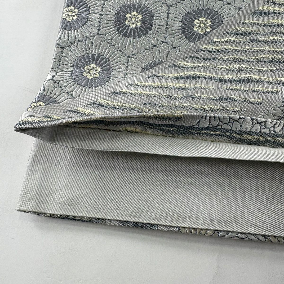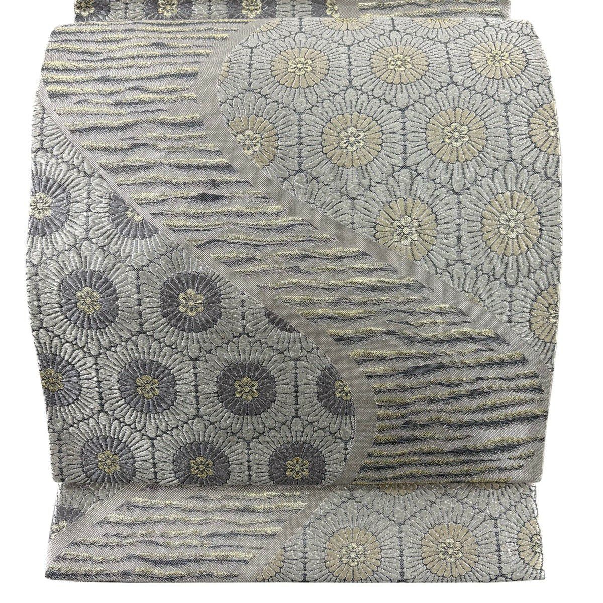 【美品】 袋帯 秀品 亀甲 菊 箔 唐織 灰色 六通 正絹