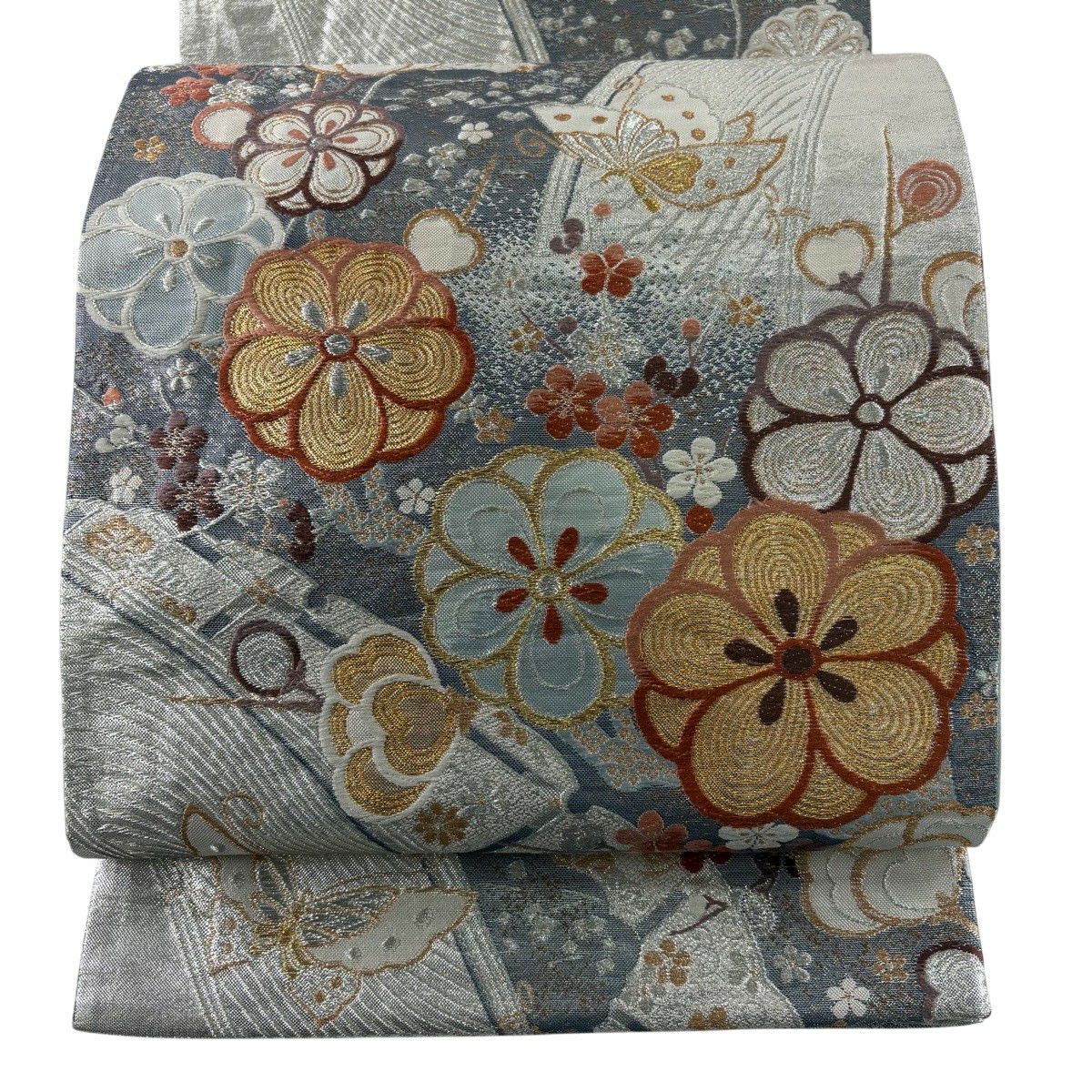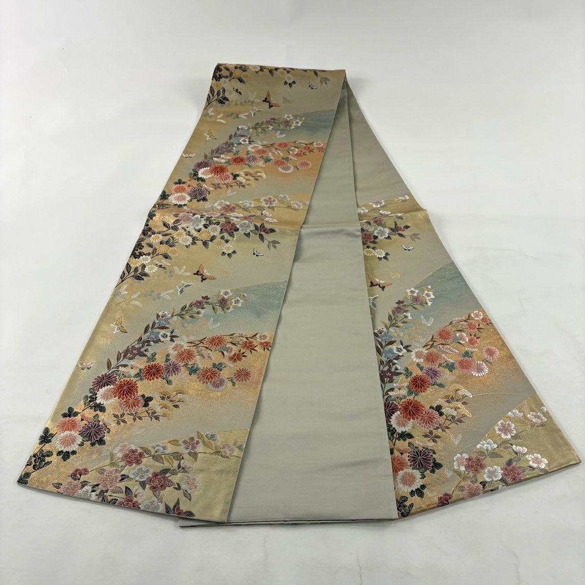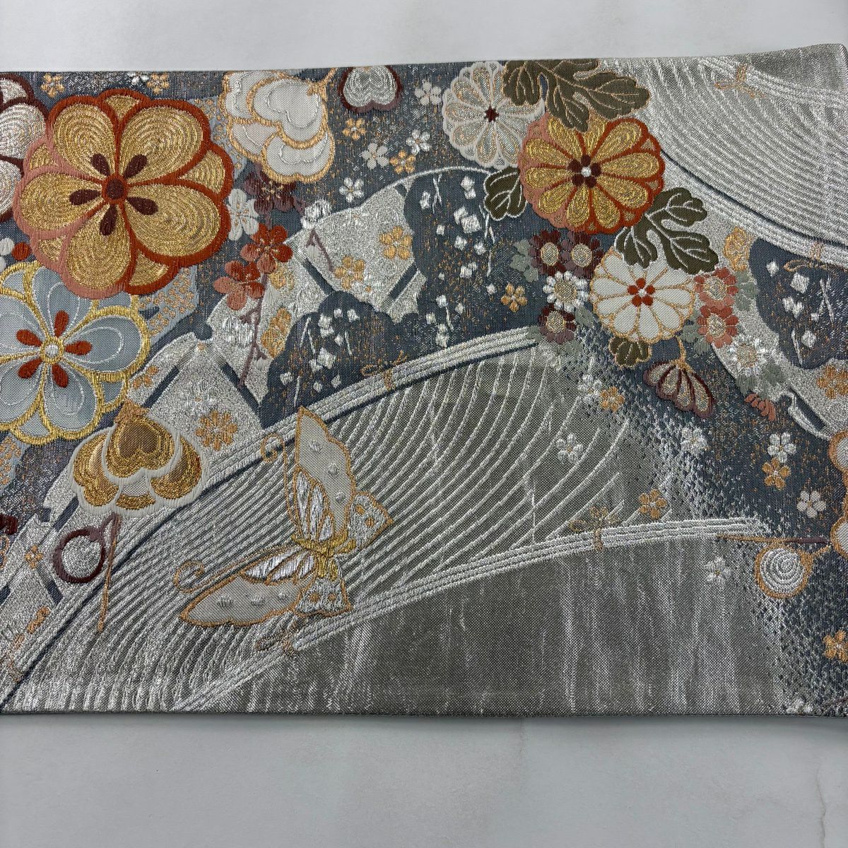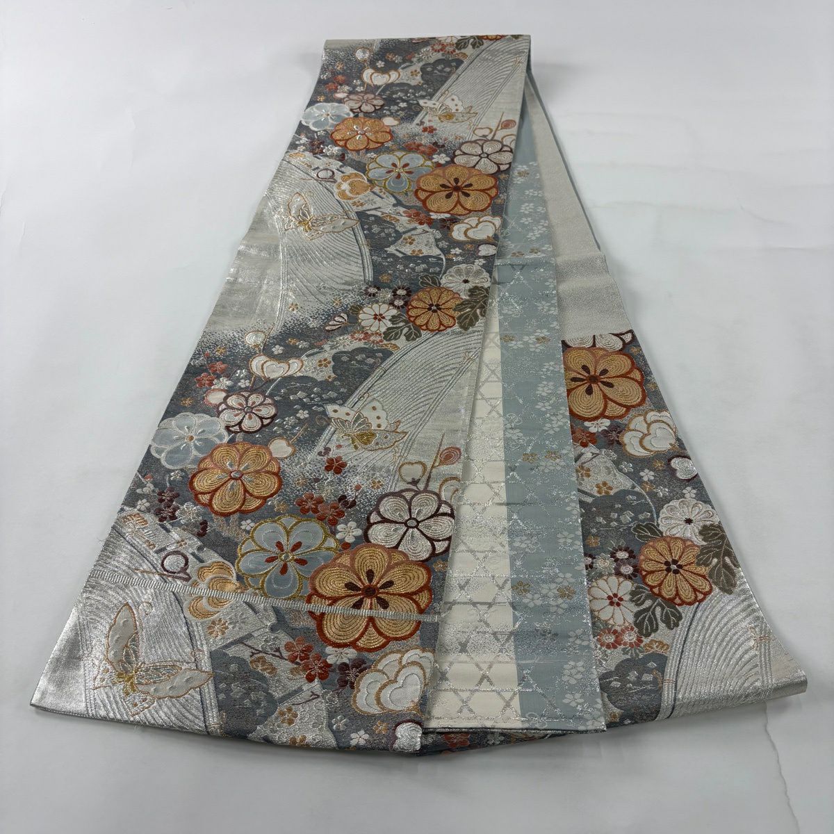 【美品】 袋帯 秀品 草花 蝶 箔 刺繍 灰色 六通 正絹