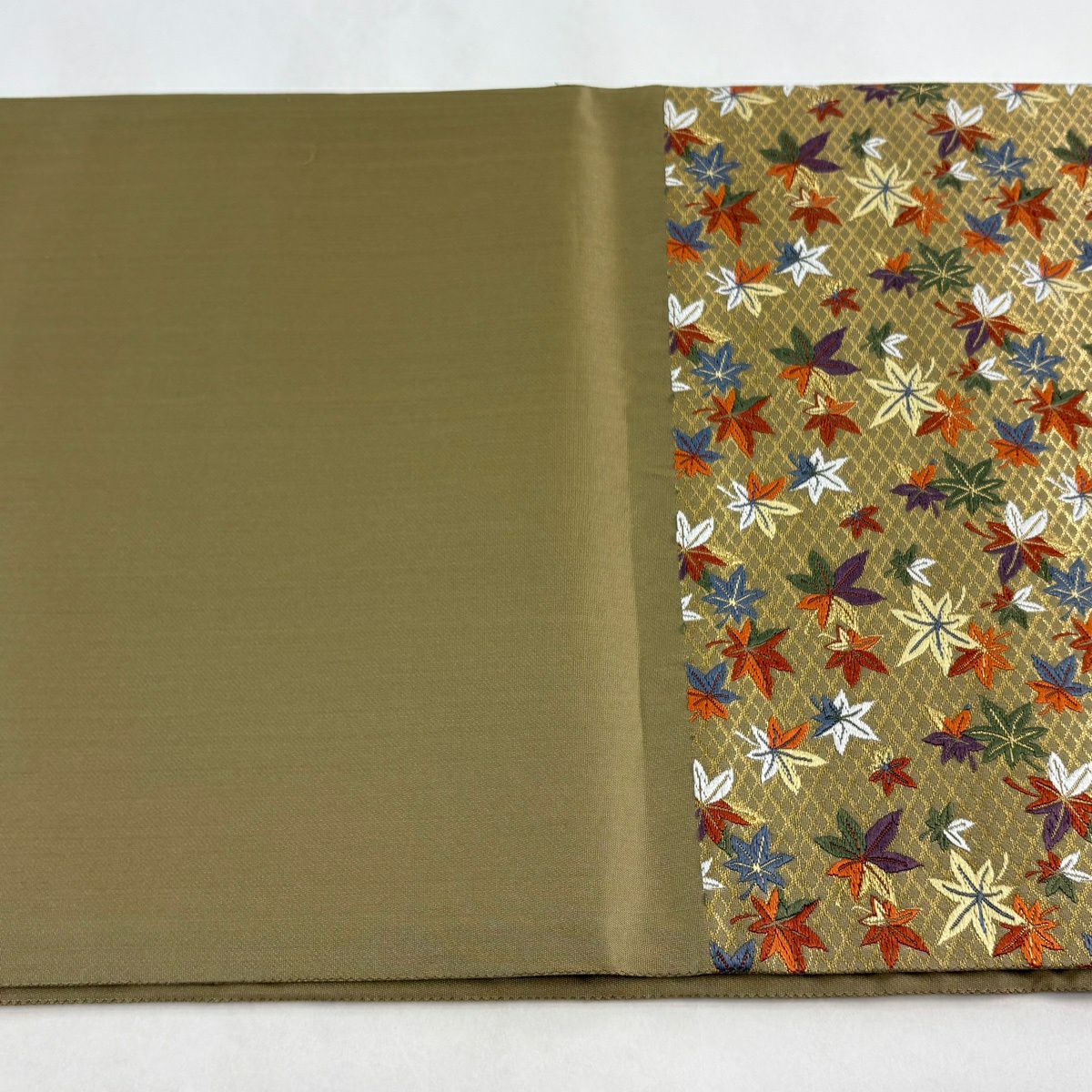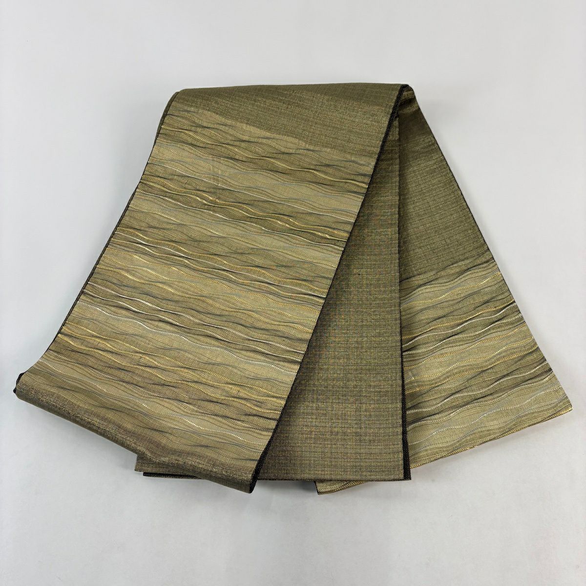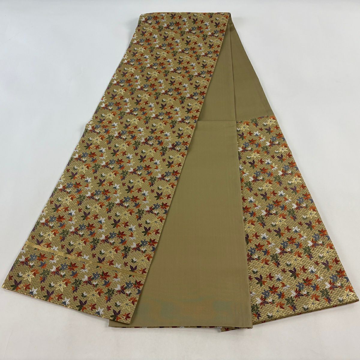 【美品】 袋帯 秀品 楓 斜め格子 箔 茶緑色 六通 正絹