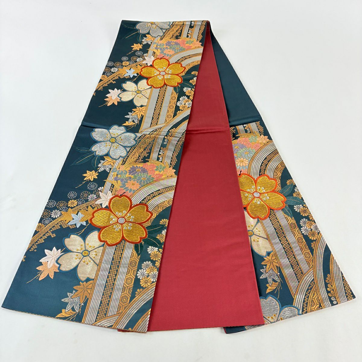 袋帯 秀品 振袖向き 桜 滝 金銀糸 箔 深緑 六通 正絹