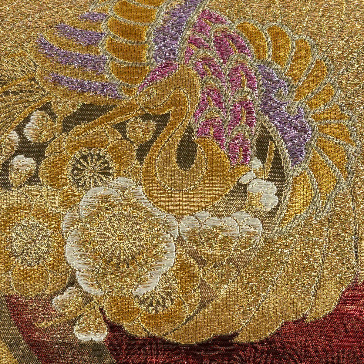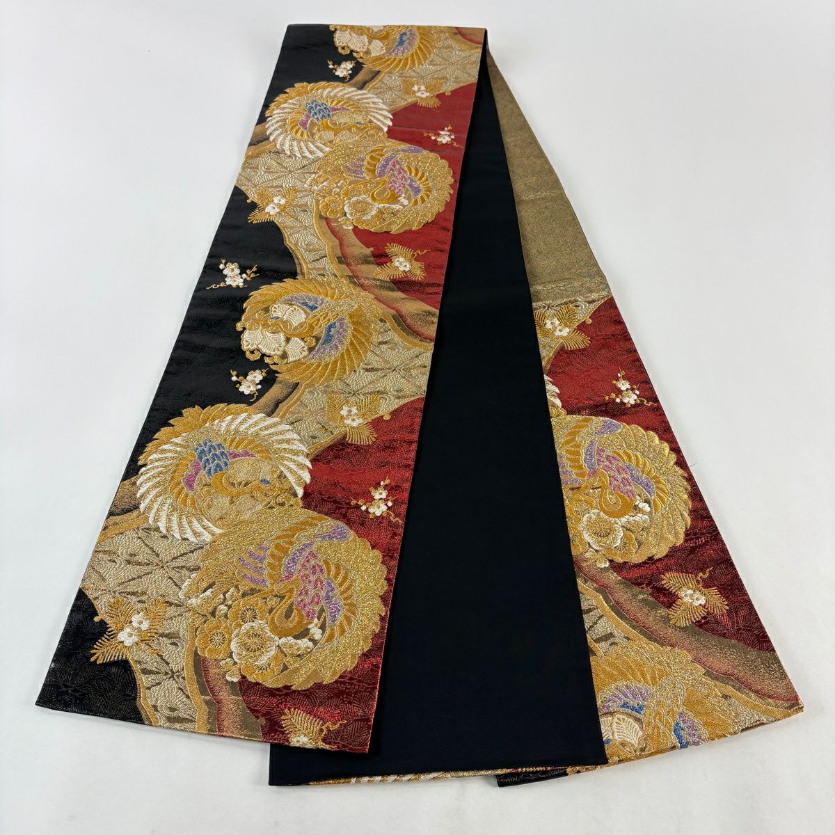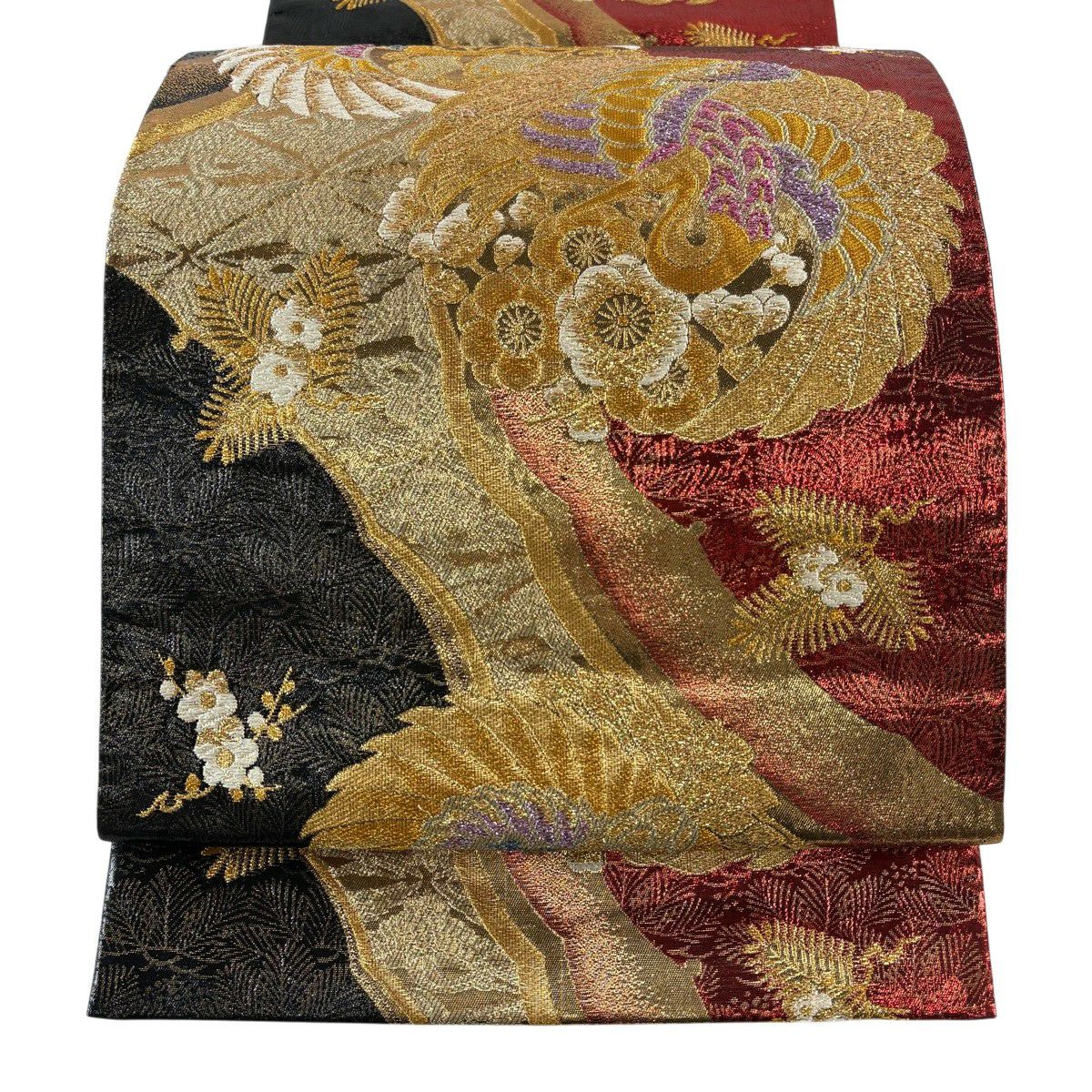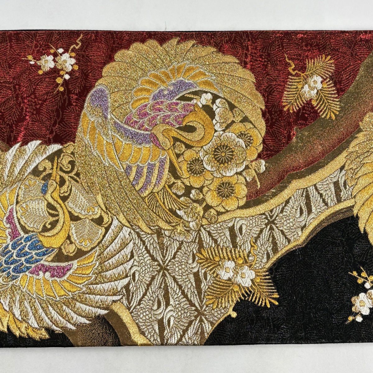 袋帯 秀品 振袖向き 鶴 松梅 金銀糸 箔 赤 六通 正絹