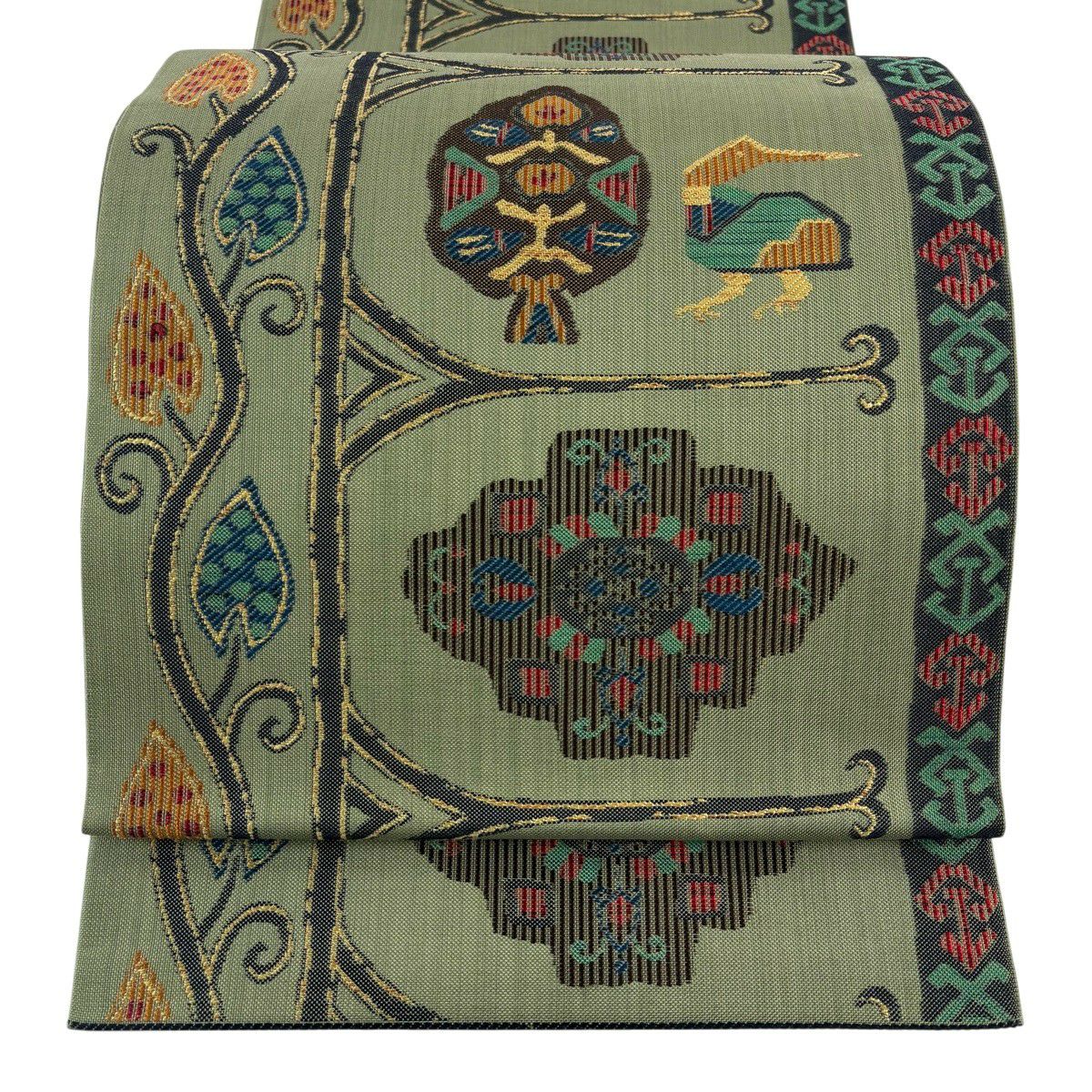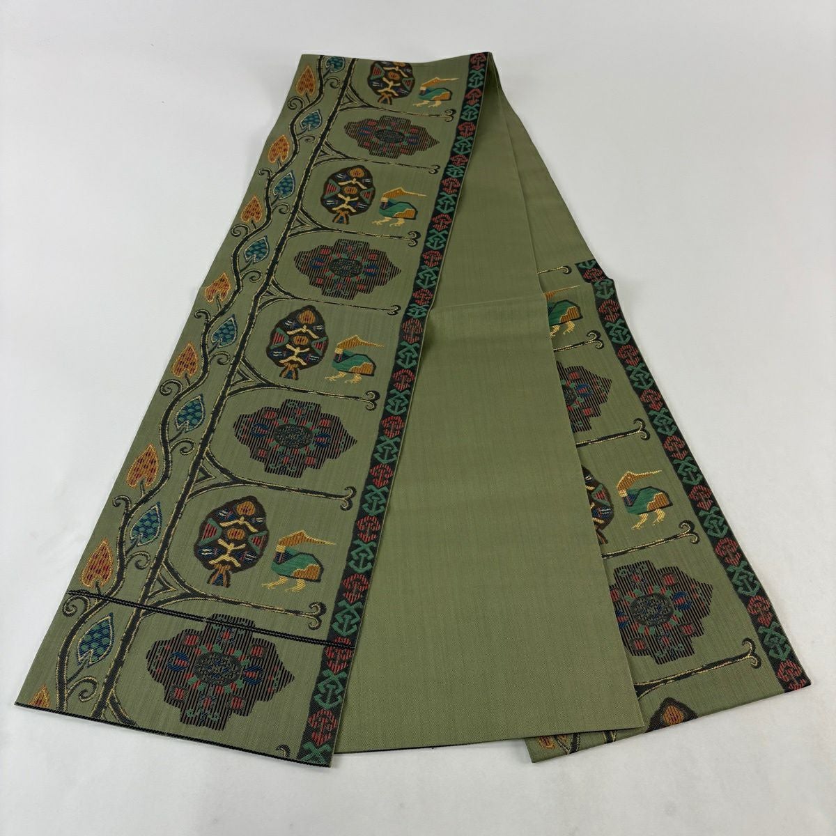 【美品】 袋帯 秀品 紬地 草花 鳥 よもぎ色 六通 正絹