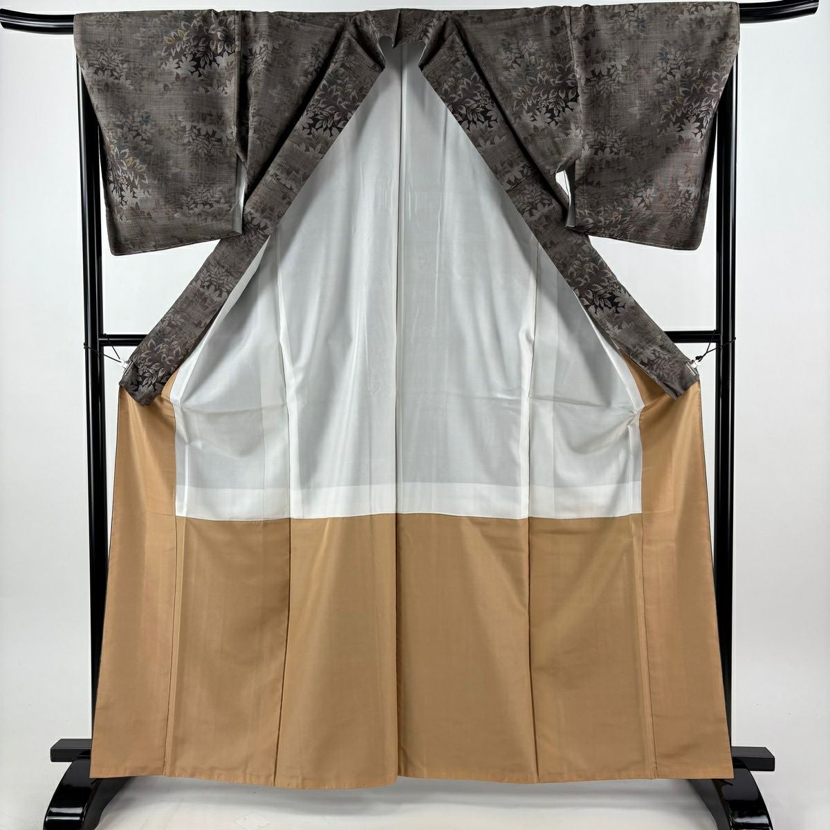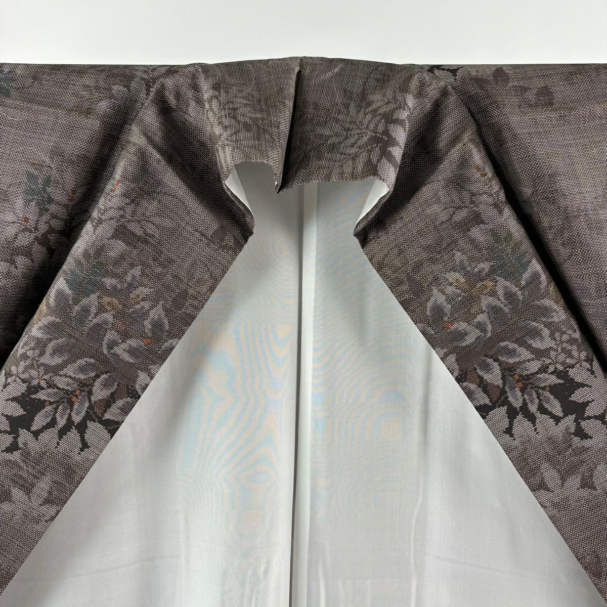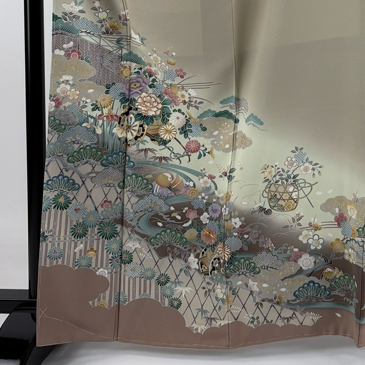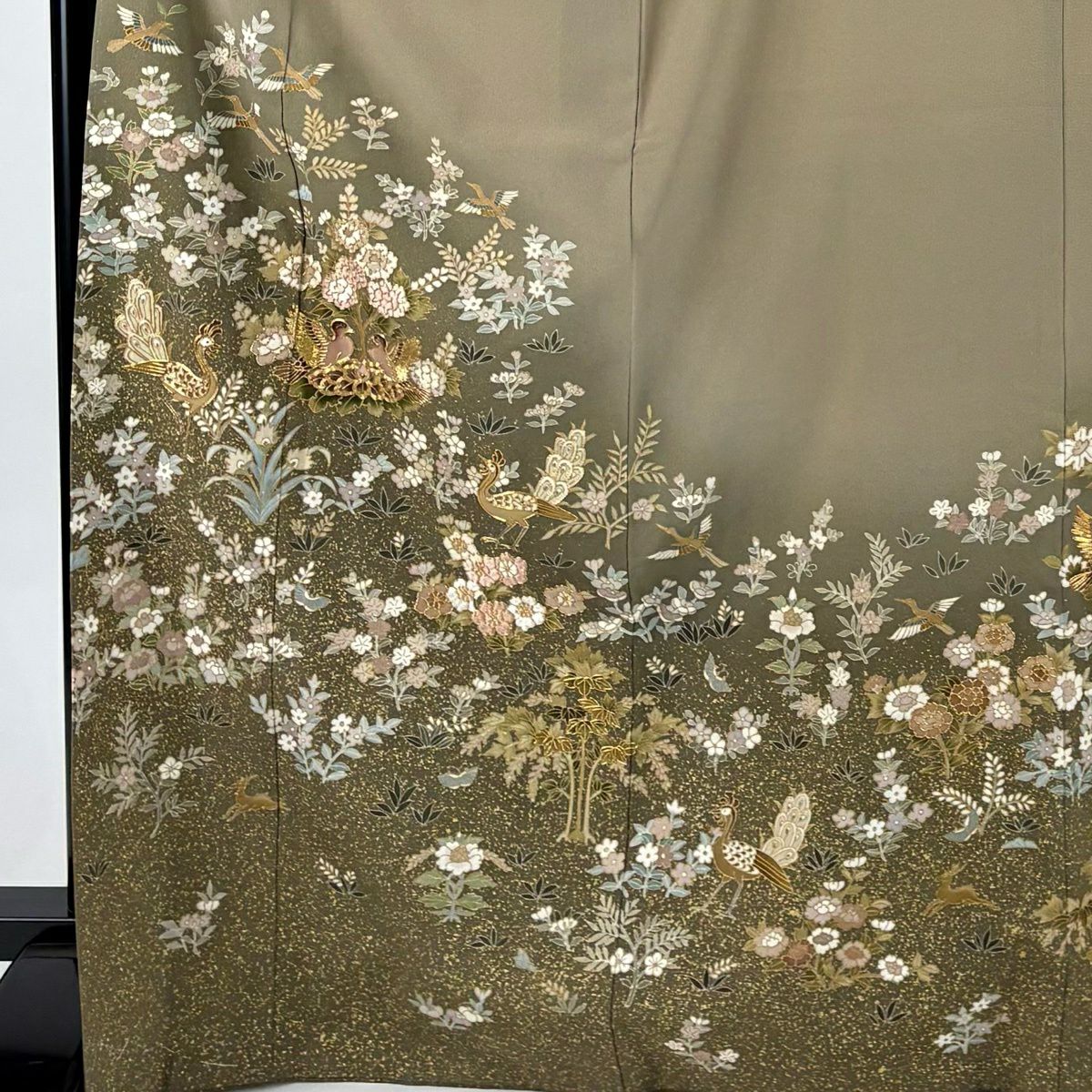 30%OFF 色留袖 身丈170.5cm 裄丈65.5cm M 袷 孔雀 草花 金糸 金彩 灰茶 正絹 秀品 三つ紋 K30